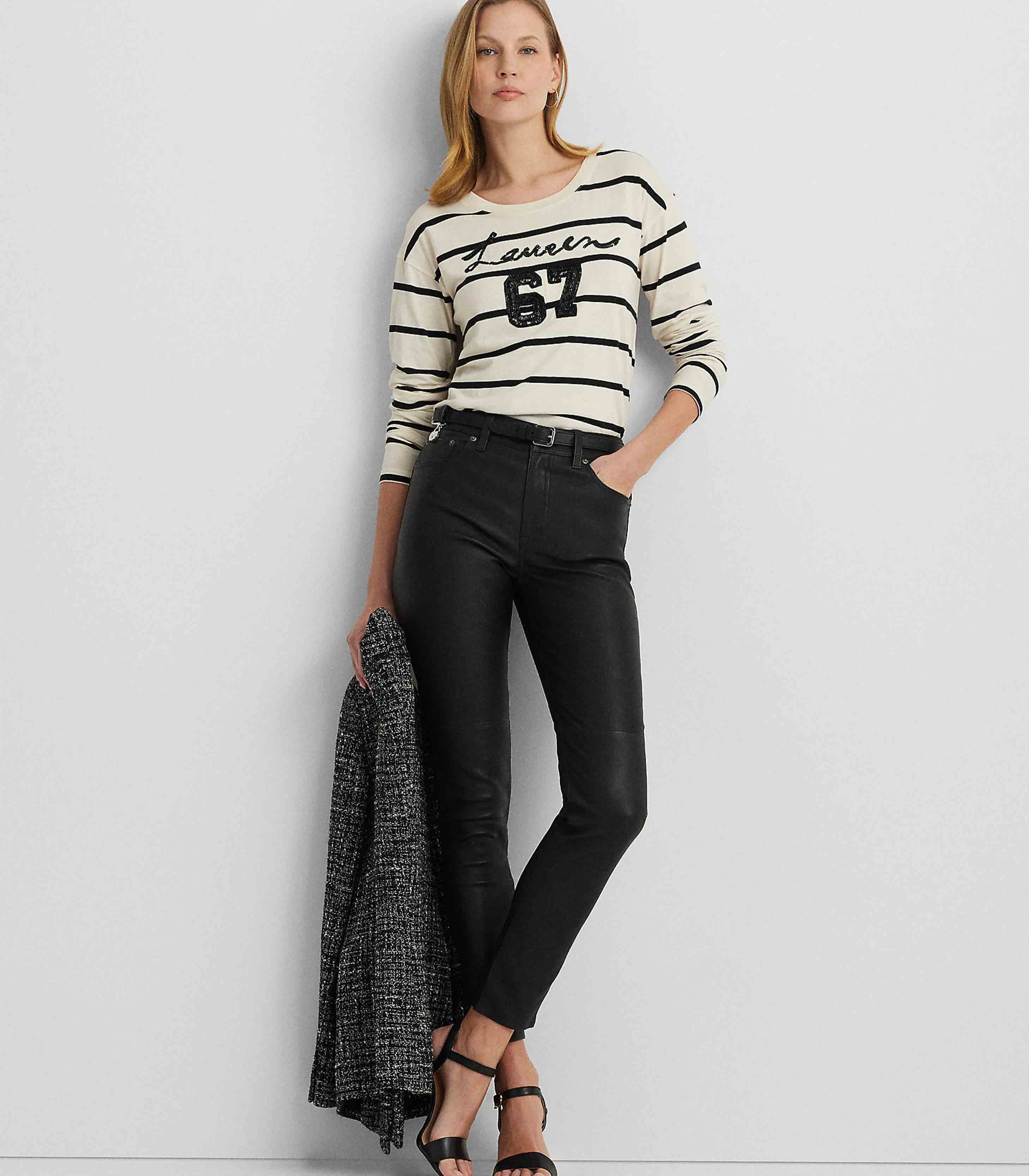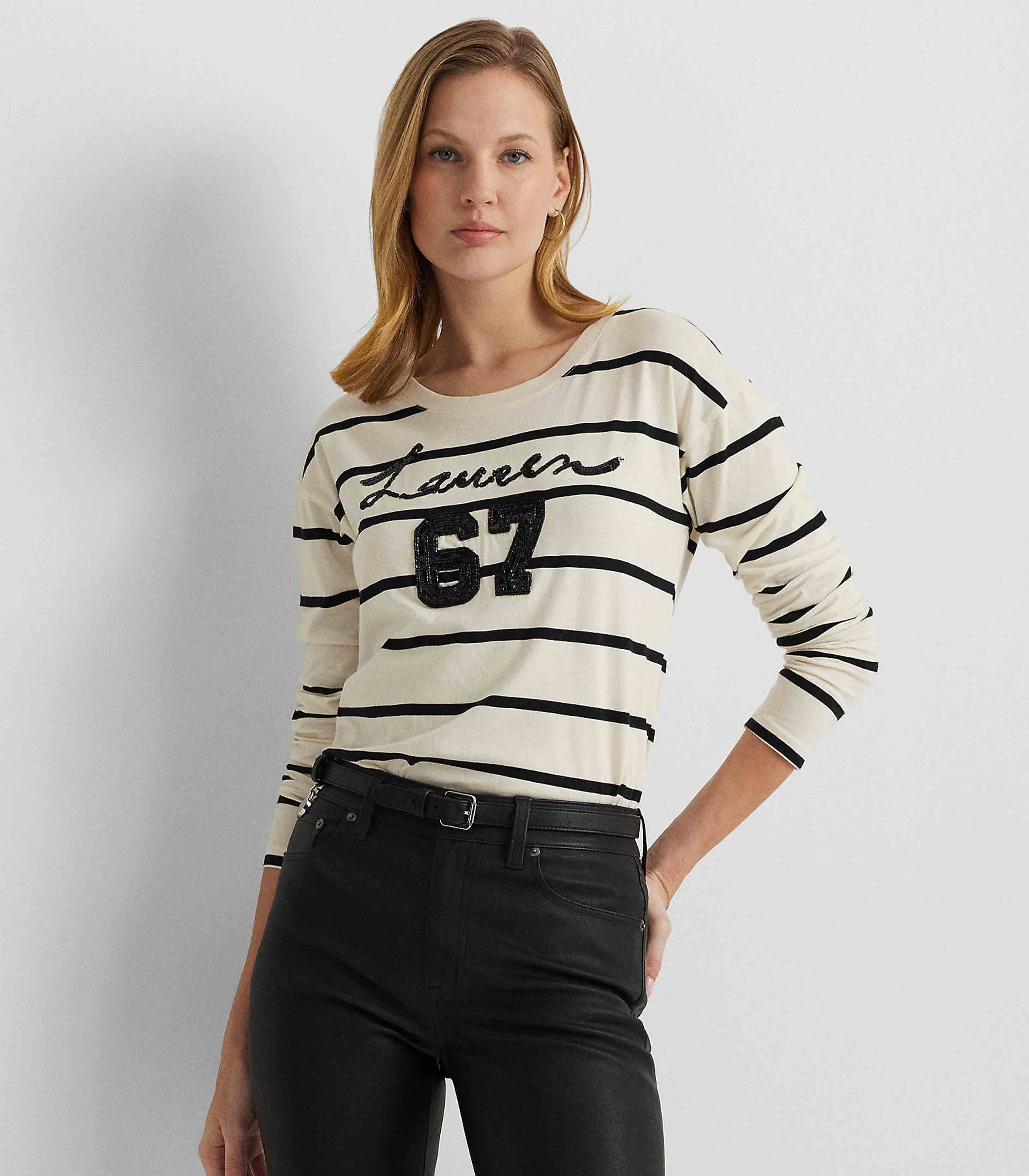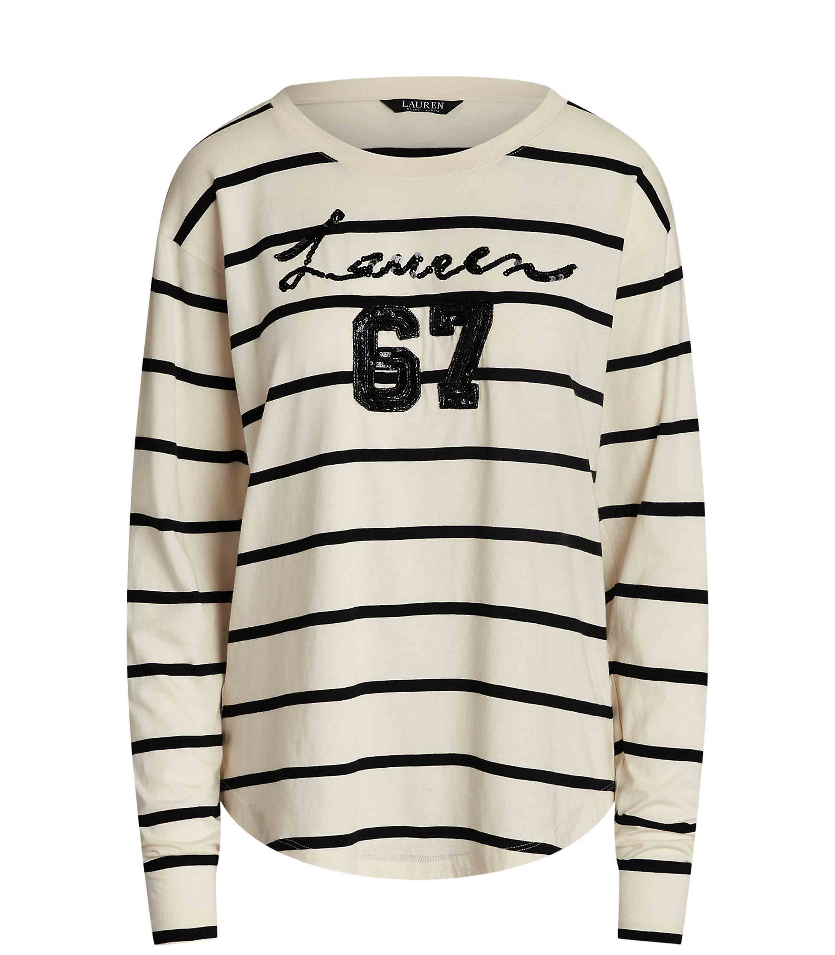 • Crafted with breathable cotton-blend jersey for a soft hand, this long-sleeve tee showcases yarn-dyed horizontal stripes and a sequined "Lauren 67" logo at the chest. Dropped shoulders and a relaxed fit lend to its comfortable feel.