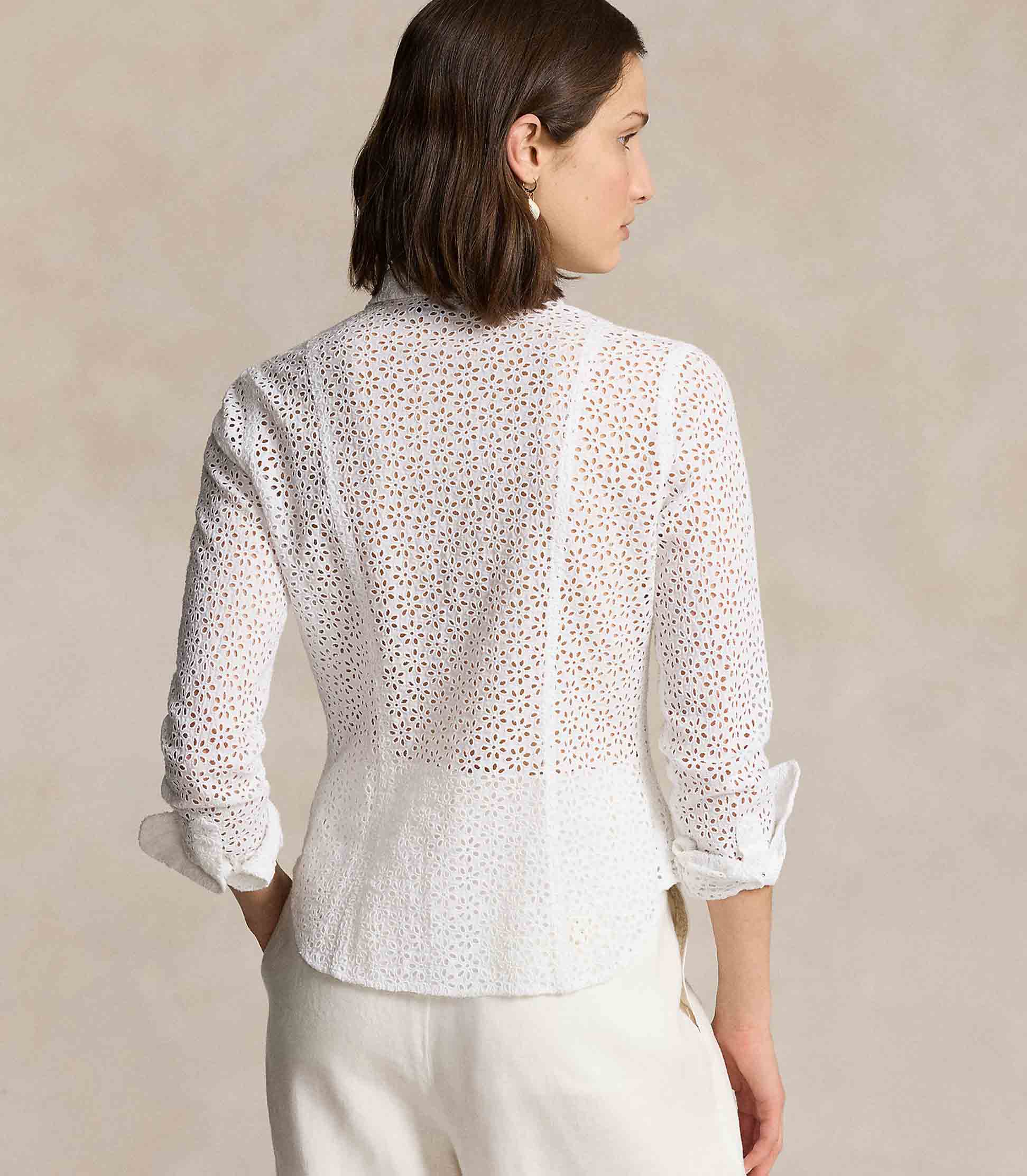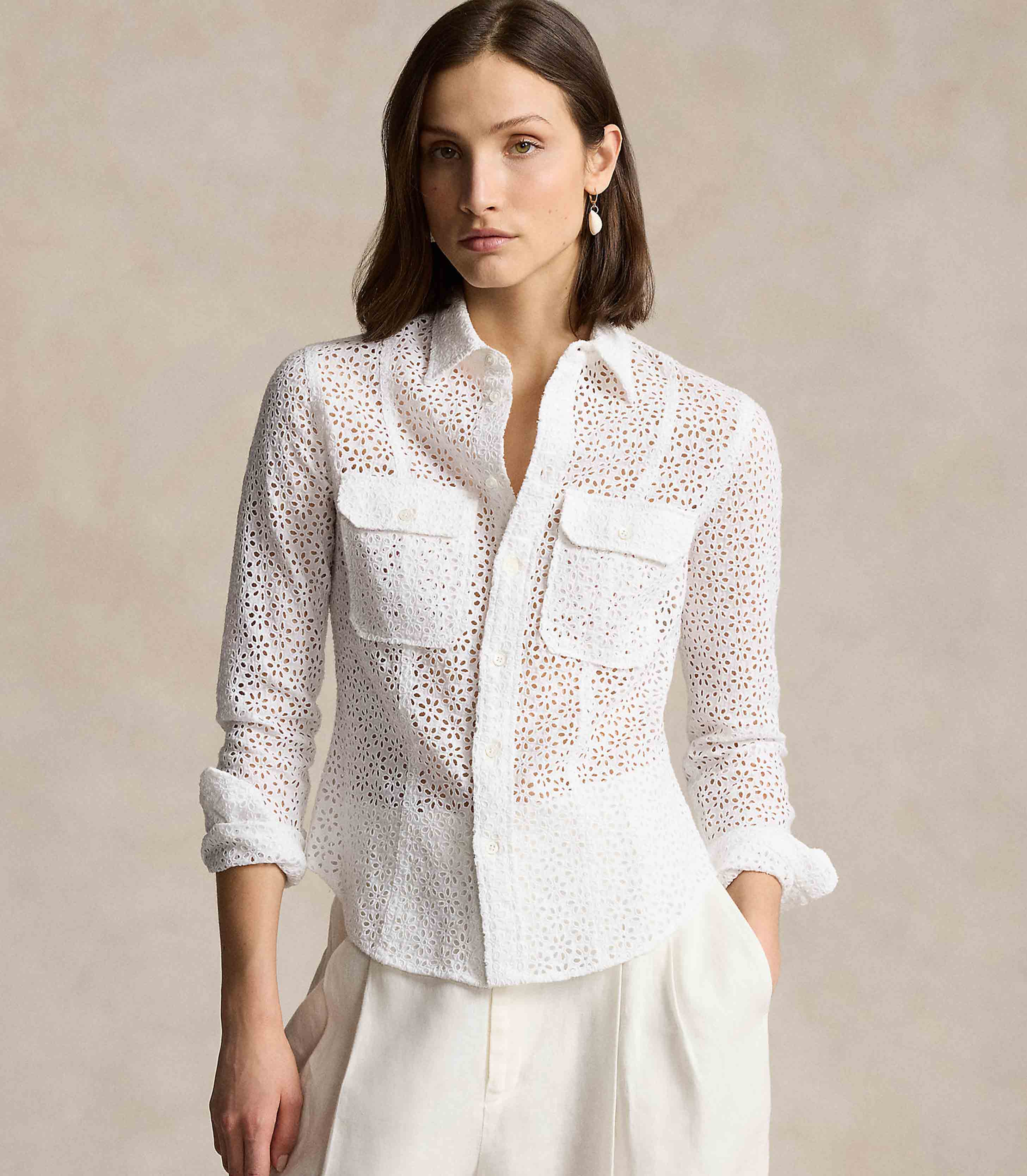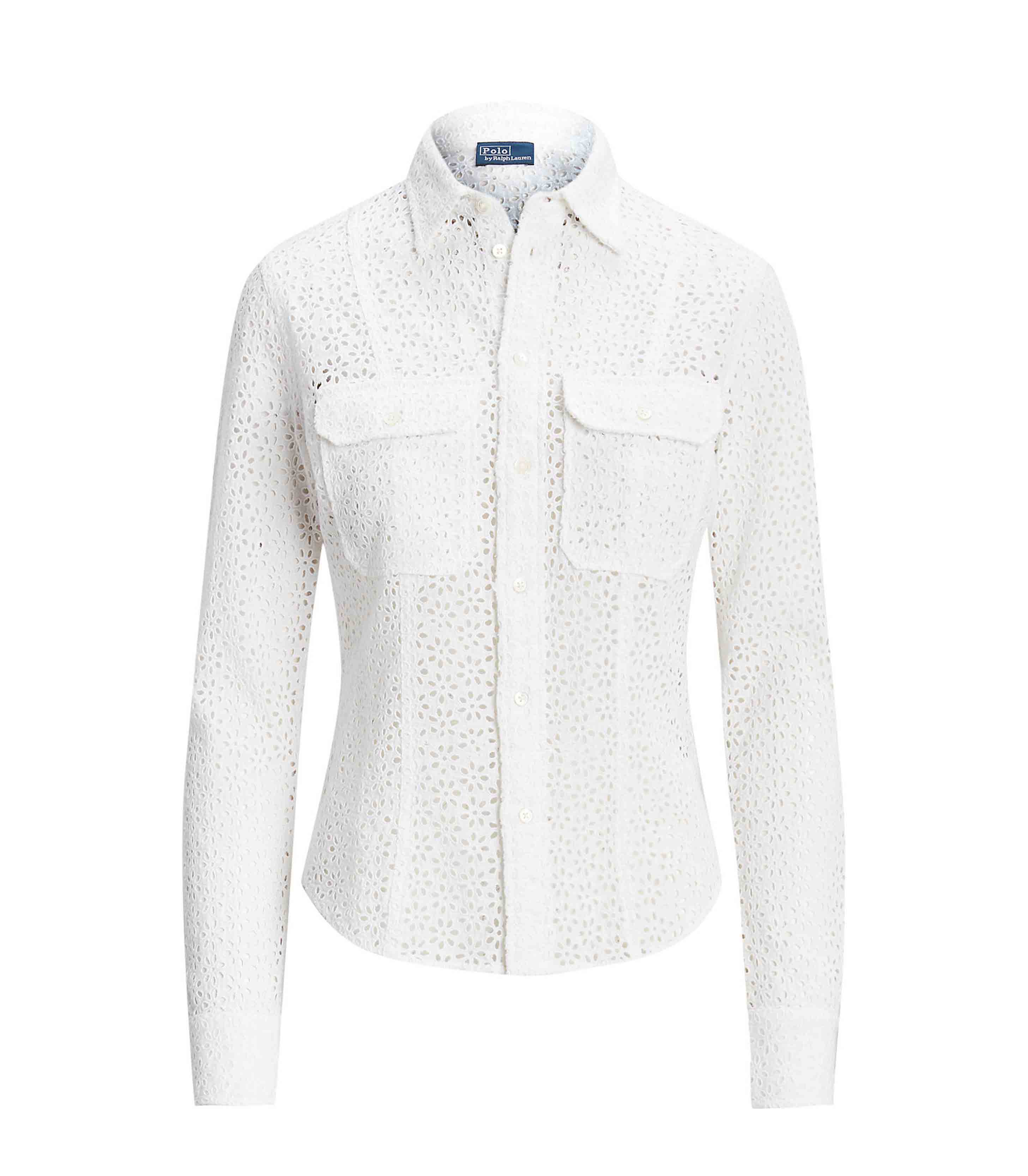 • The classic linen buttoned shirt is updated with romantic eyelet embroidery and utility-inspired patch pockets.