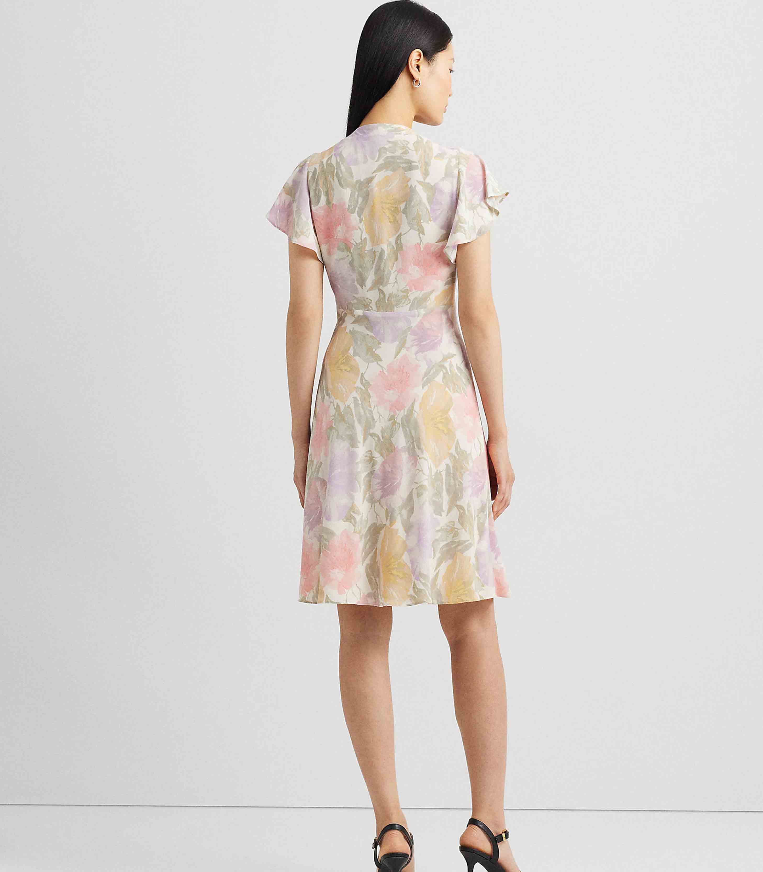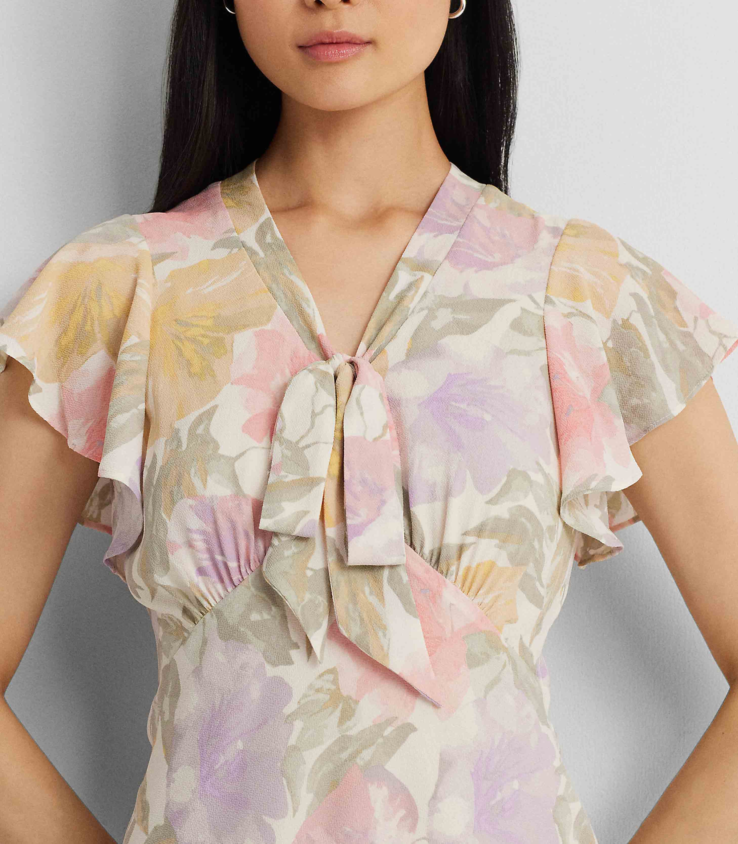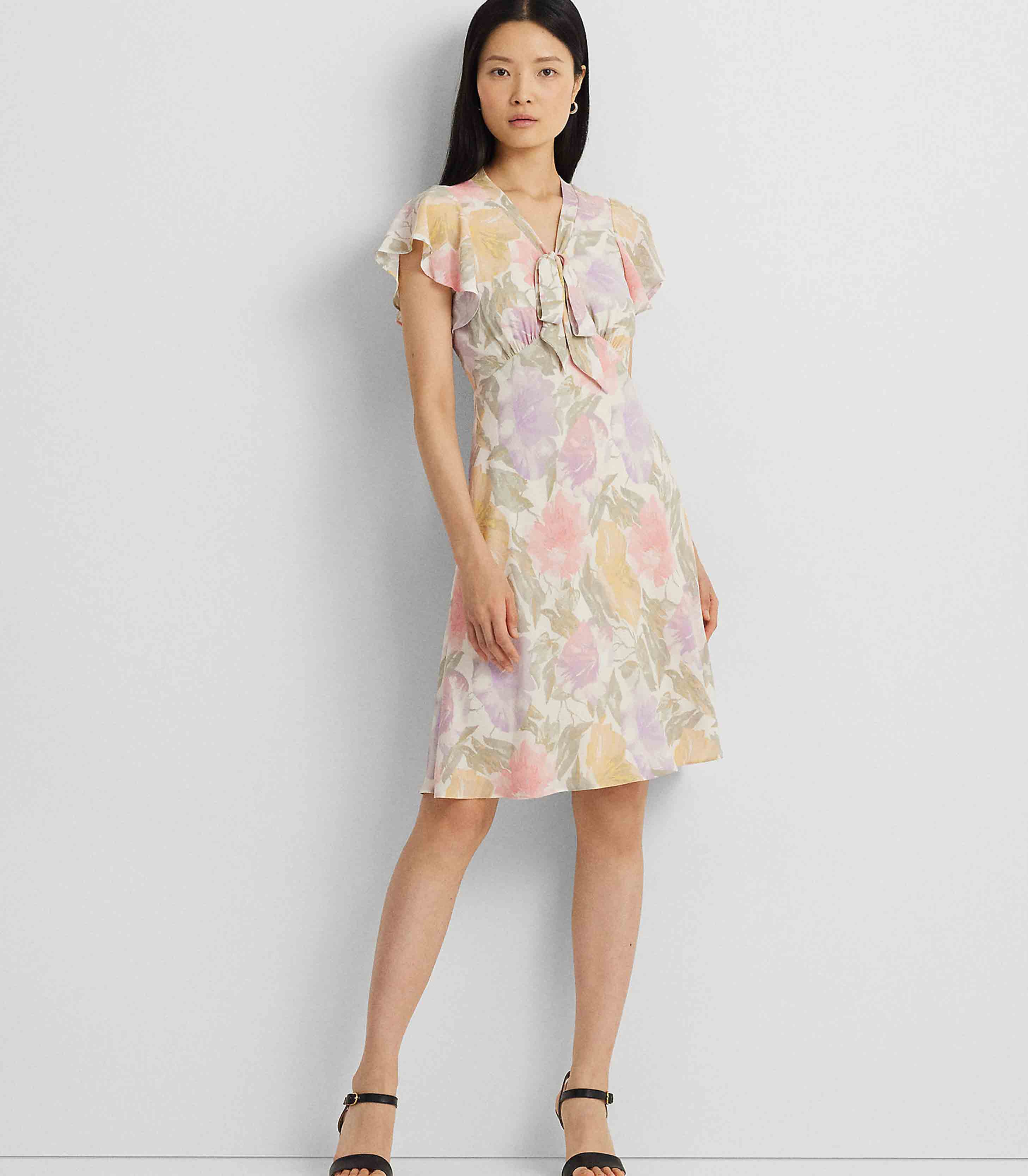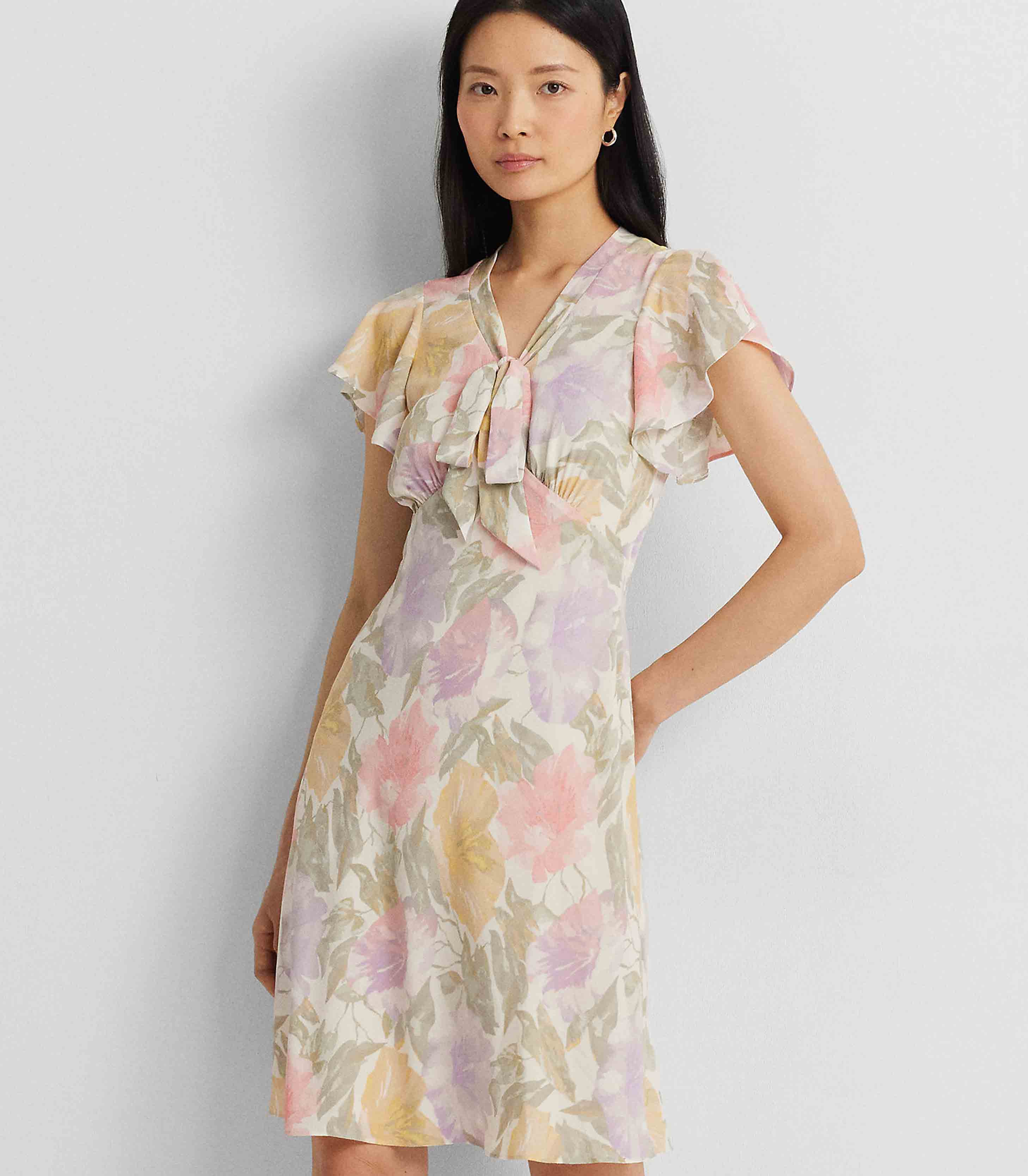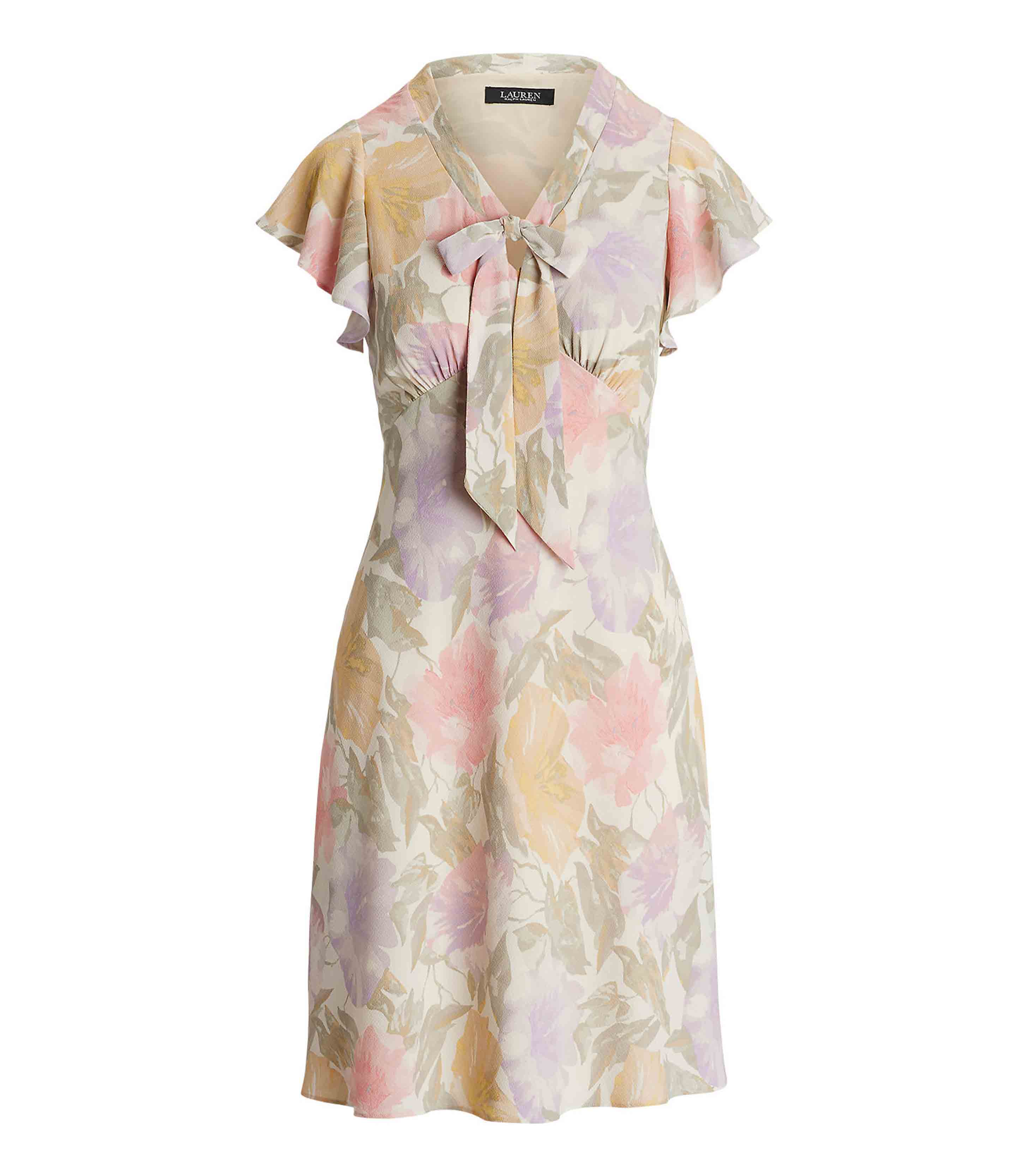• An empire seam and a tie-neck accent lend to the vintage-inspired character of this flutter-sleeve dress, which is crafted with bubble crepe for an airy look and feel. The season’s painterly floral motif—which is realized in the season’s pastel color palette—enhances its romantic charm.