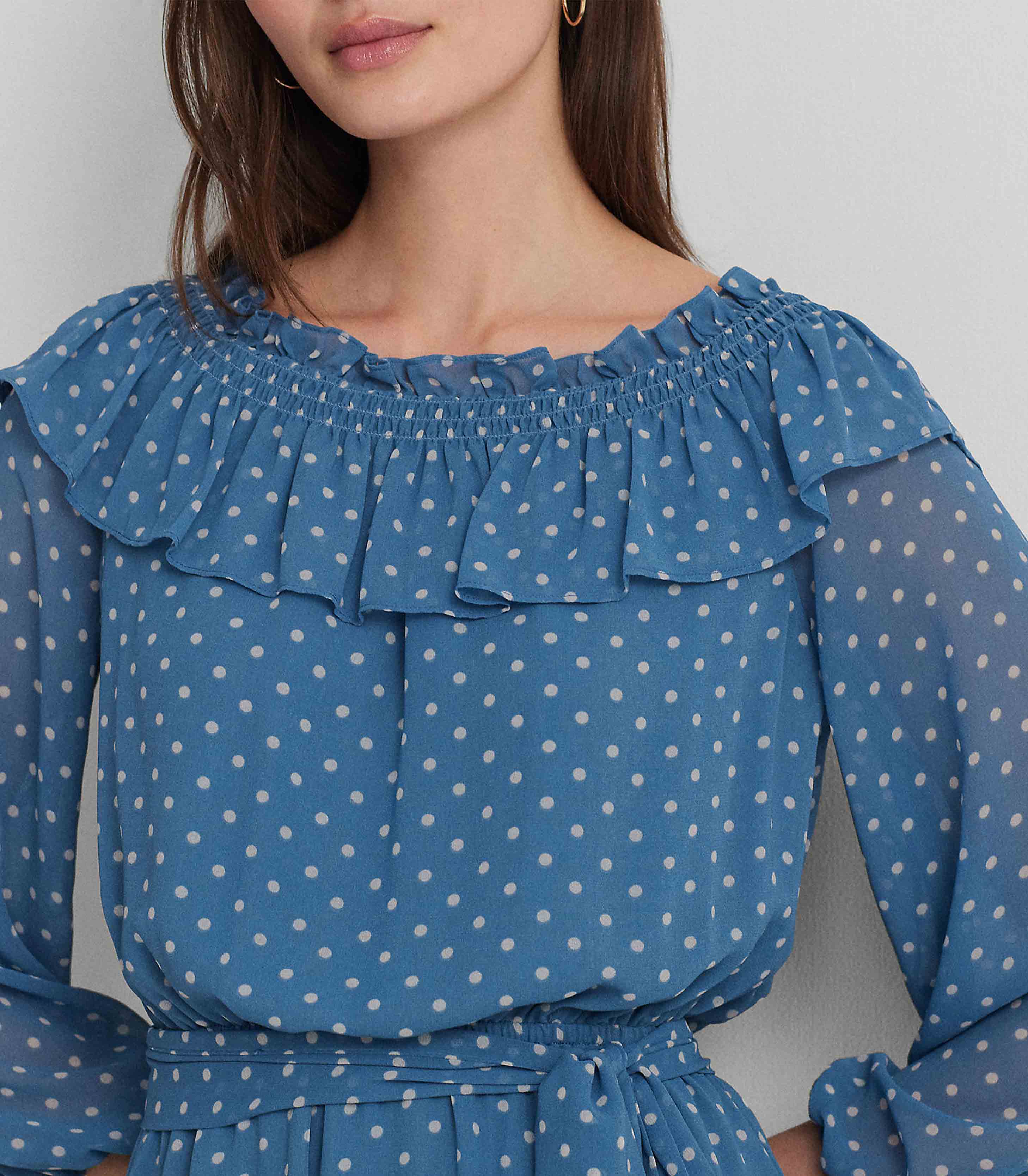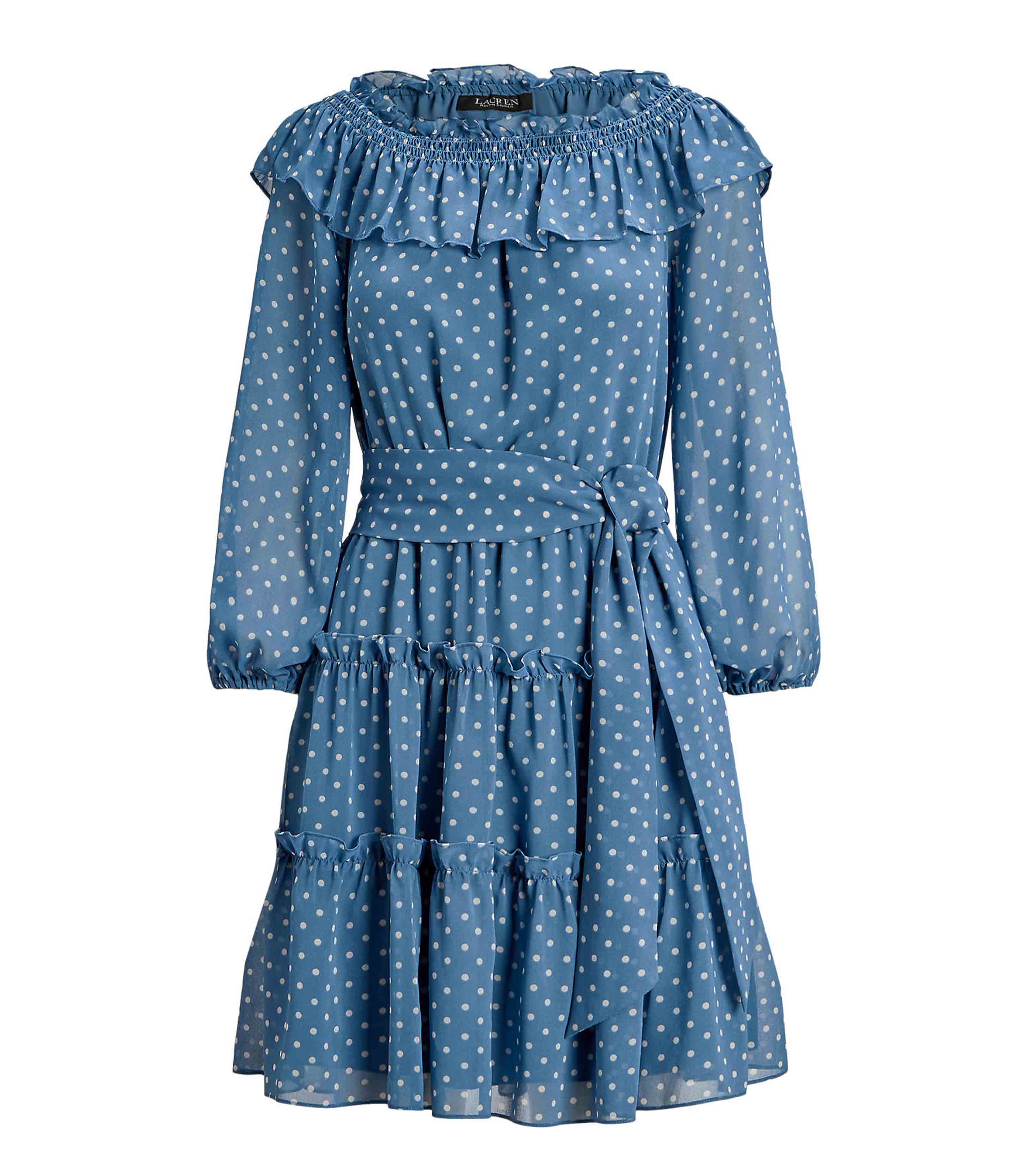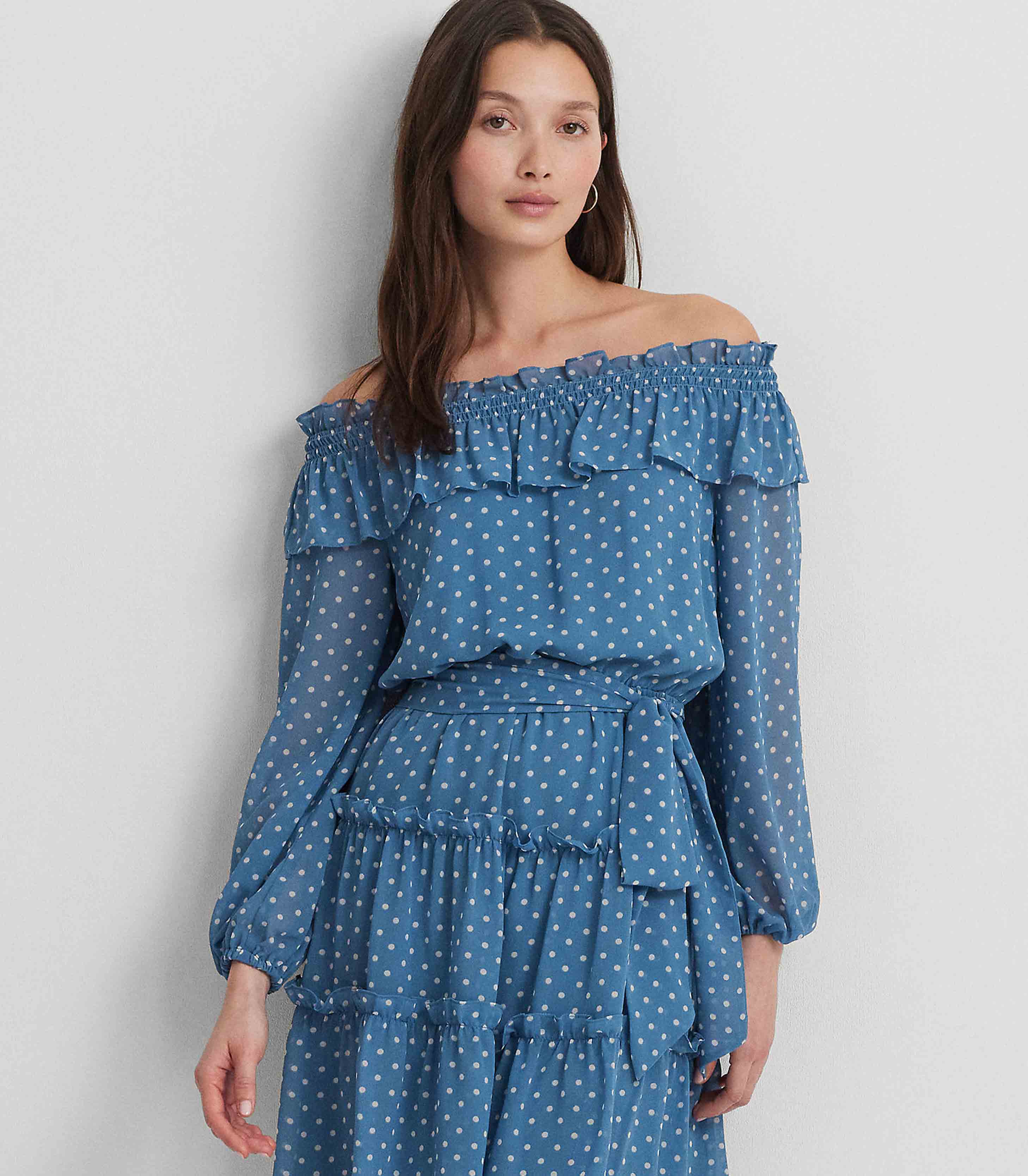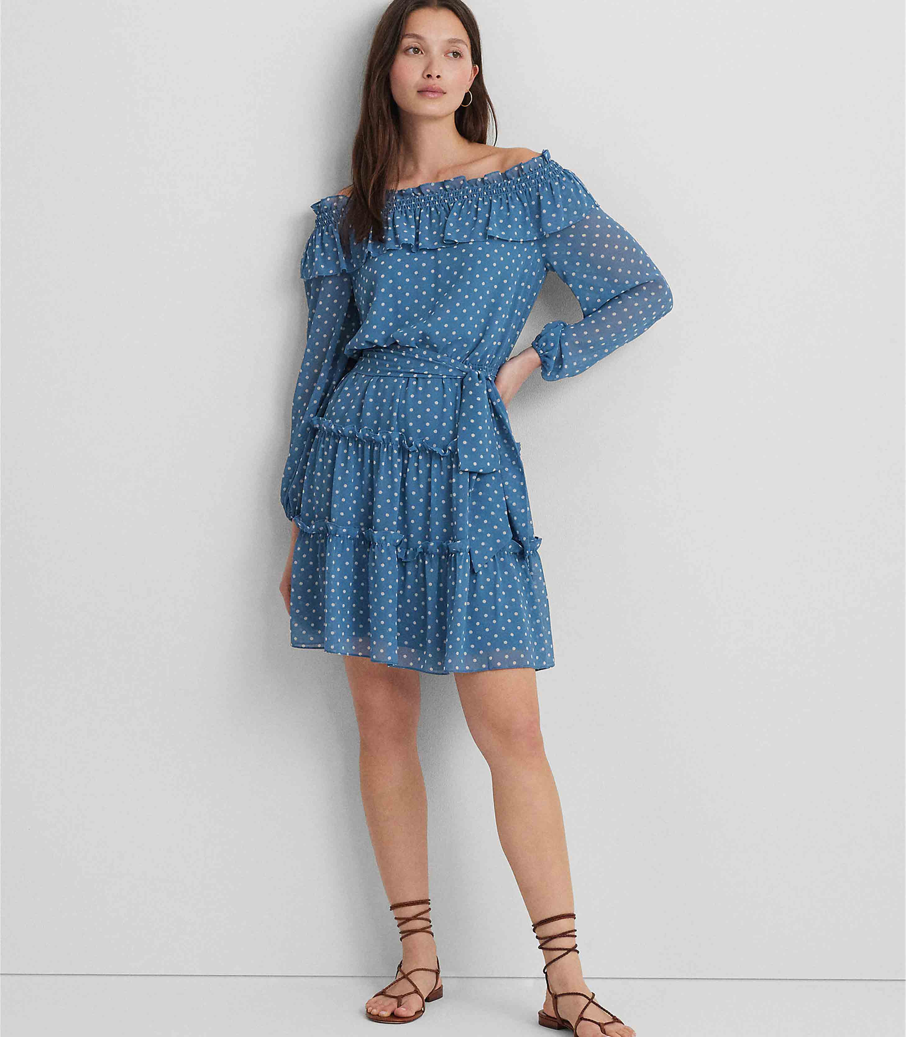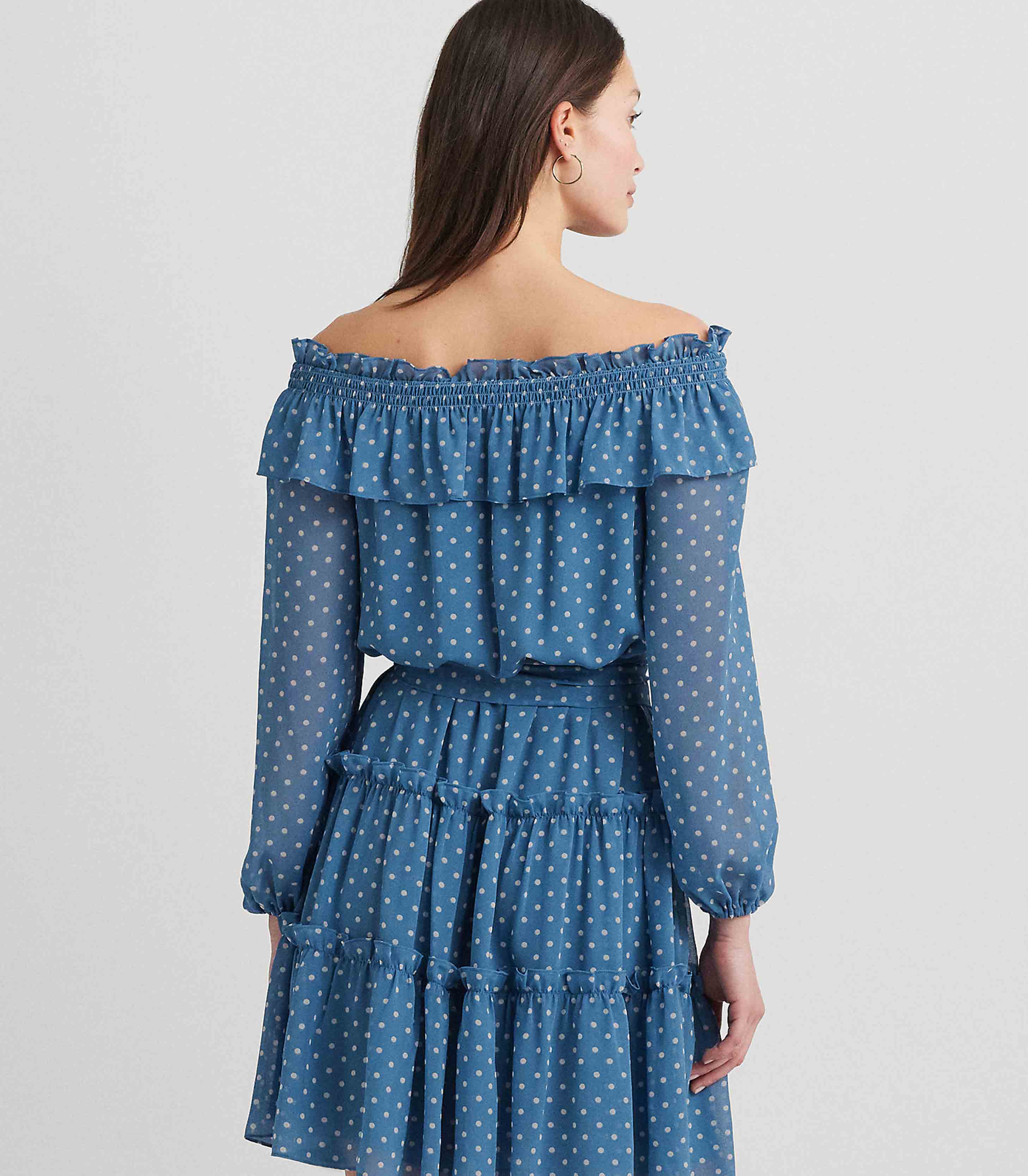 • This off-the-shoulder dress is designed with ruffle trim, a belted waist, and blouson sleeves. A polka-dot print lends to its charm, while a tiered skirt and airy crinkle georgette create graceful movement with each step.