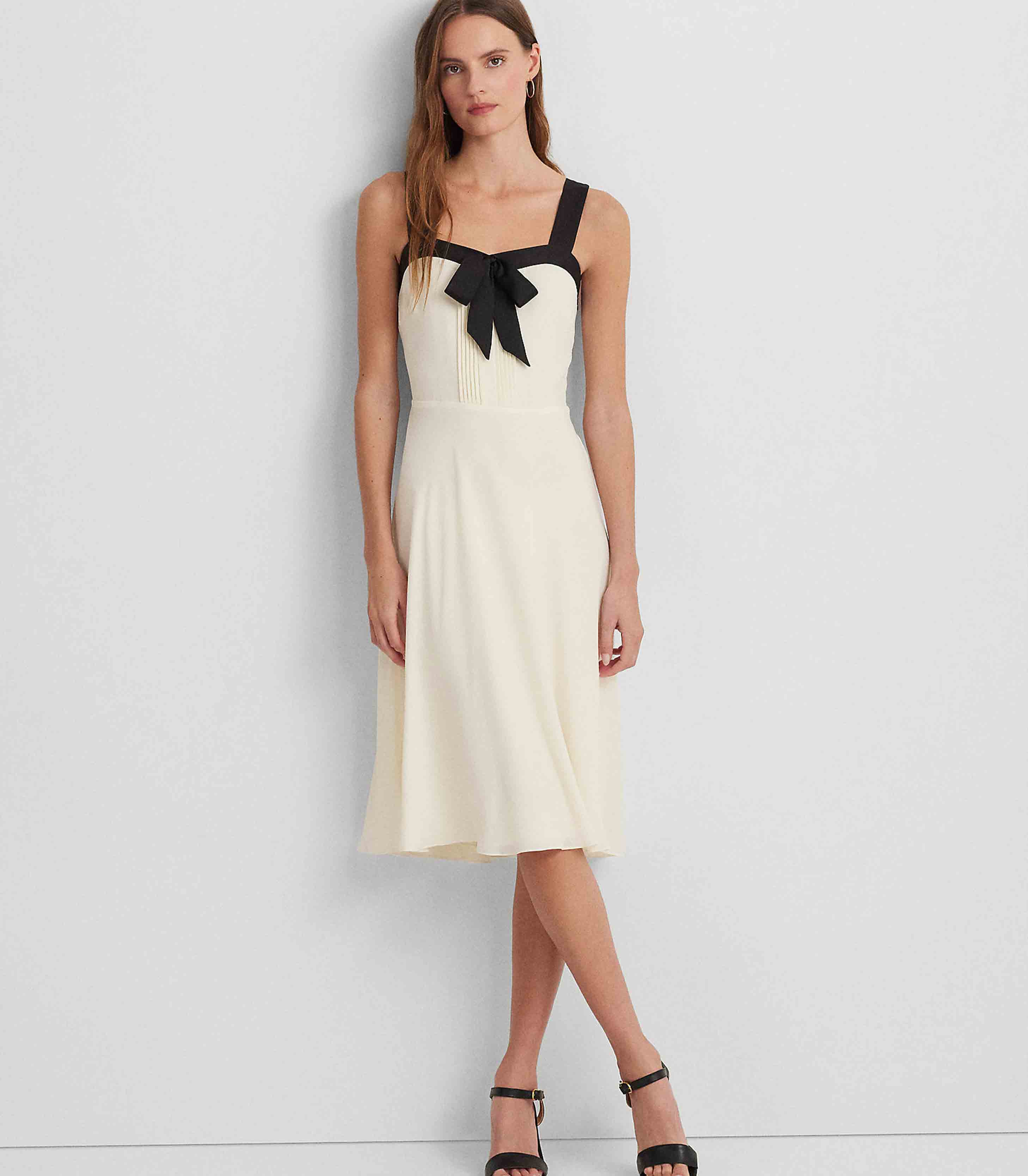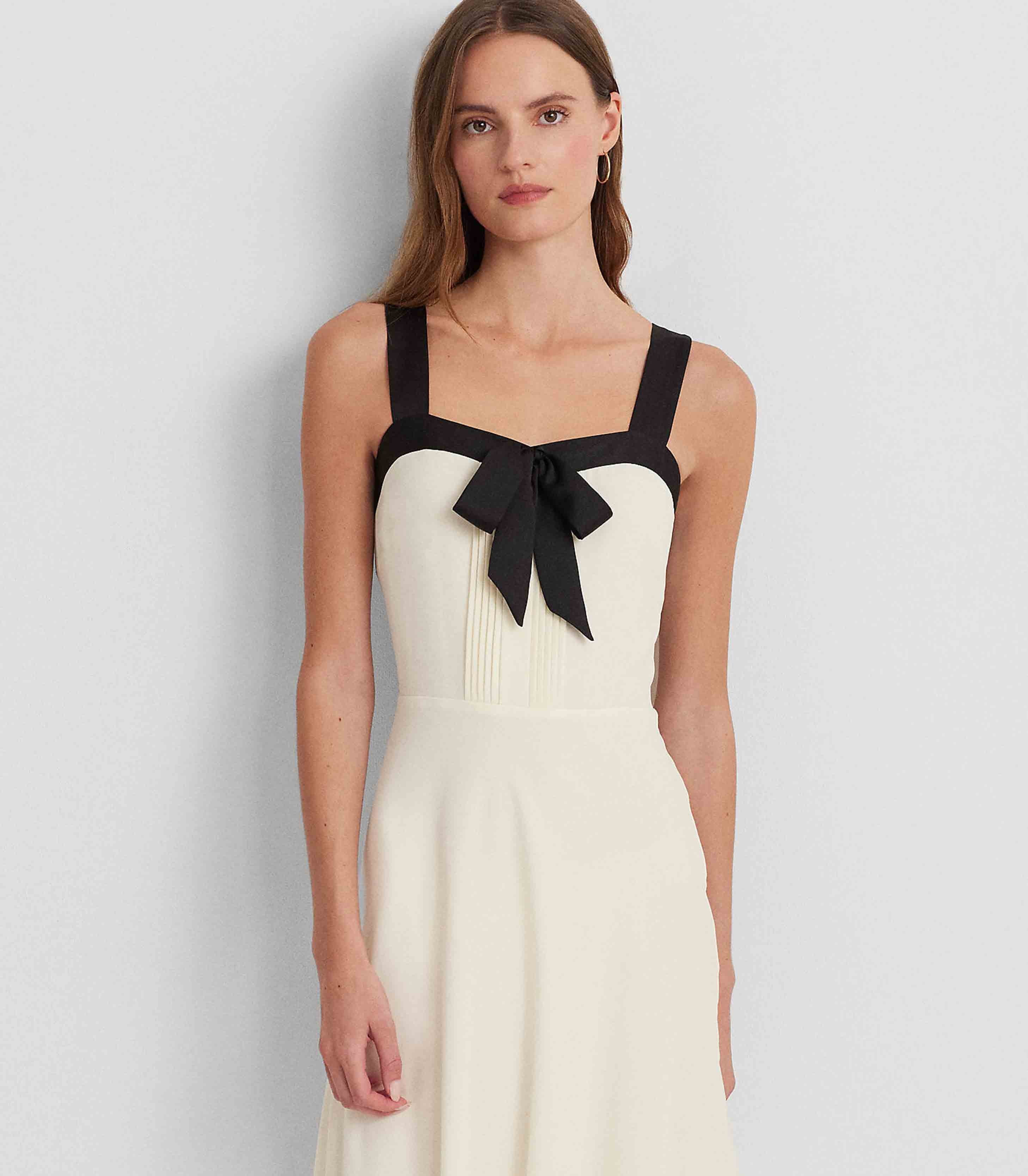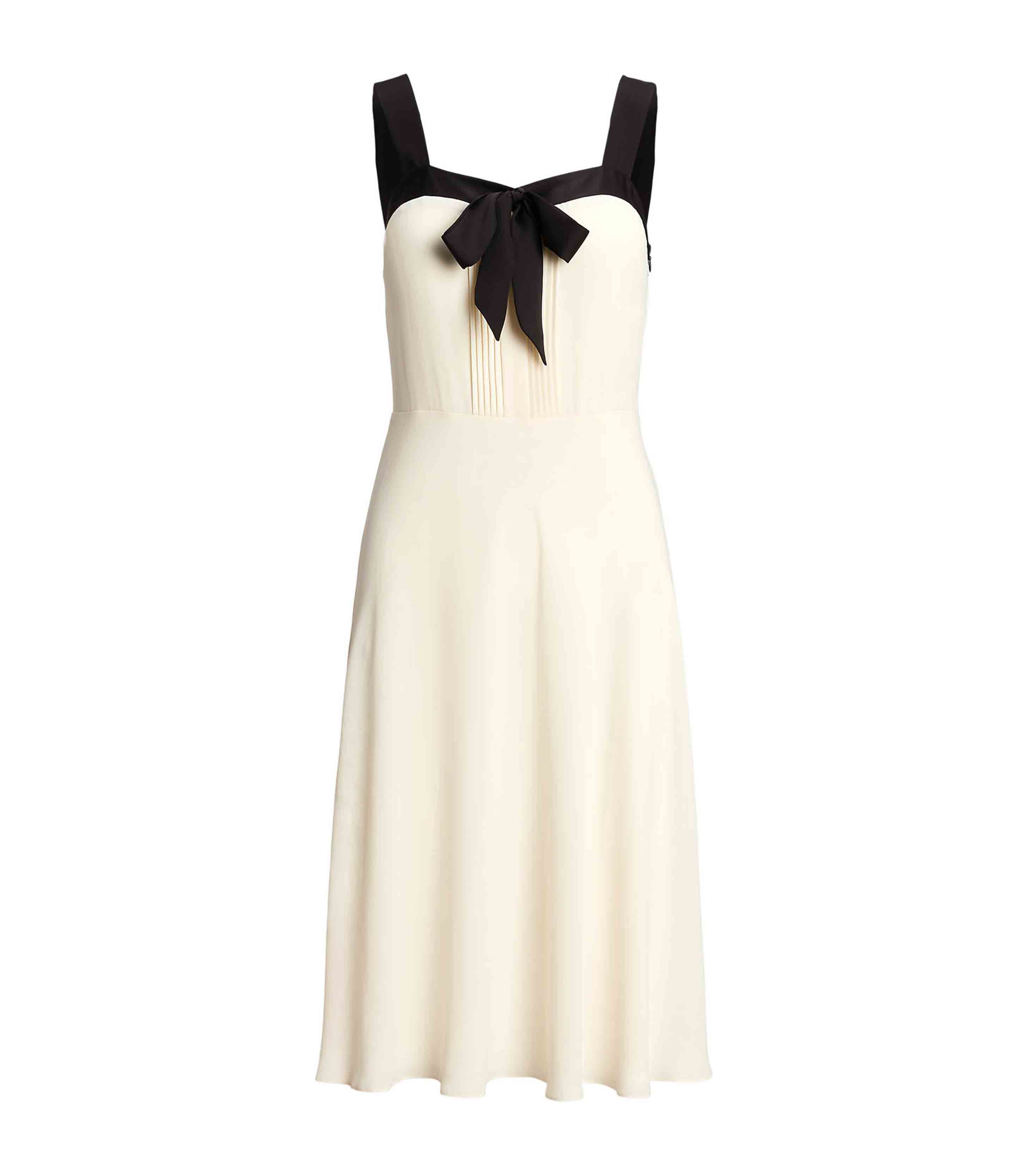 • Drawing inspiration from tuxedo shirts, this sleeveless dress is designed with pintucking at the front bodice and a lustrous satin bow at the neckline. It’s crafted with airy georgette for a fluid drape.