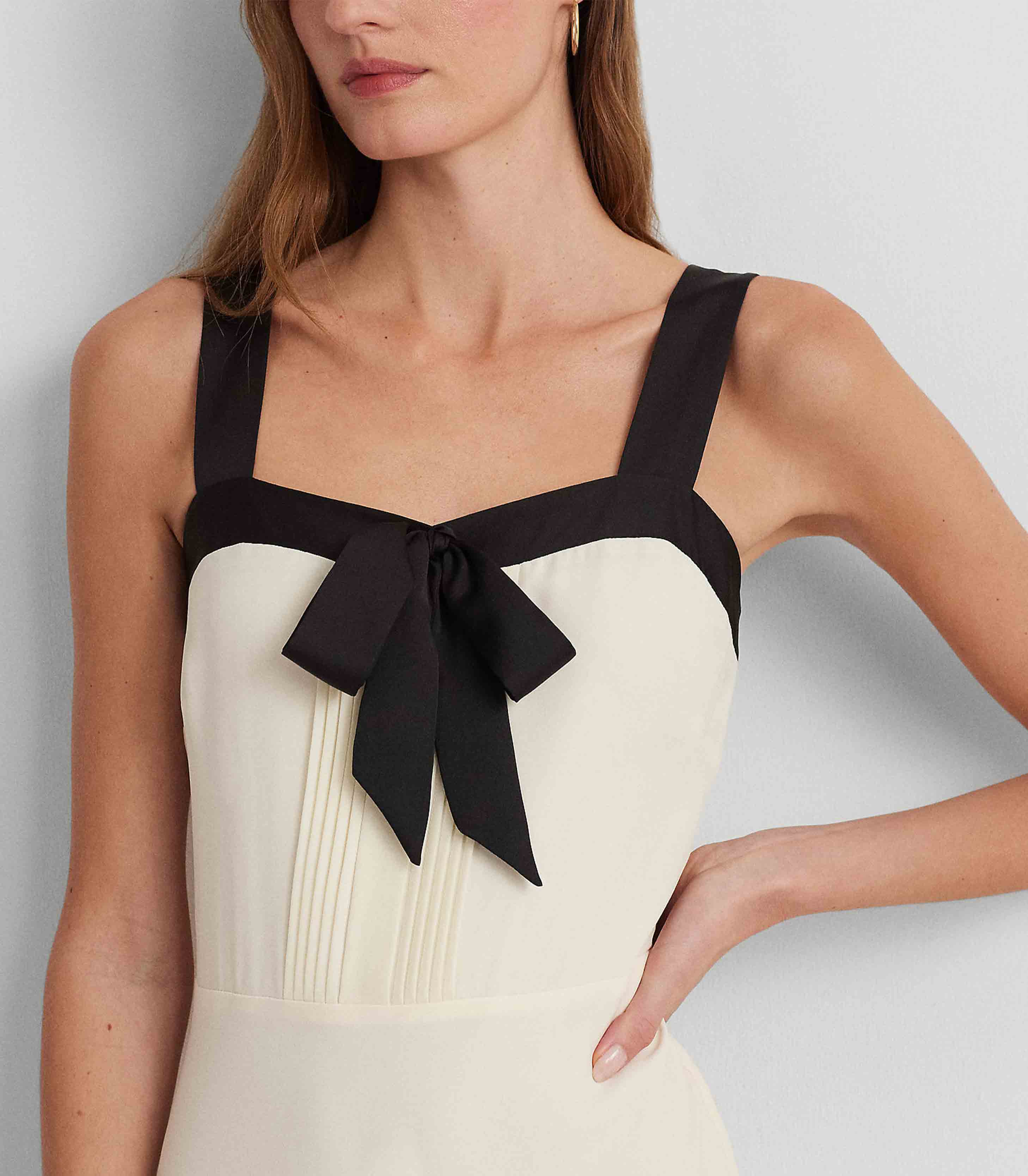 • Satin-trimmed square neckline. Satin self-ties form a bow at the center front of the neck. Concealed left-side-seam zipper with a hook-and-eye closure.
