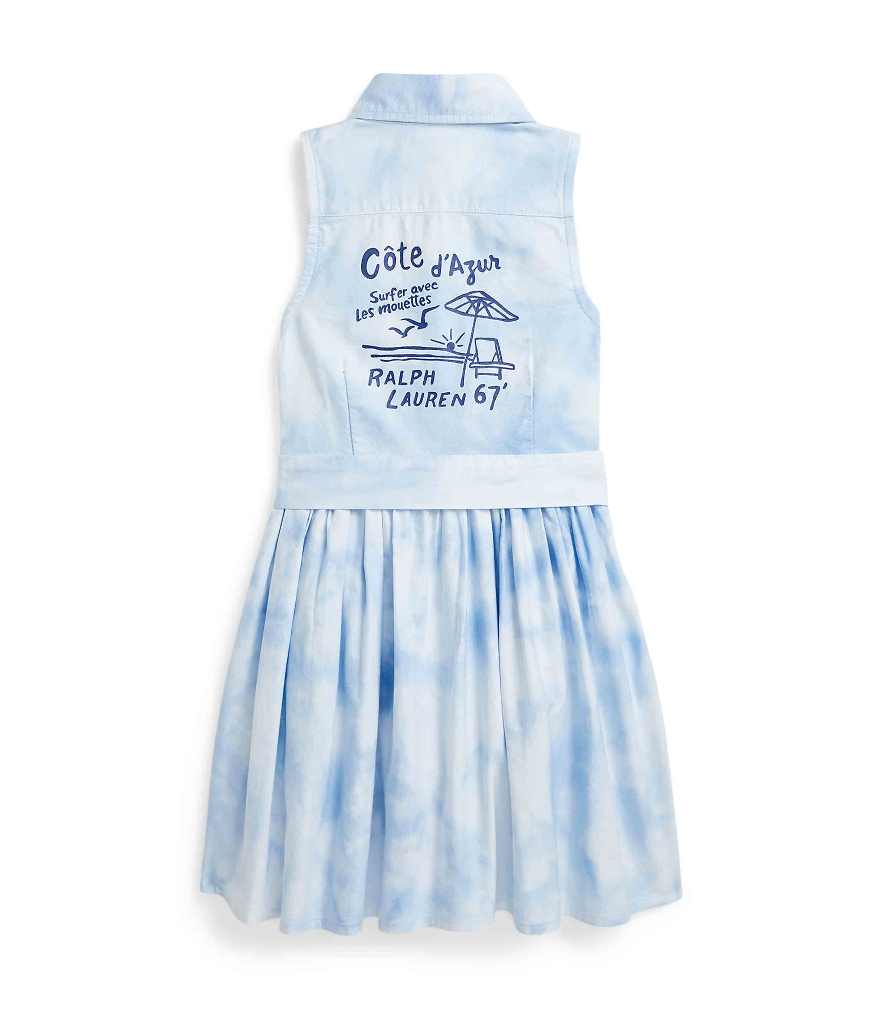 • Button-down point collar. Buttoned placket. Shirred waist. Darts at the front and back waist. Side on-seam pockets. “Côte d’Azur,“ “Ralph Lauren 67,” and a beach screen-printed at the center back.
