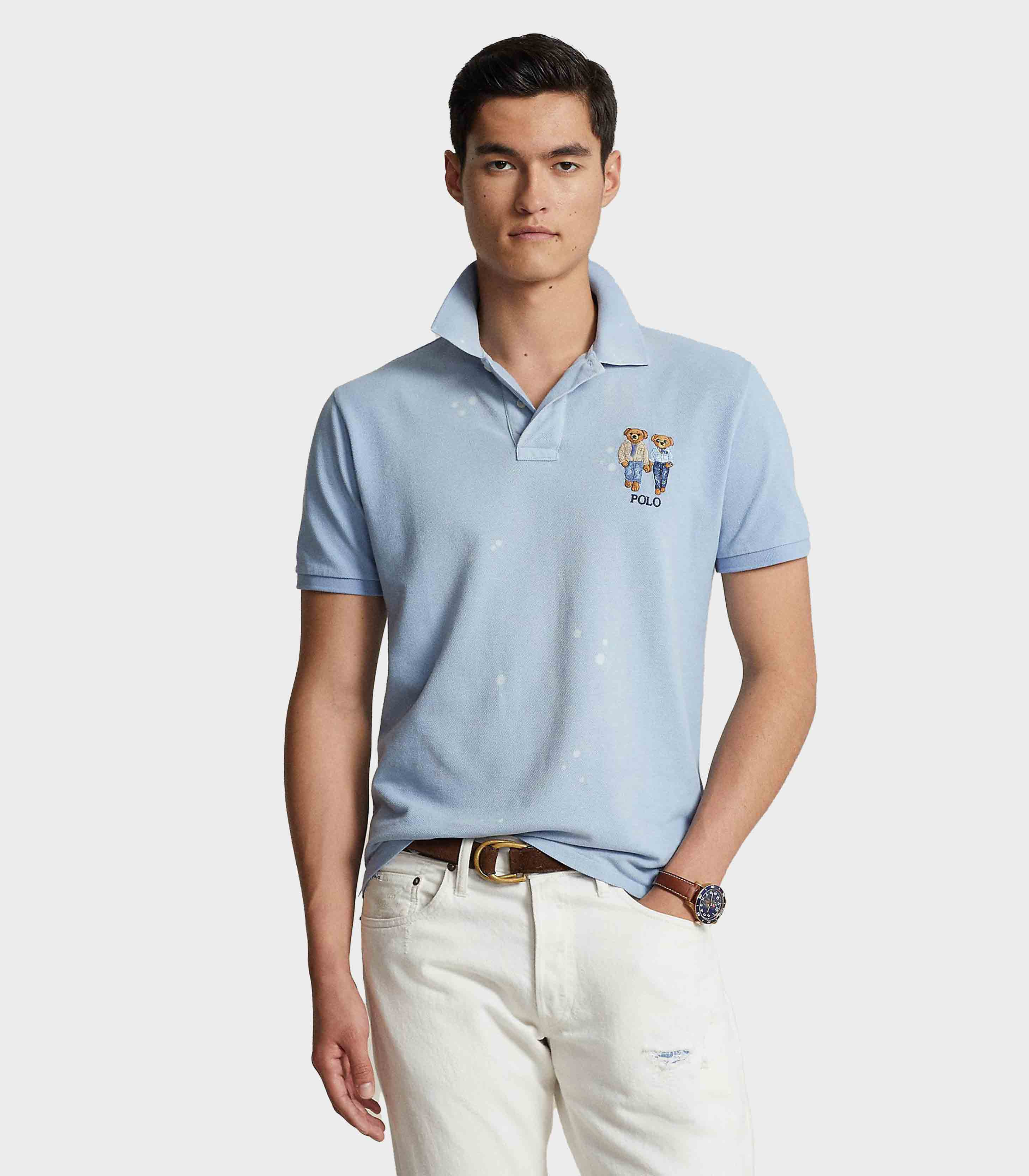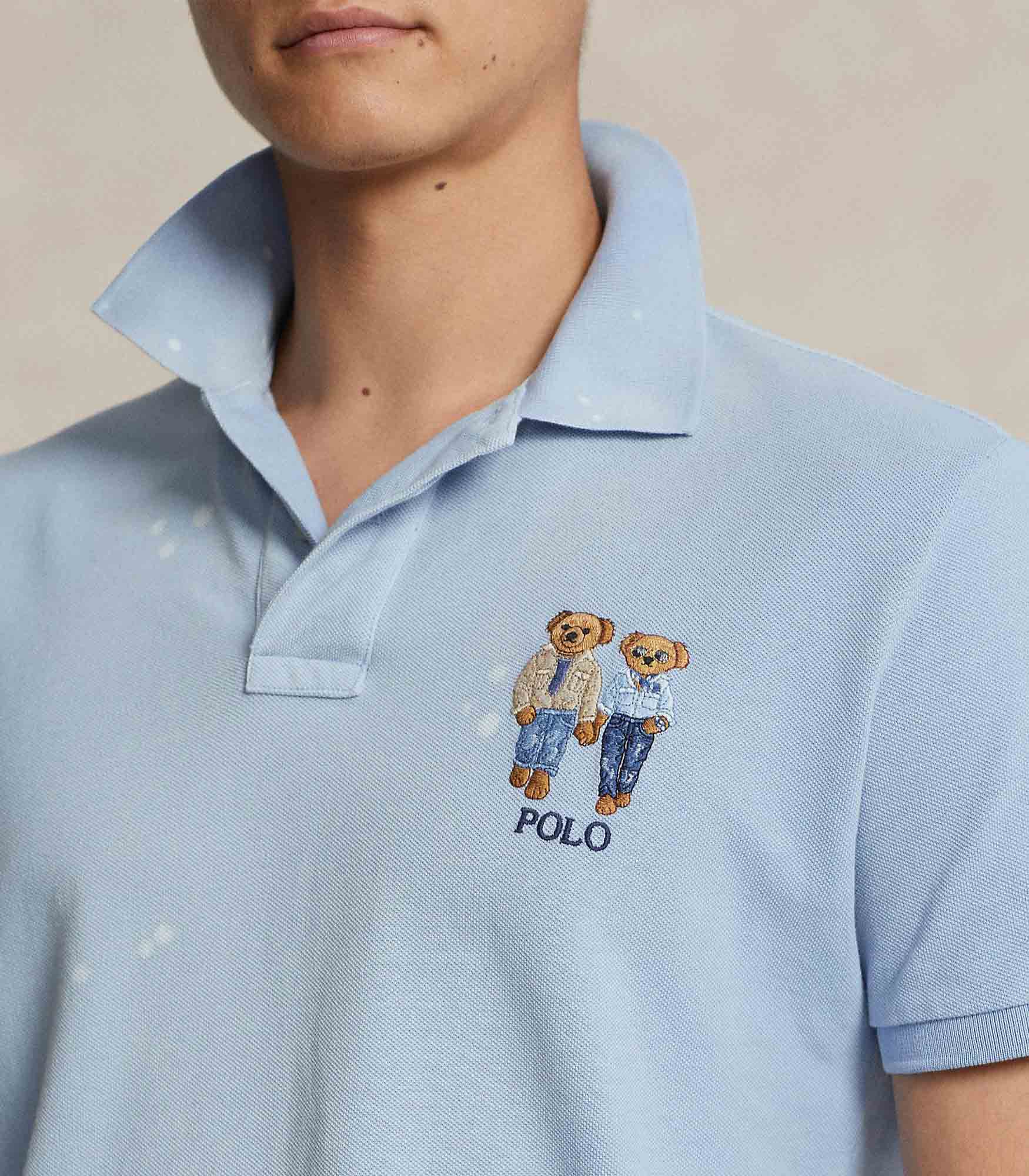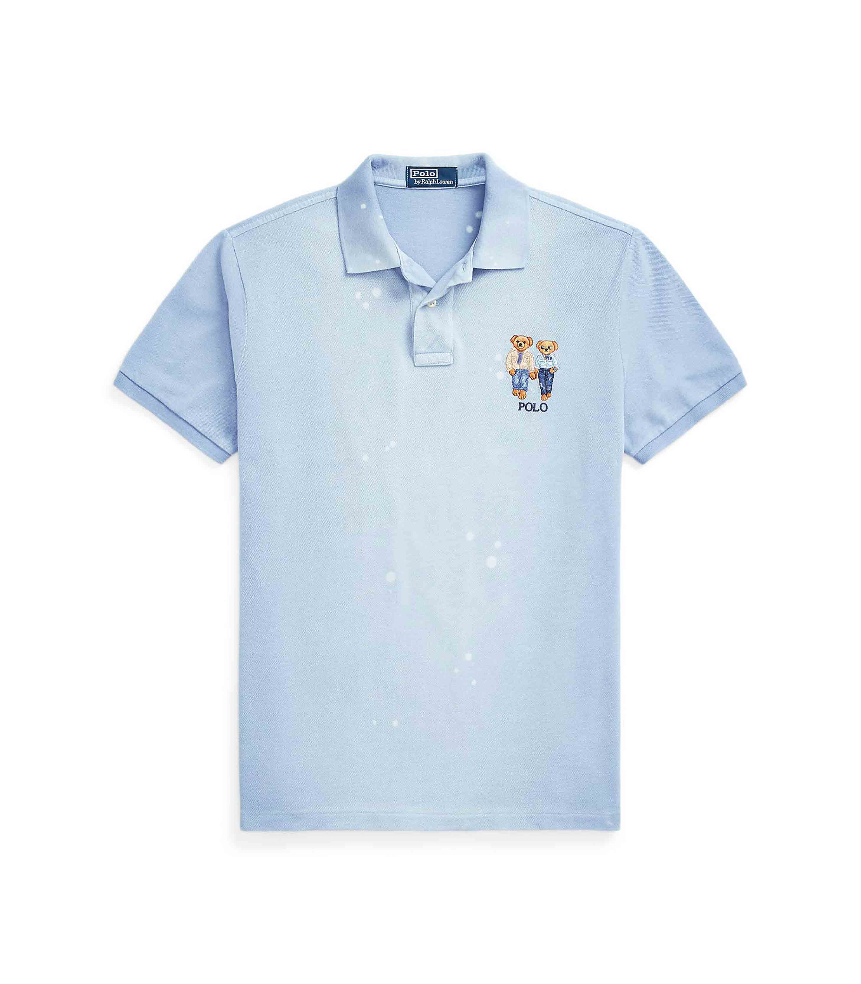 • An American style standard since 1972, the Polo shirt has been imitated but never matched. Over the decades, Ralph Lauren has reimagined his signature style in a wide array of colors and fits, yet all retain the quality and attention to detail of the iconic original. This garment-dyed mesh version features two bears holding hands. Inspired by an iconic image of Mr. and Mrs. Lauren walking along the shores of Montauk, NY in 1985, the bears playfully embody the love, unity, and timeless ease reflected in the photograph of the couple.