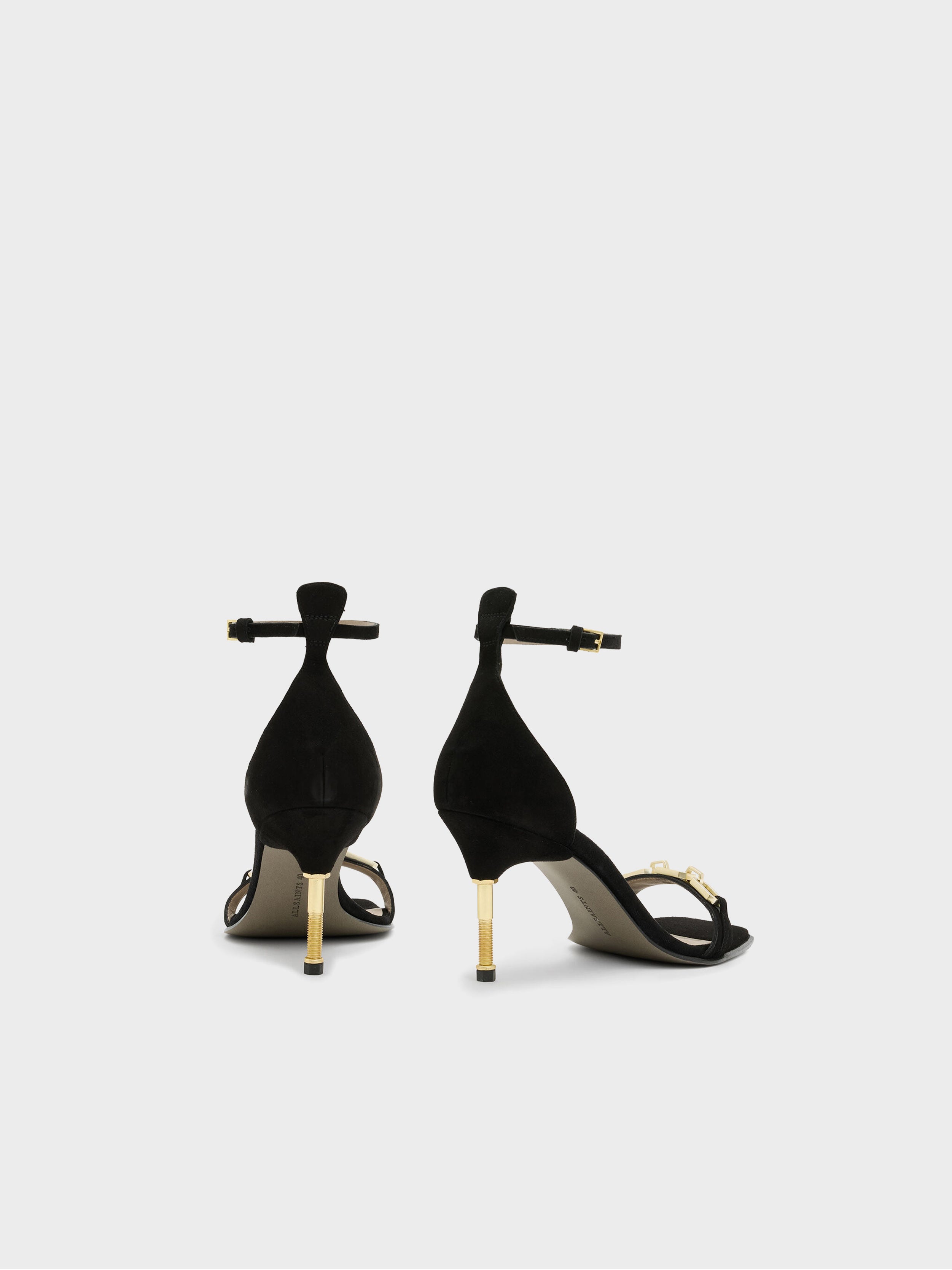 • The Bridget is the finishing touch. These new season heeled sandals are expertly crafted from leather to a square toe silhouette. This classic shape features signature AllSaints additions including our screw heel and hexagon chain toe strap. It's a new take and we're here for it - match this statement shoe with our refined tailoring.