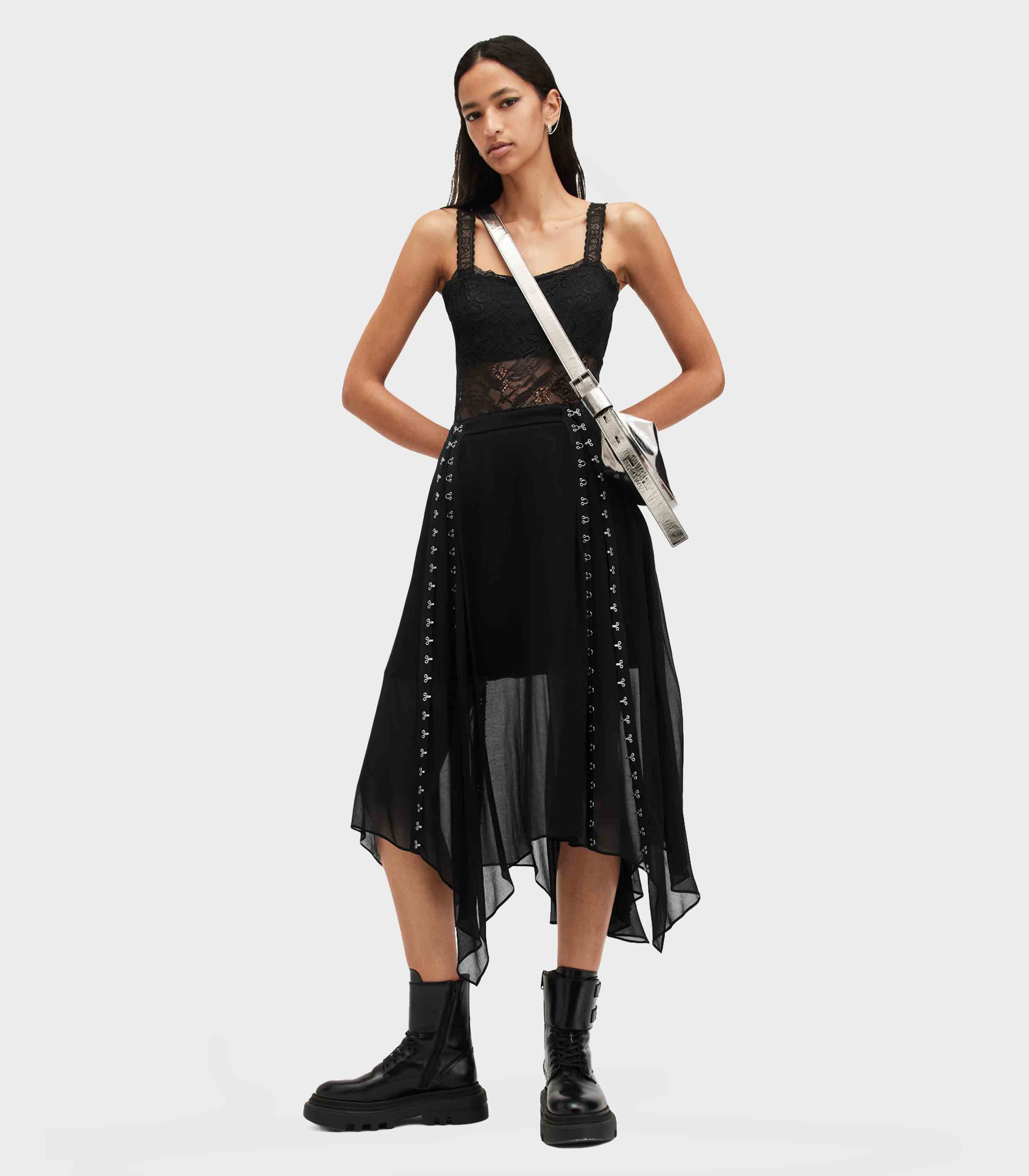 • The Luna Skirt is so AllSaints. This style features a delicate sheer base, signature hardware and an asymmetric hem – it's all of our favourite things combined. The lightweight fabric is expertly crafted to a flattering midi-length silhouette.