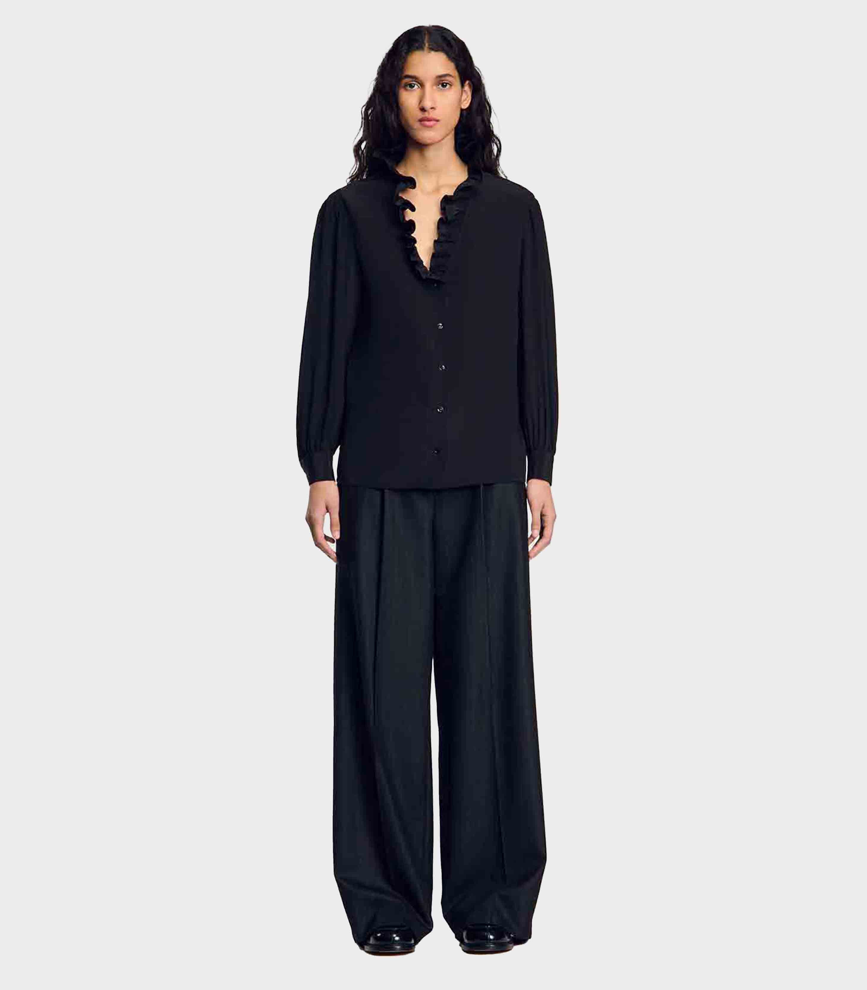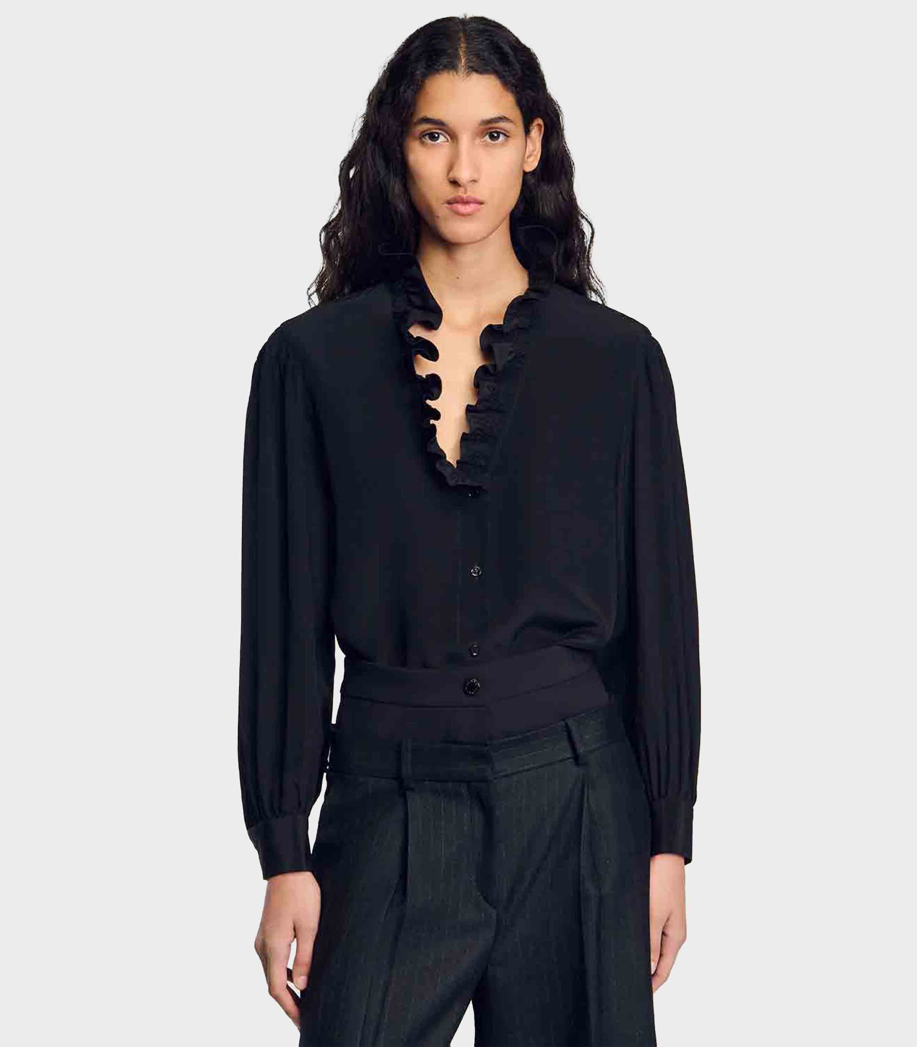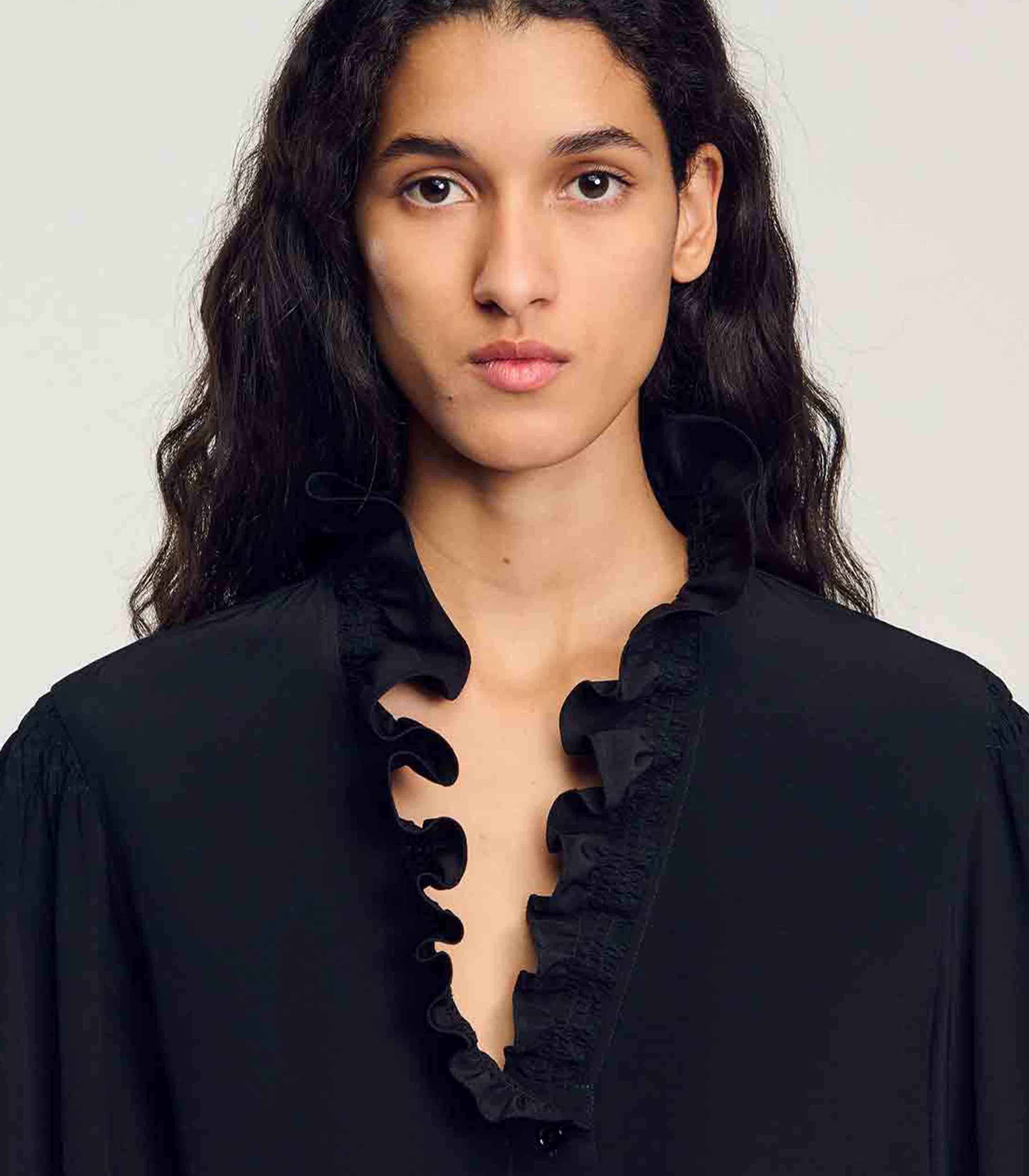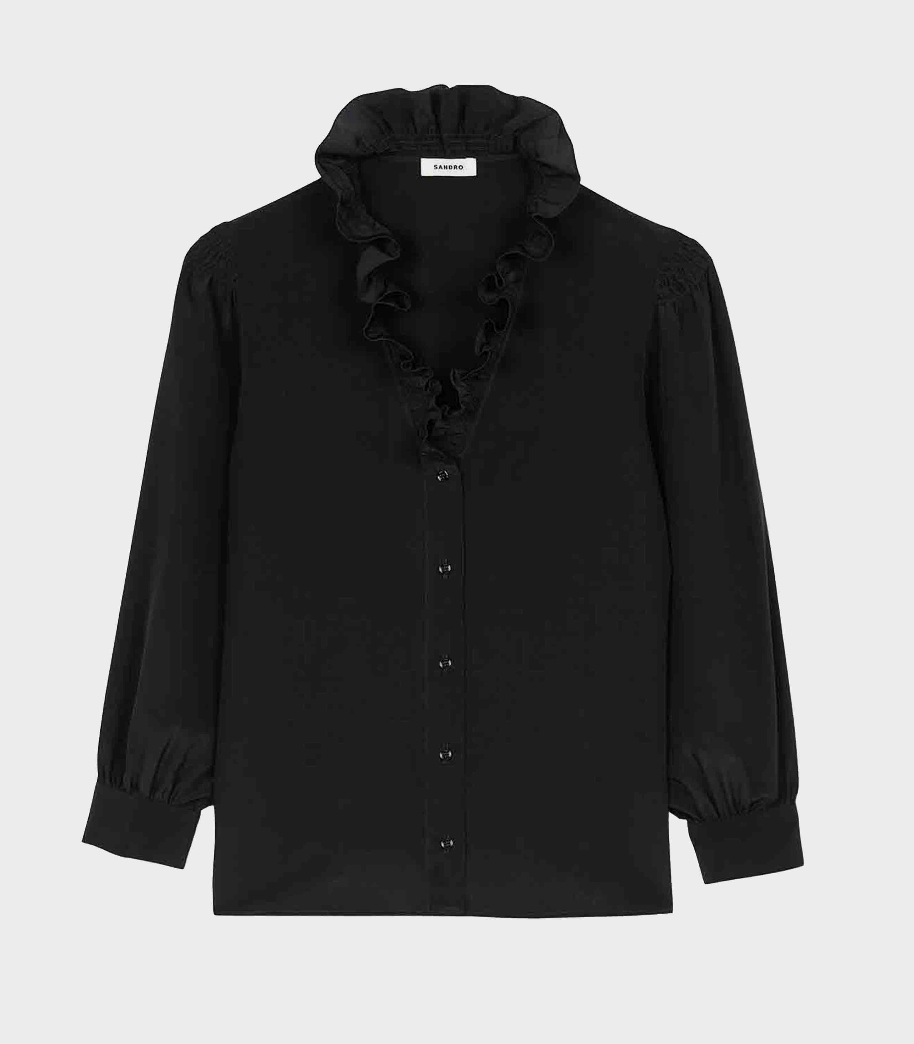 • Floaty silk shirt with ruffled collar, smocked front and shoulder gathers and long sleeves with buttoned cuffs.