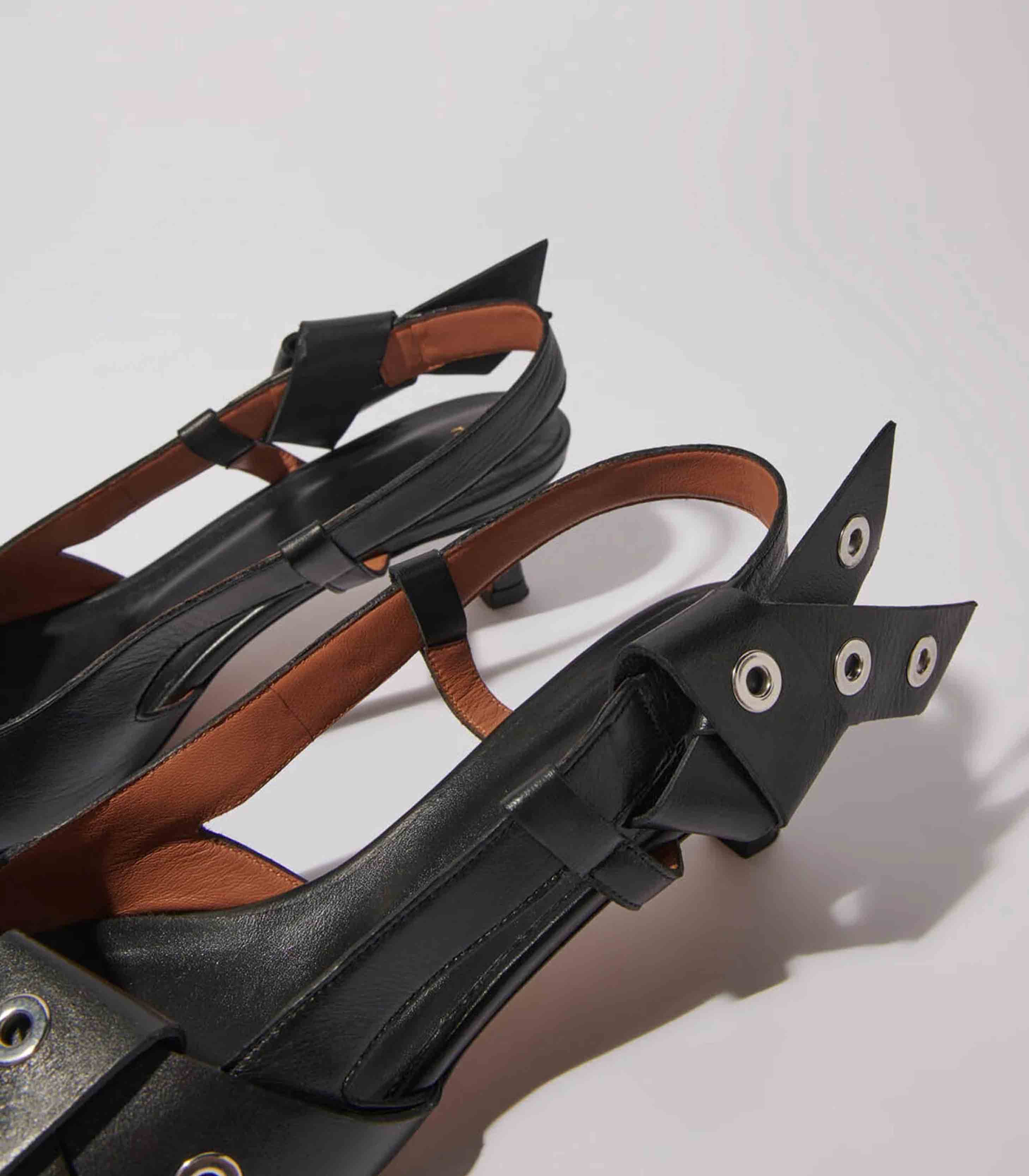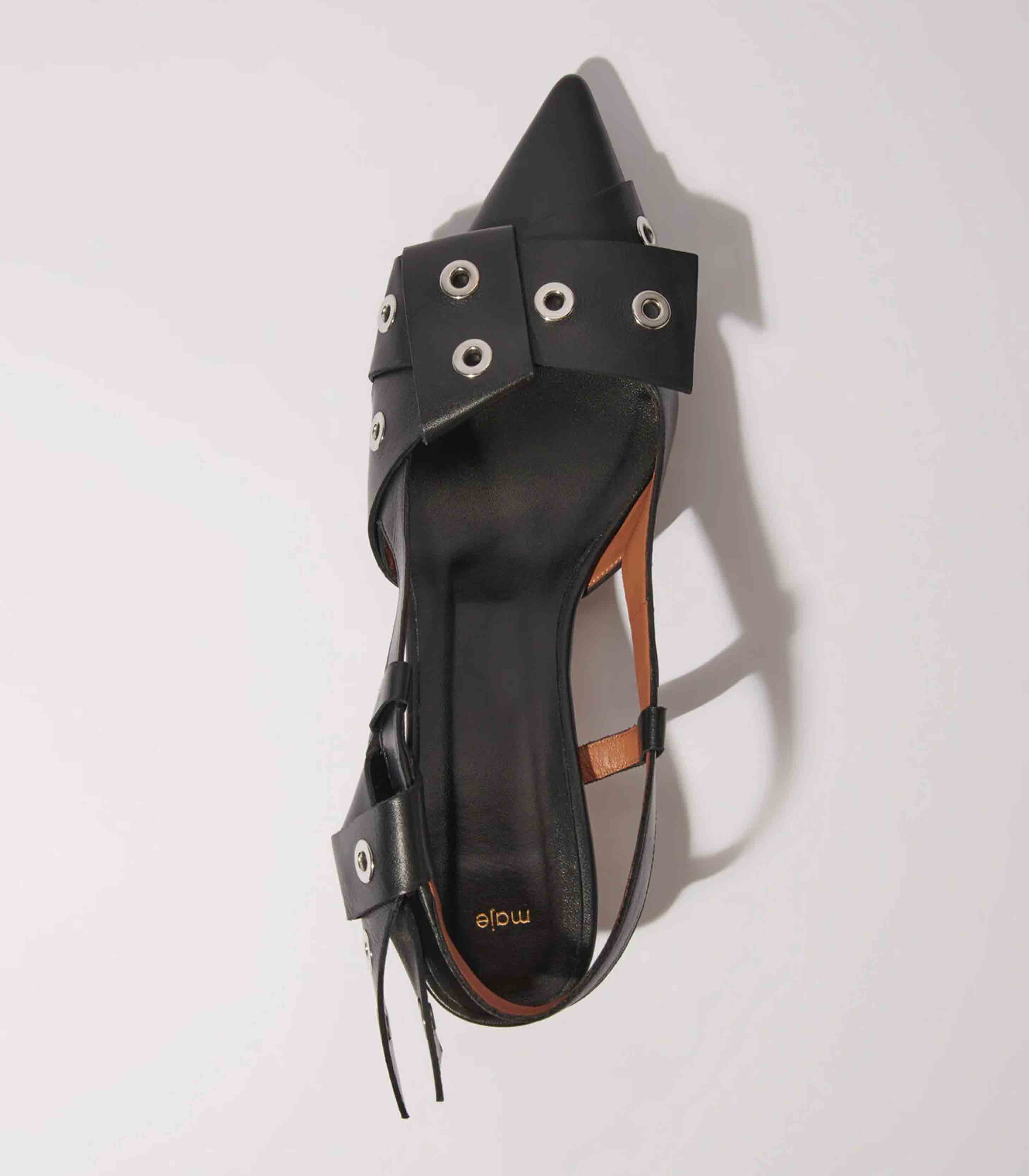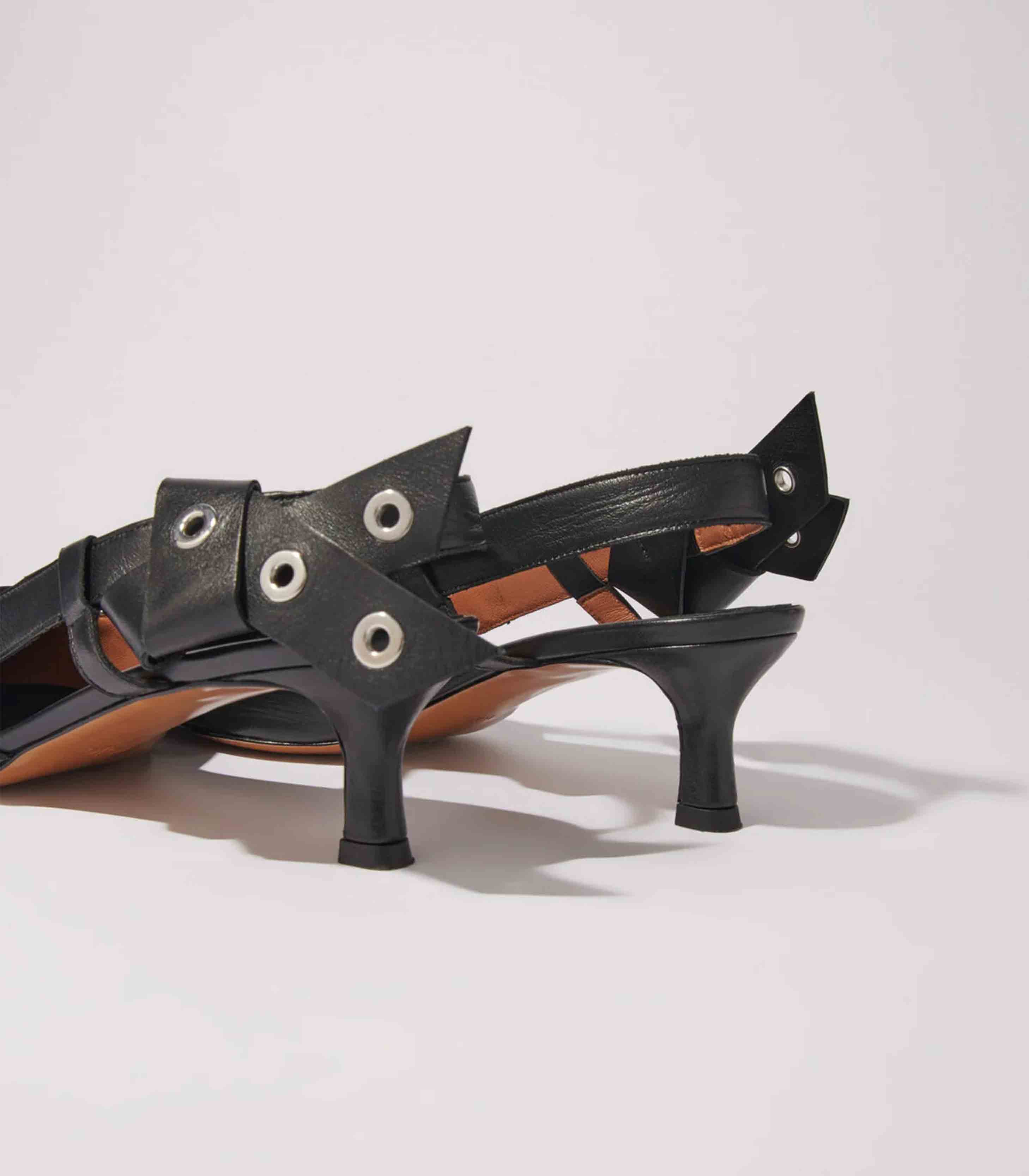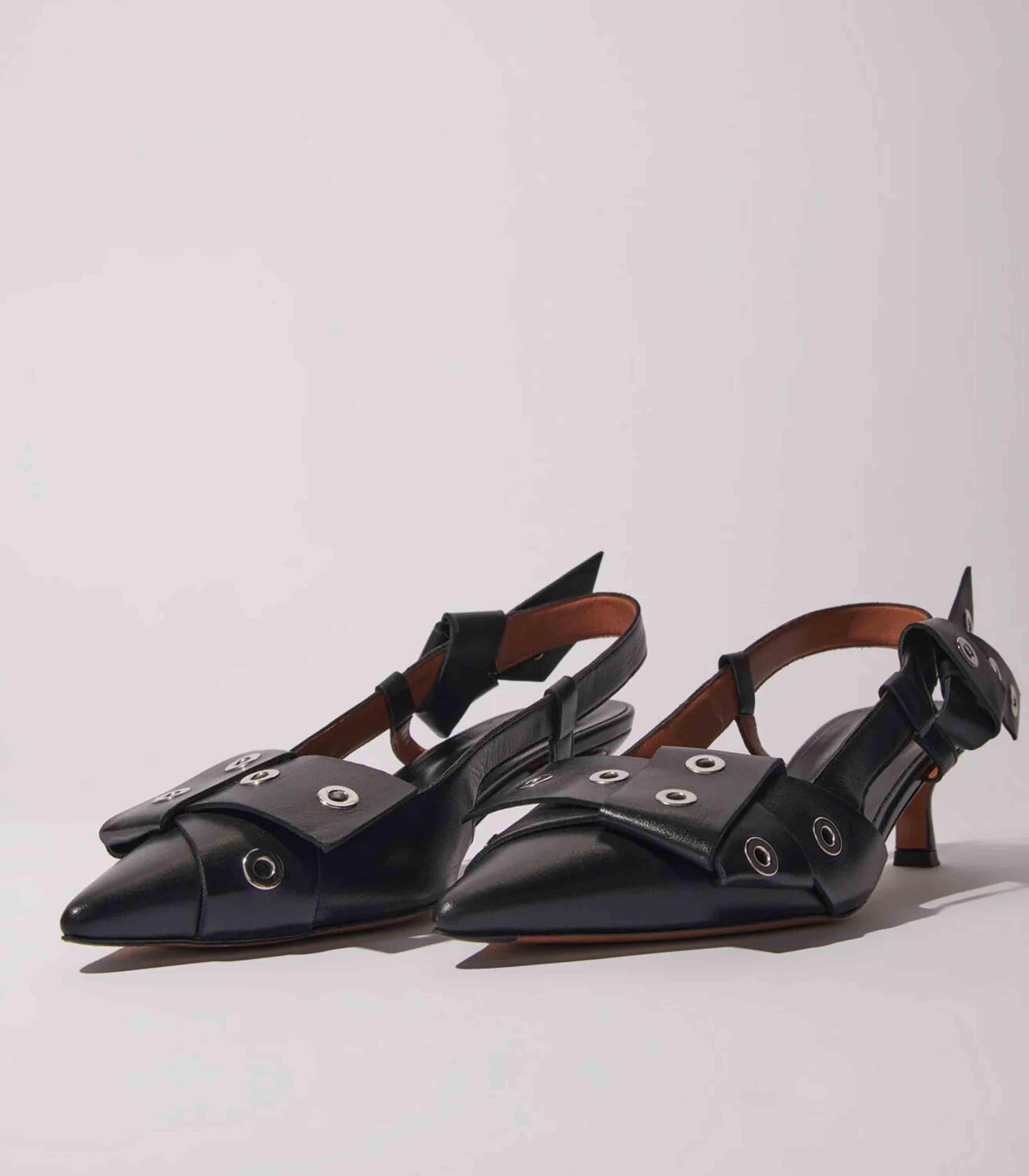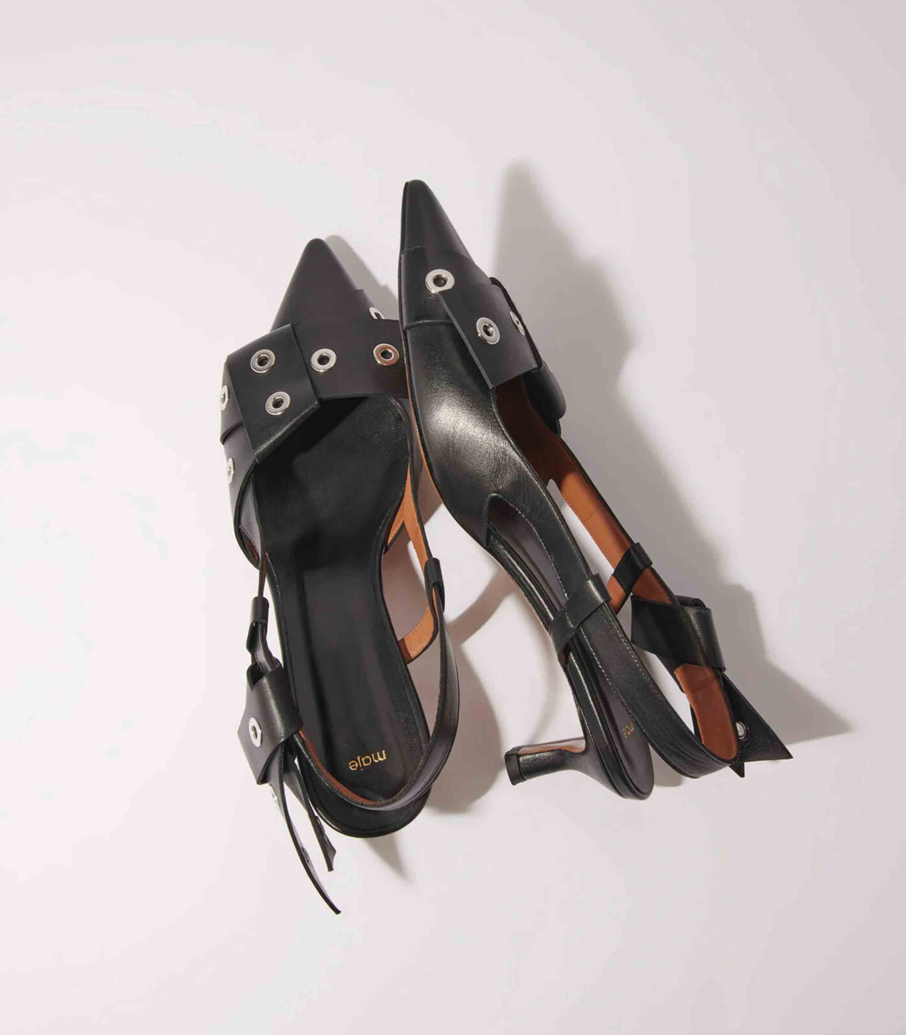 • This season, leather pumps have been given a bold, elegant new makeover. With their pointed toes, they boast bows with eyelets on the front and back strap. Both chic and assertive, they're the perfect addition to any office or evening outfit.