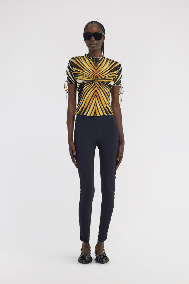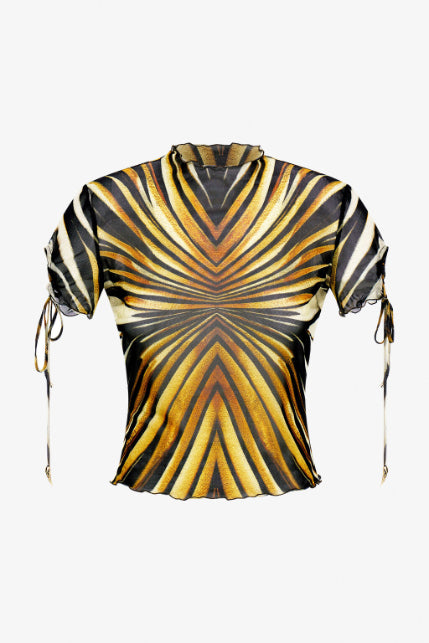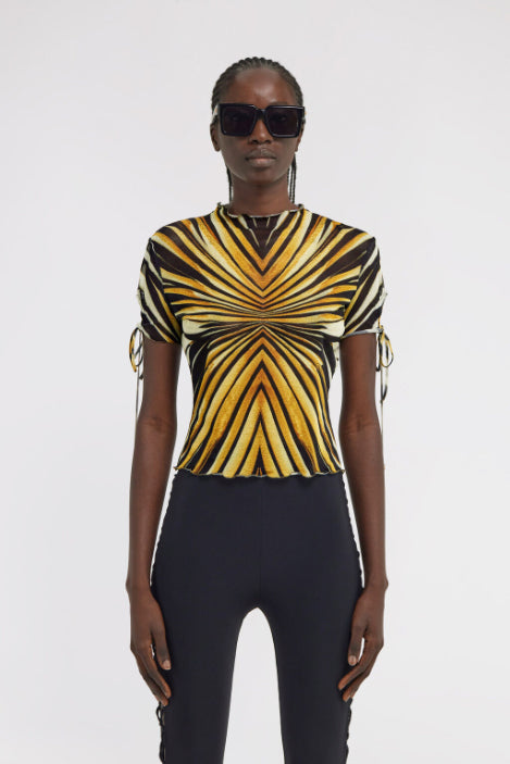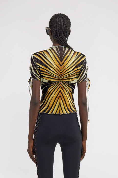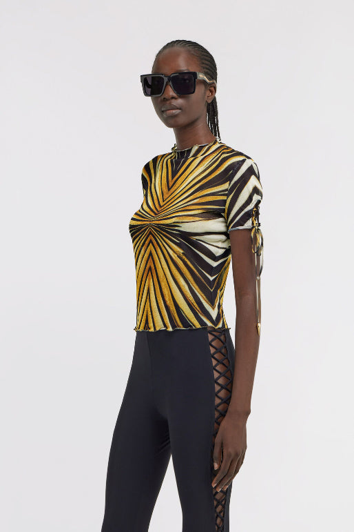 • Illuminate your look with the Ray of Gold T-shirt, where hypnotic lines converge in a radiant display of golden hues and deep black. The fitted silhouette is enhanced by delicate ruffled edges at the high neck and hem, while drawstring details add a playful touch to the short sleeves. This piece embodies contemporary Cavalli allure. The model is 178 cm / 5'10" tall and wears size S / 40 IT.