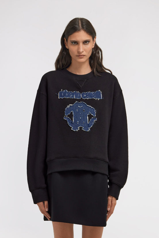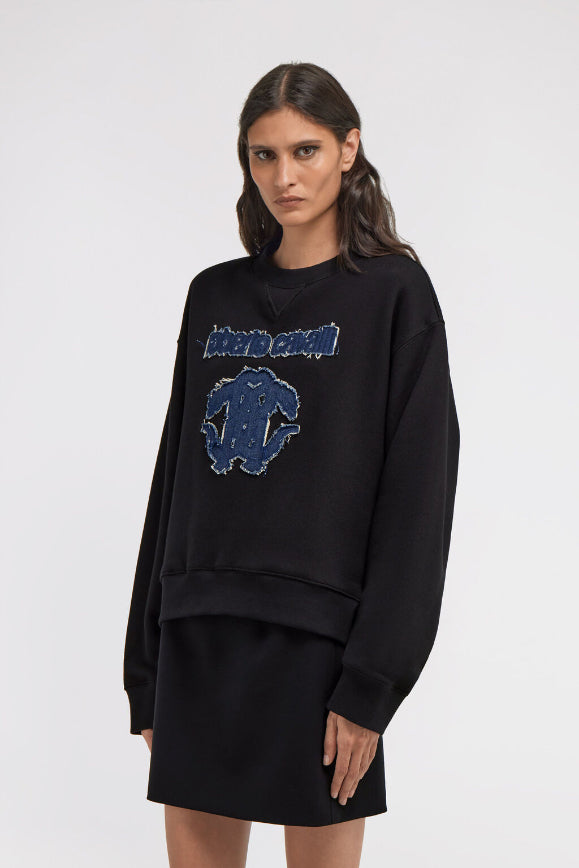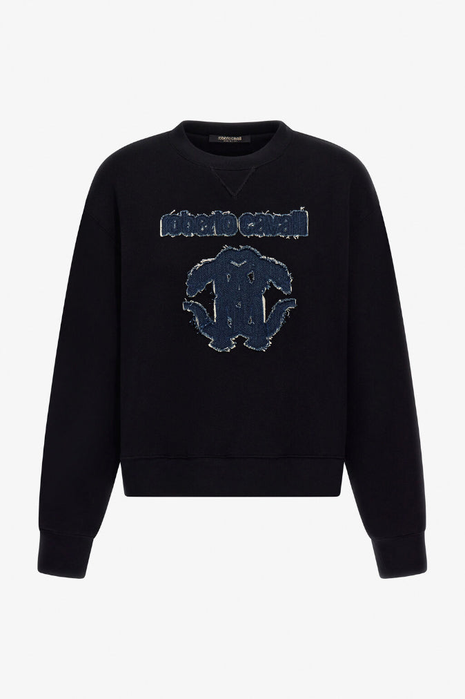 • A symbol of modern luxury, this sweatshirt reinterprets Roberto Cavalli's iconic identity with a bold, contemporary edge. The soft black fabric provides the perfect canvas for the distinctive logo and RC Monogram, crafted from frayed denim for a tactile, deconstructed effect. This piece merges relaxed comfort with a distinctive attitude, celebrating a new chapter of casual elegance. The model is 178cm / 5' 10" and wears a size S / 40 IT.