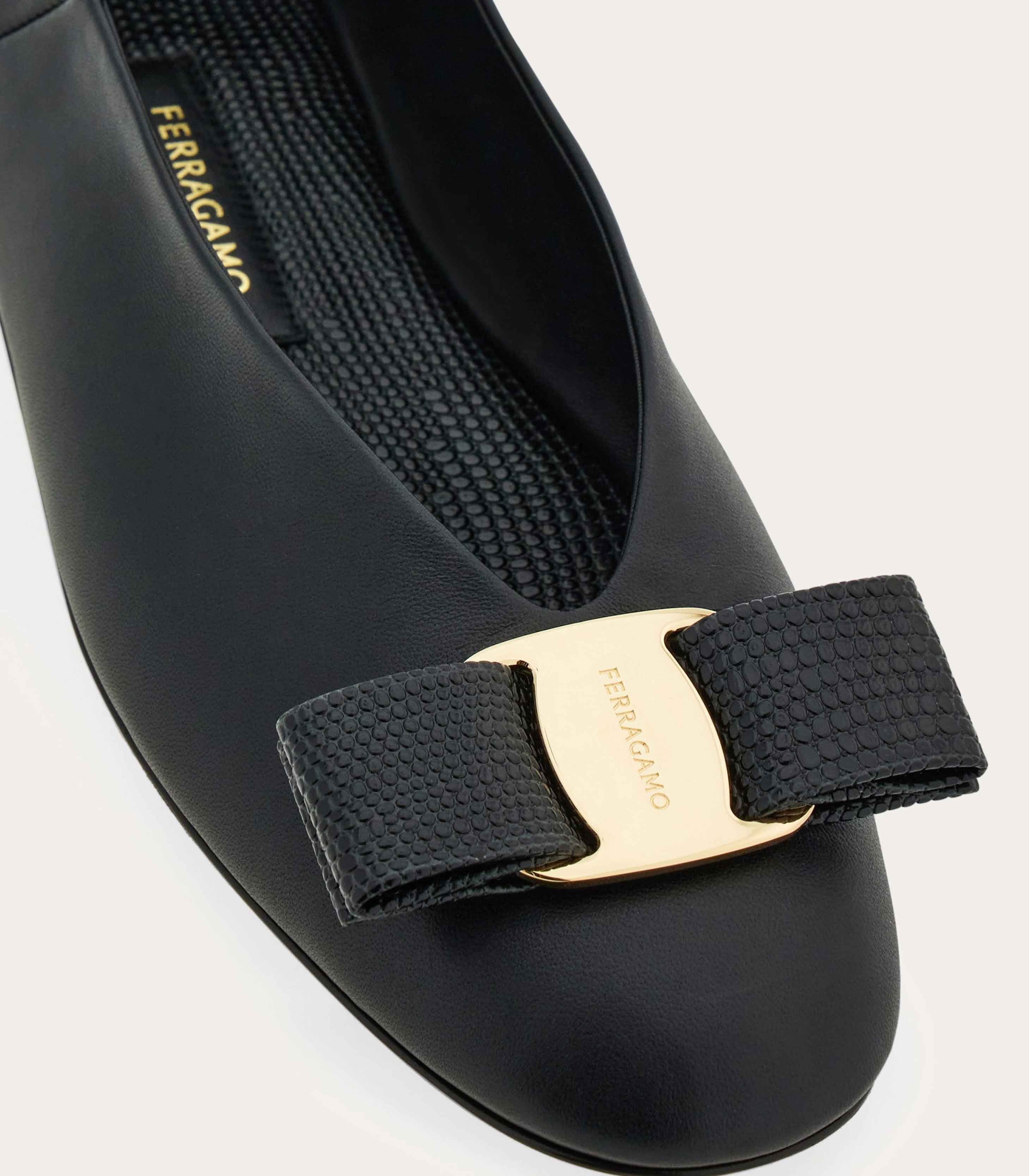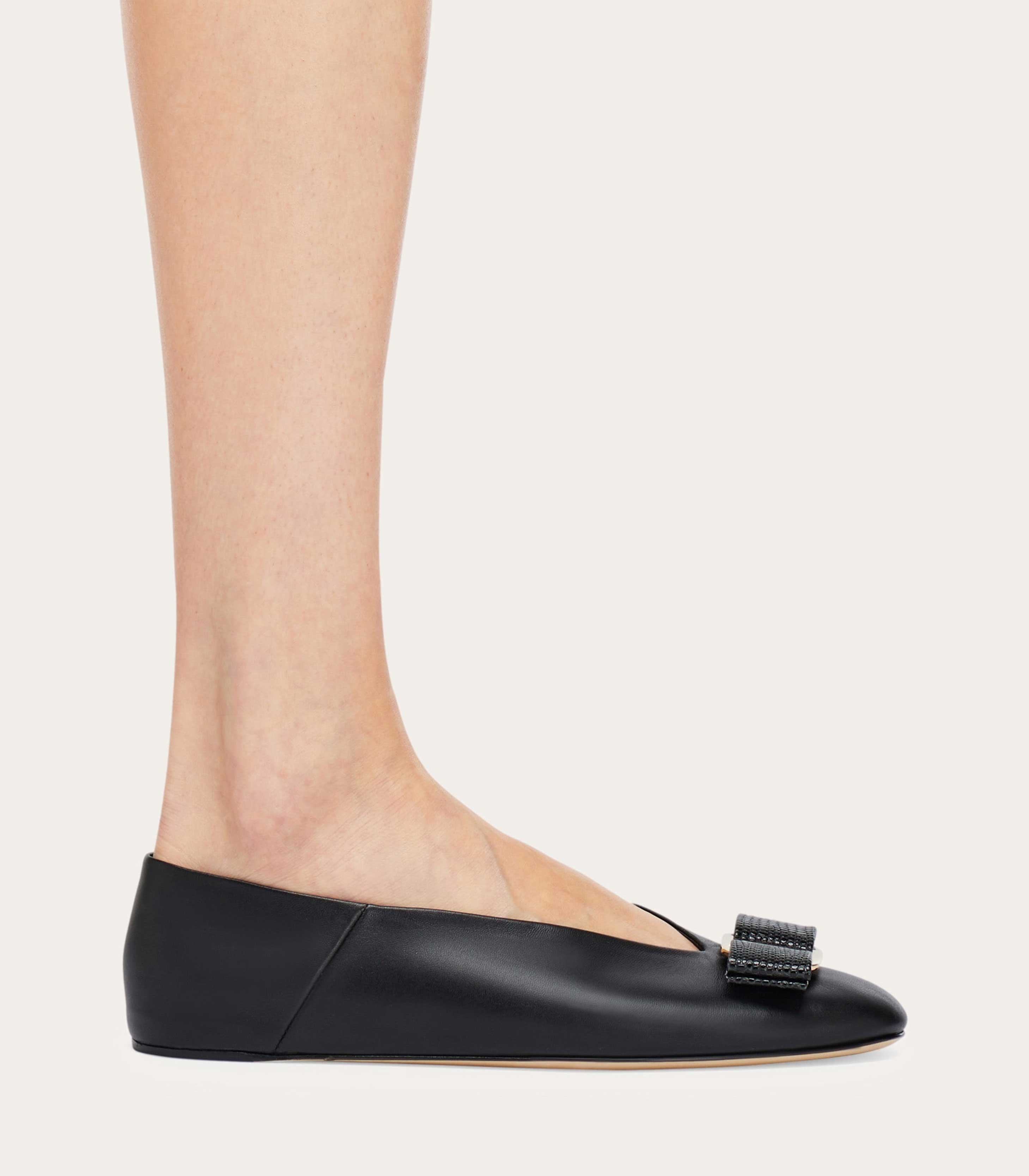 • The new Vara ballet flat, made of the softest nappa leather has a high V-neck with a large, lizard print Vara Bow held by a custom golden buckle at the tip.