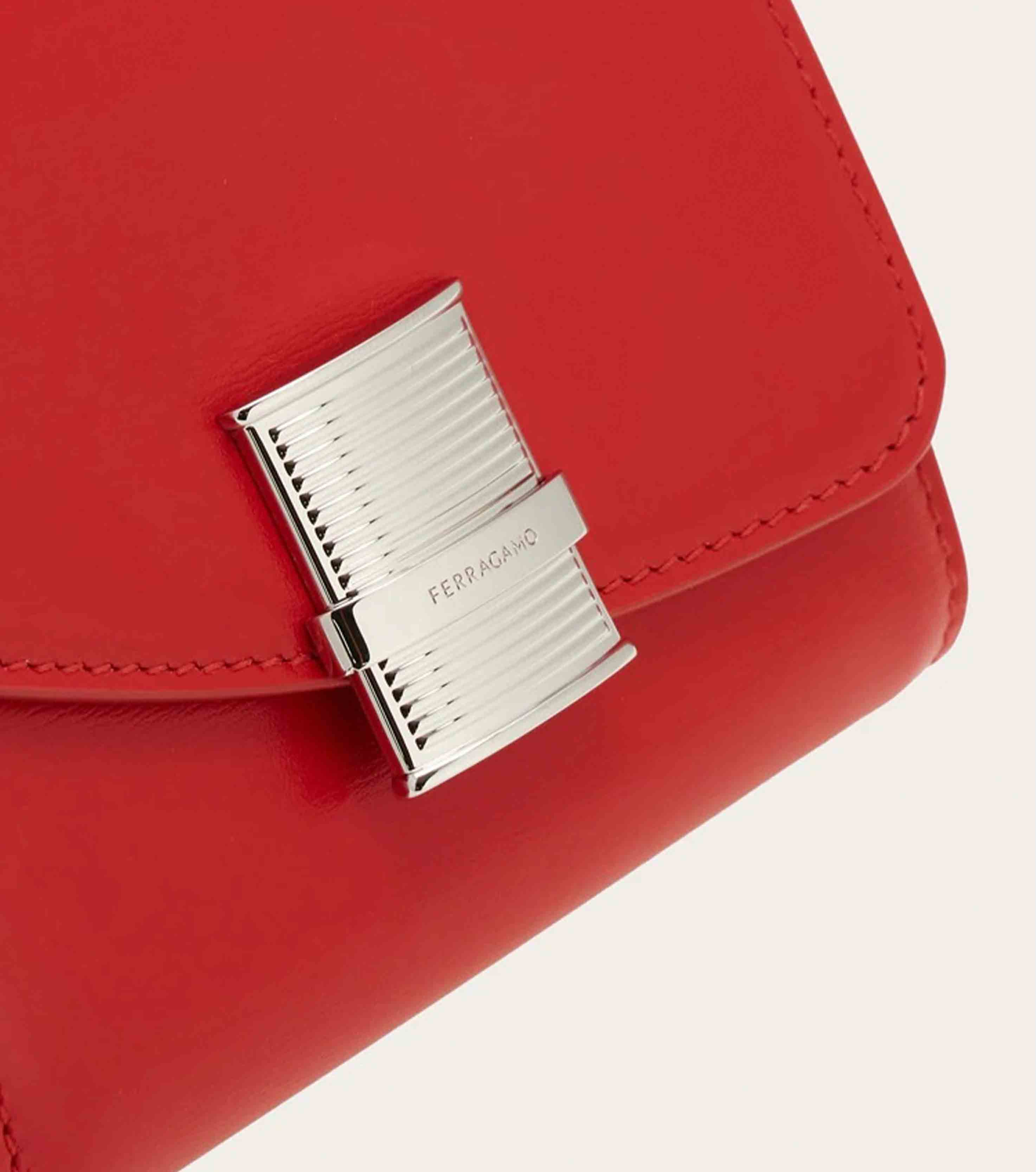 • The refined texture of the boarded calfskin and the original lines of the asymmetrical flap define this new compact wallet from the Fiamma collection.