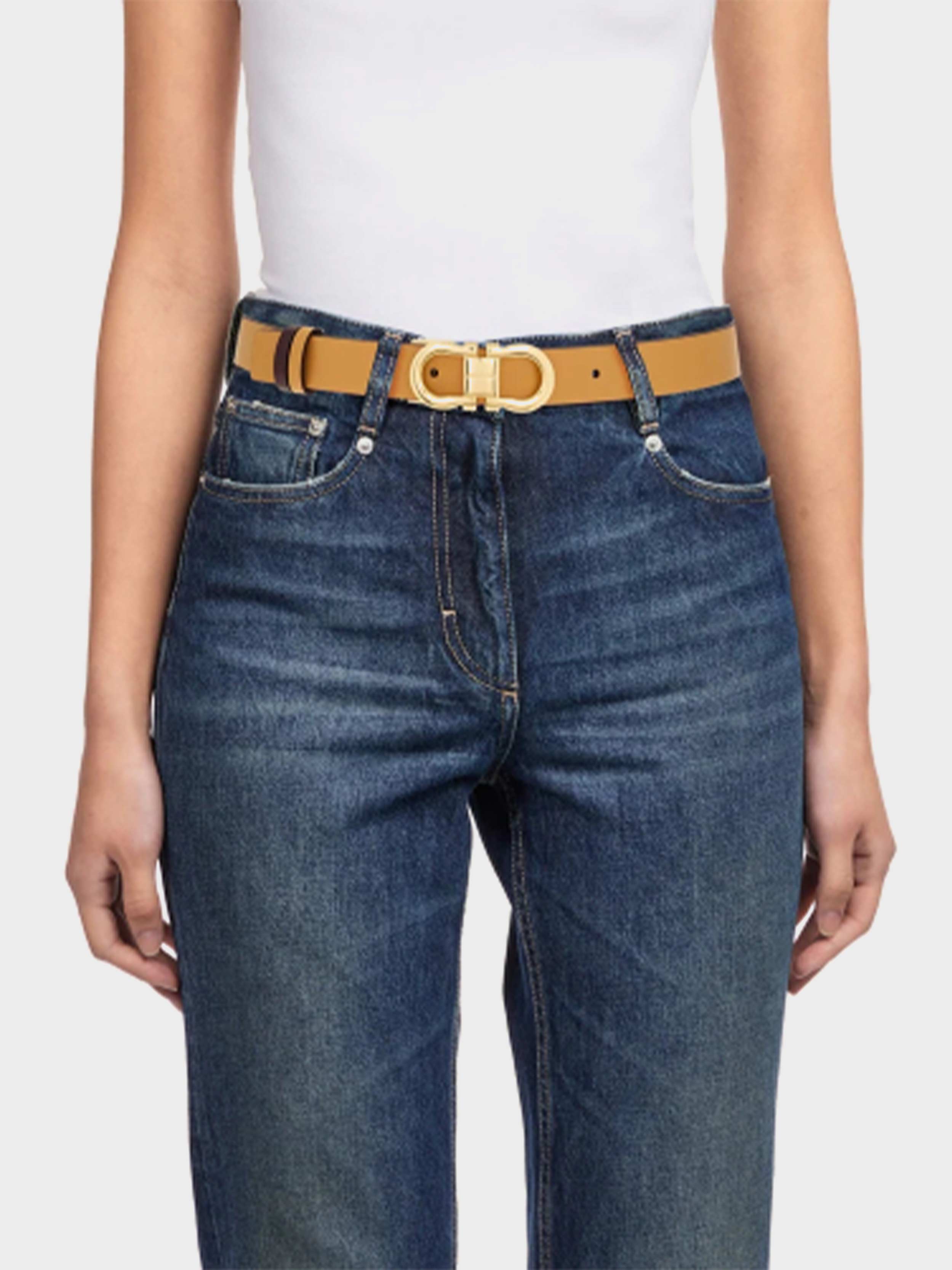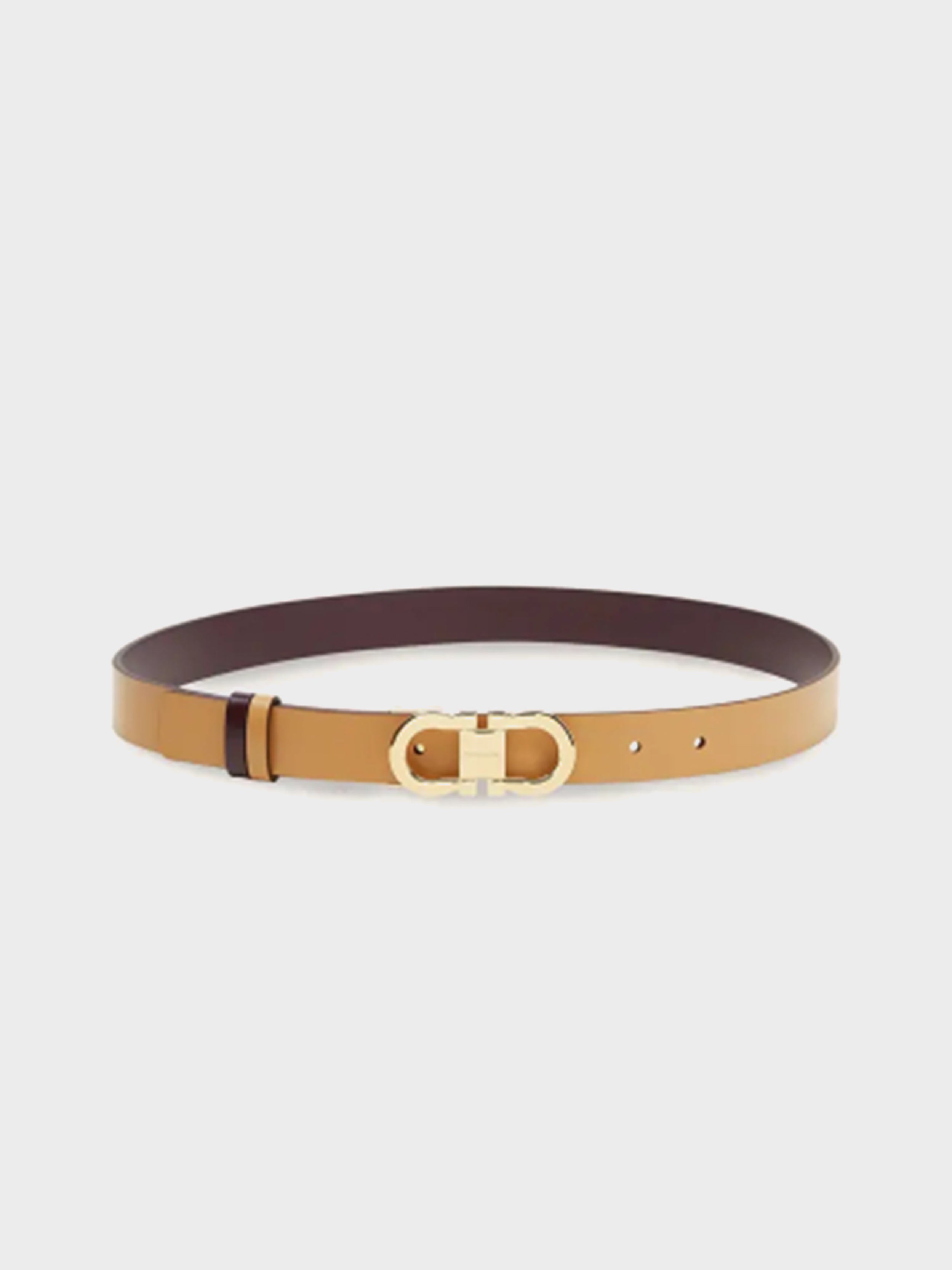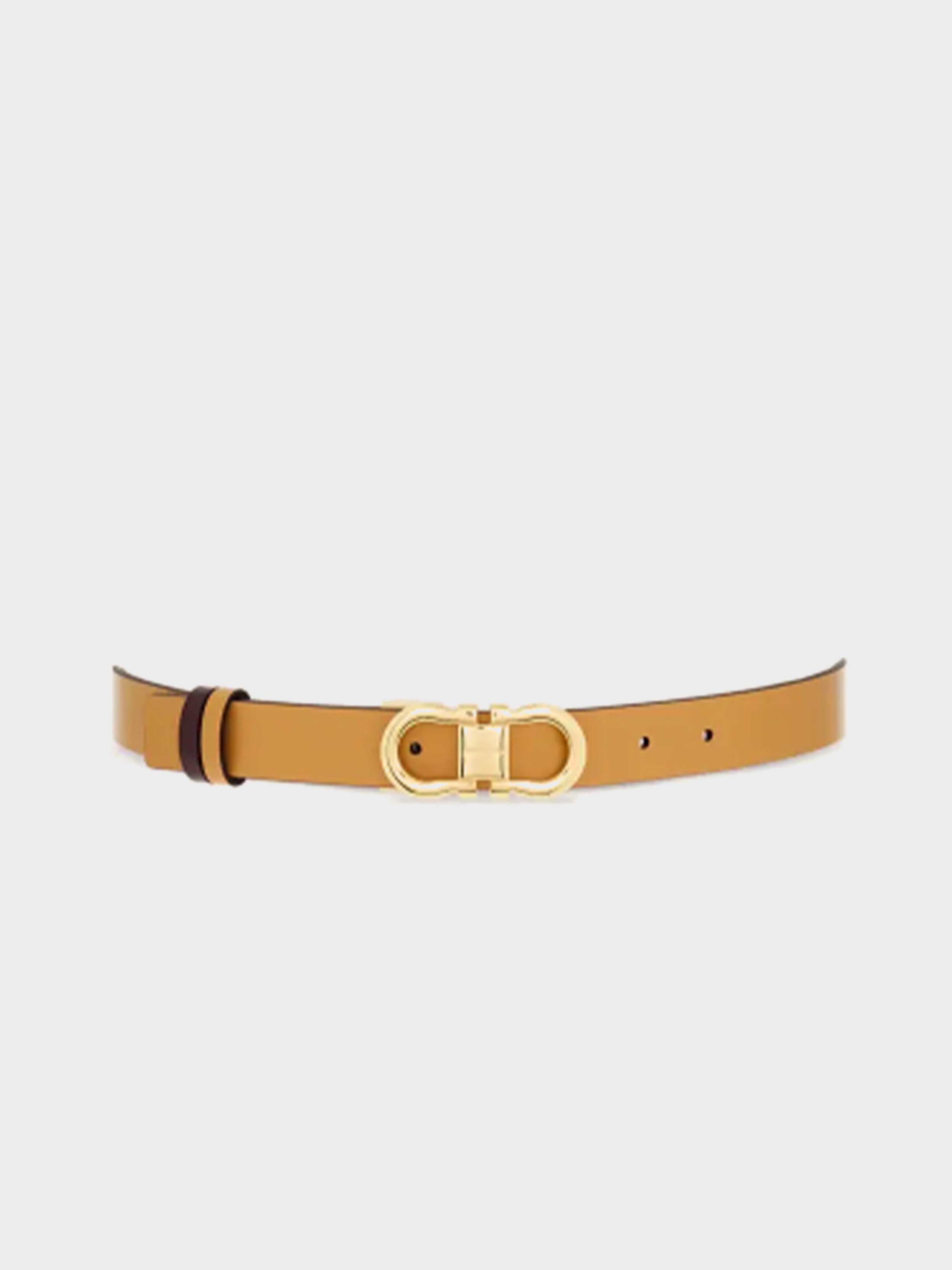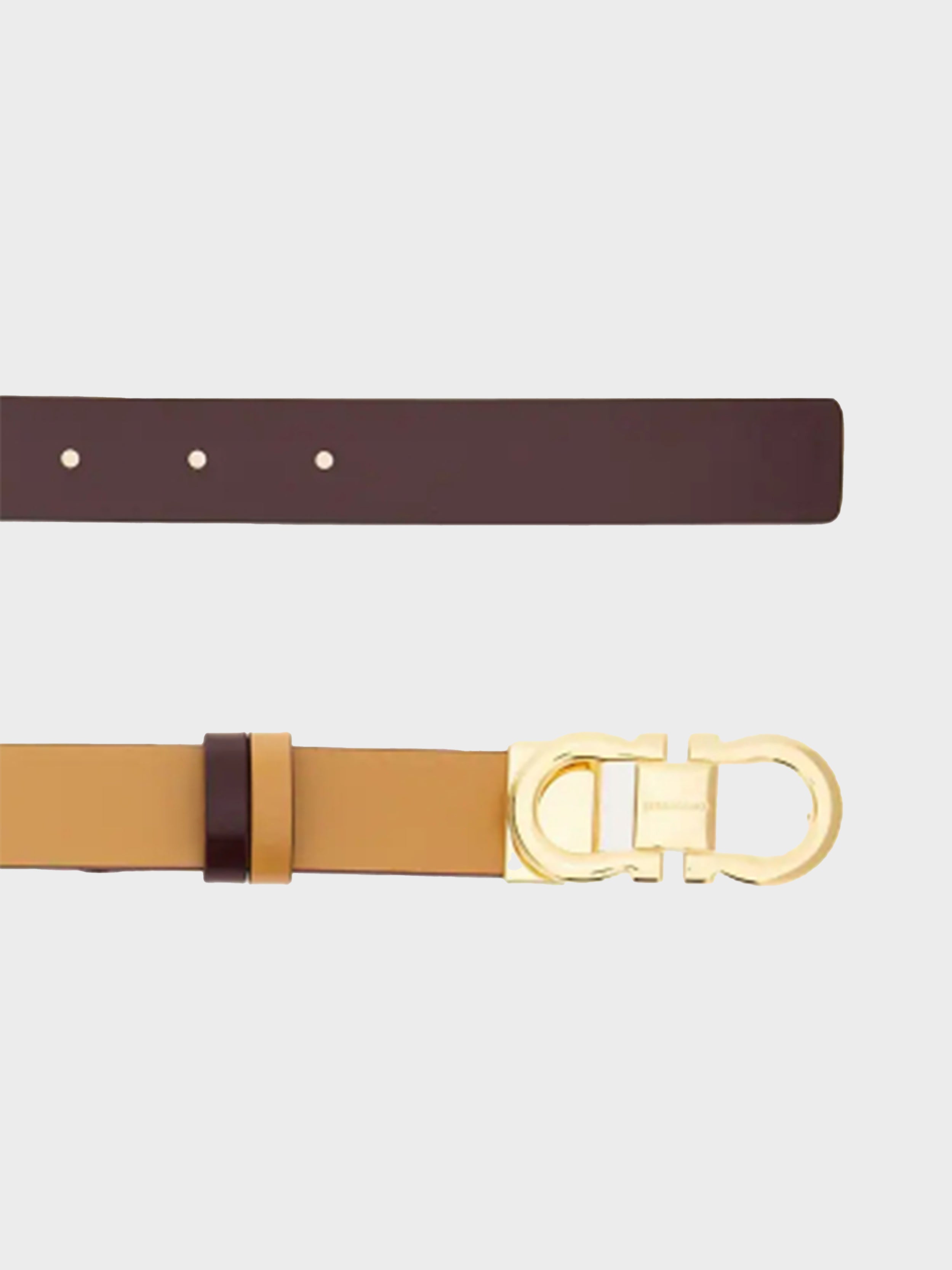 • Subtle for an extra touch of femininity, reversible for use that transcends everyday looks. Smooth calfskin belt with reversible construction, adjustable length and two-tone design. The iconic Gancini buckle in a gold finish is offered with a squared profile for a graphic and more current note. The adjustable length allows for a more personalized fit and style. We invite you to check our size guide for more information.