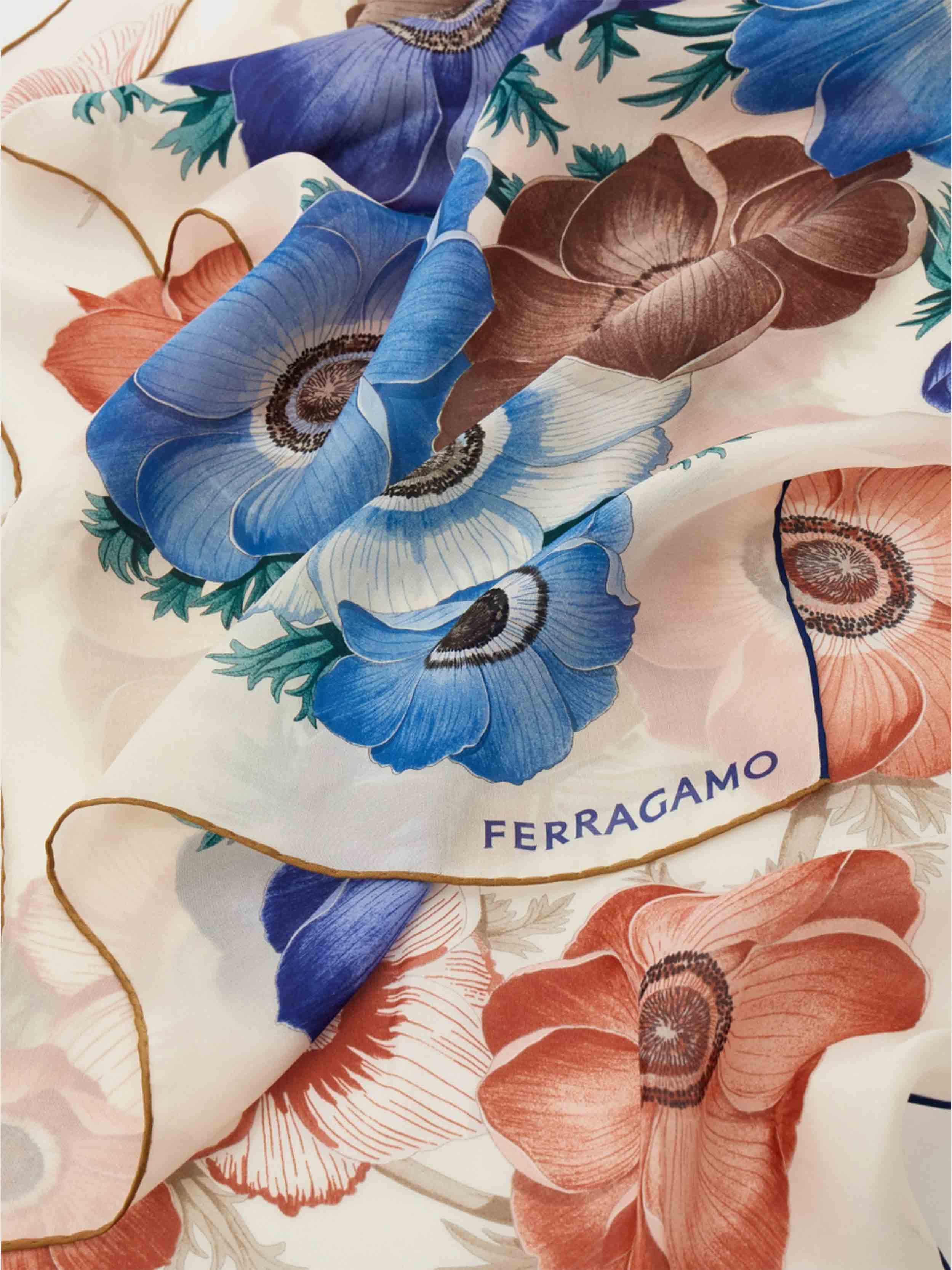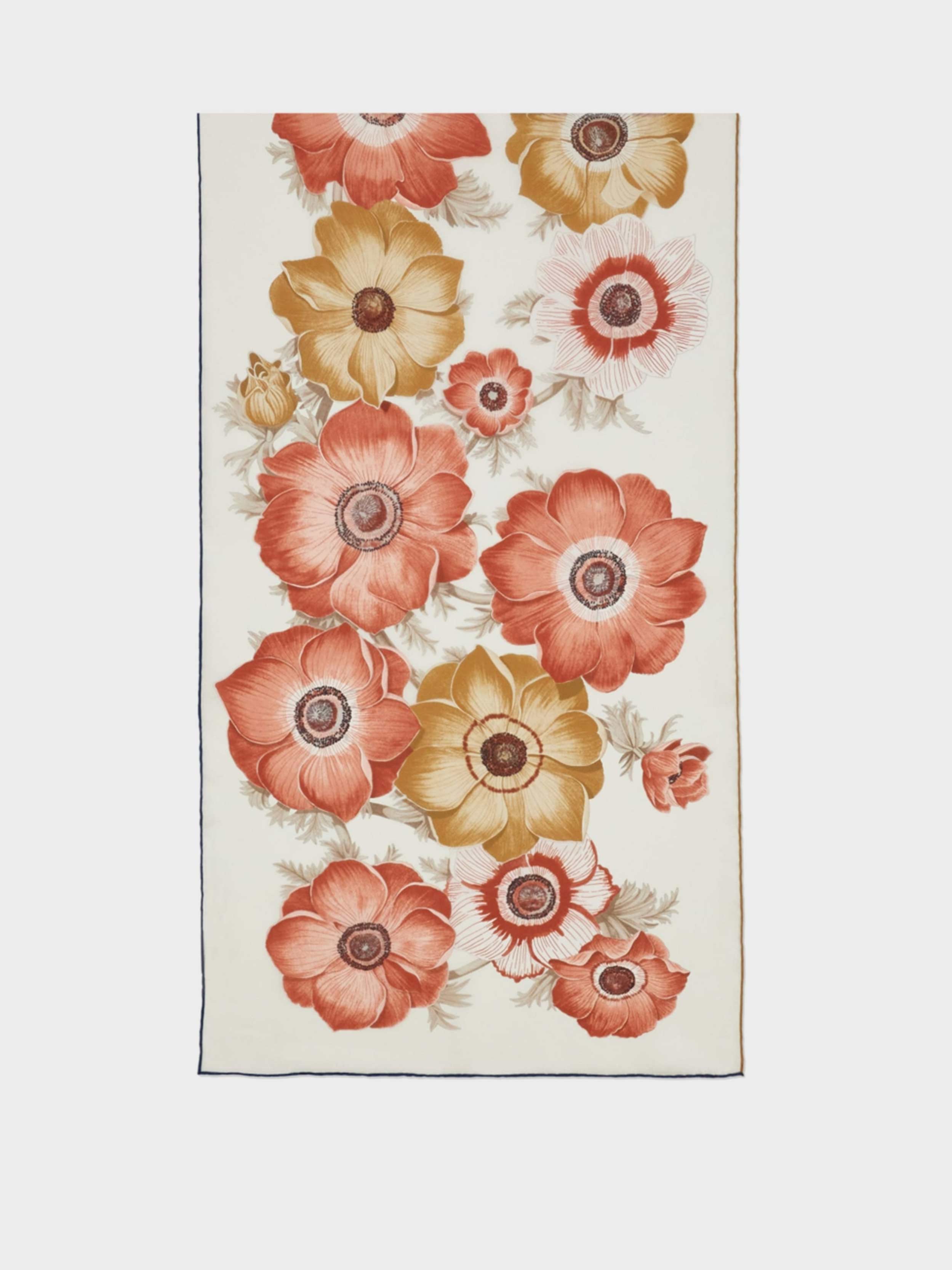 • The silk scarf is decorated with the Anemone print, an archival floral pattern recolored and proposed in an alternation of shades for a contemporary effect.
