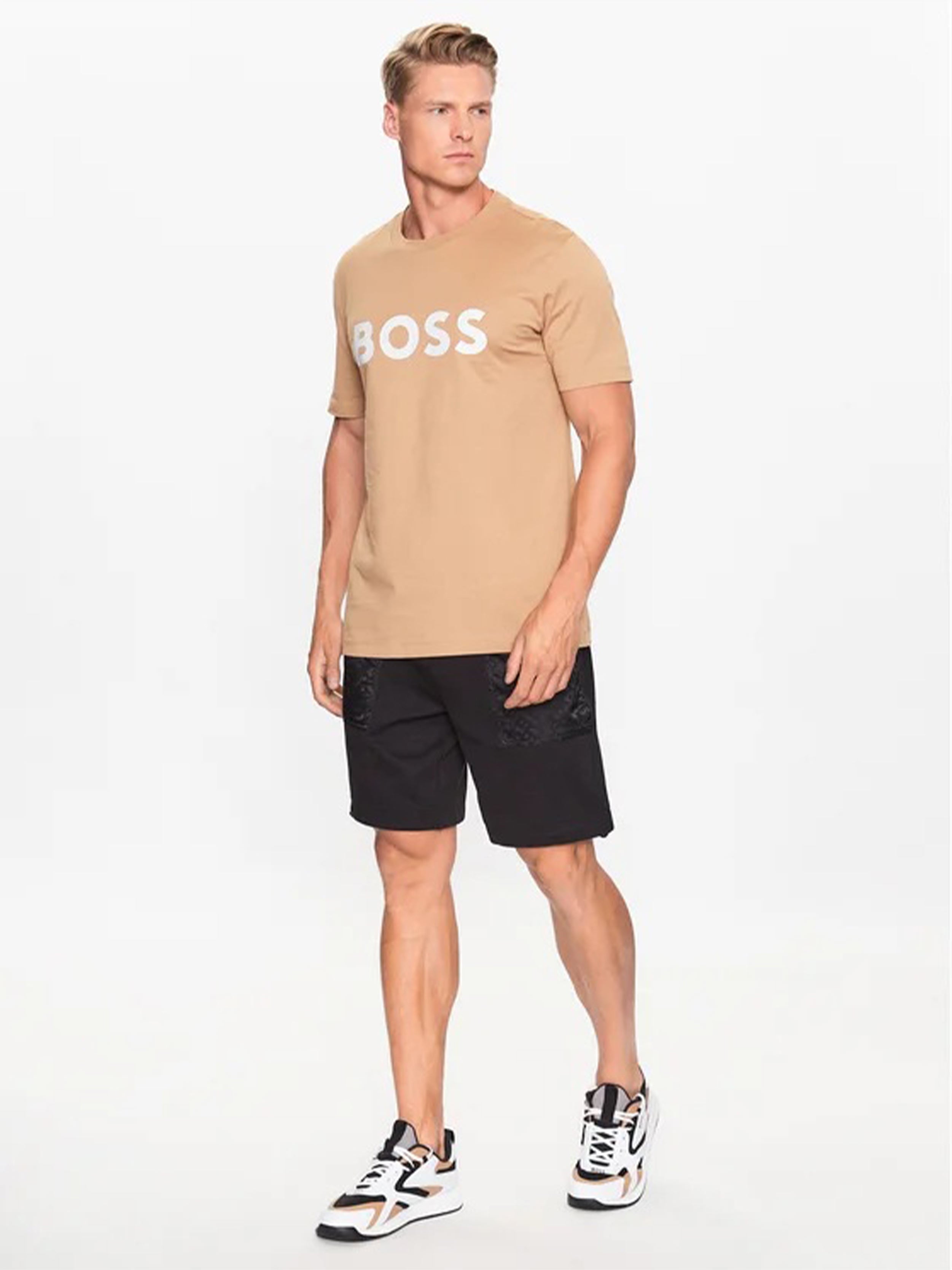 • These sporty shorts from the BOSS collection will complement your casual everyday looks. This straight-leg style features an elastic waistband and side pockets in a contrasting monogram print. Crafted from a durable cotton blend.
