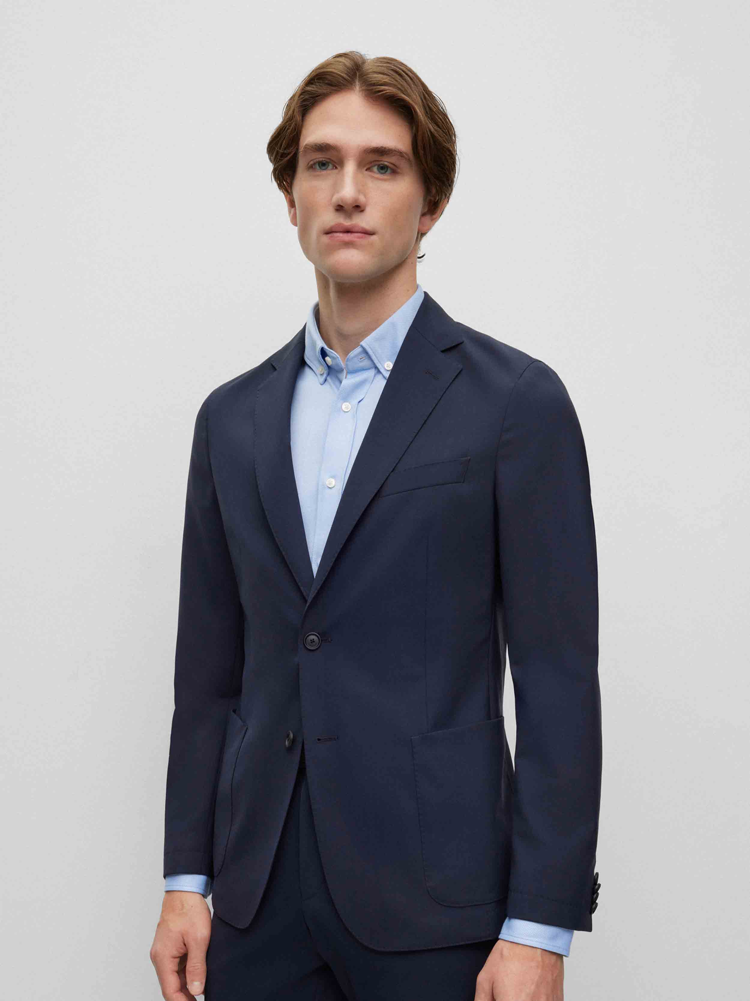 • Packable jacket by BOSS Menswear is tailored to a defined fit in stretch wool blend.