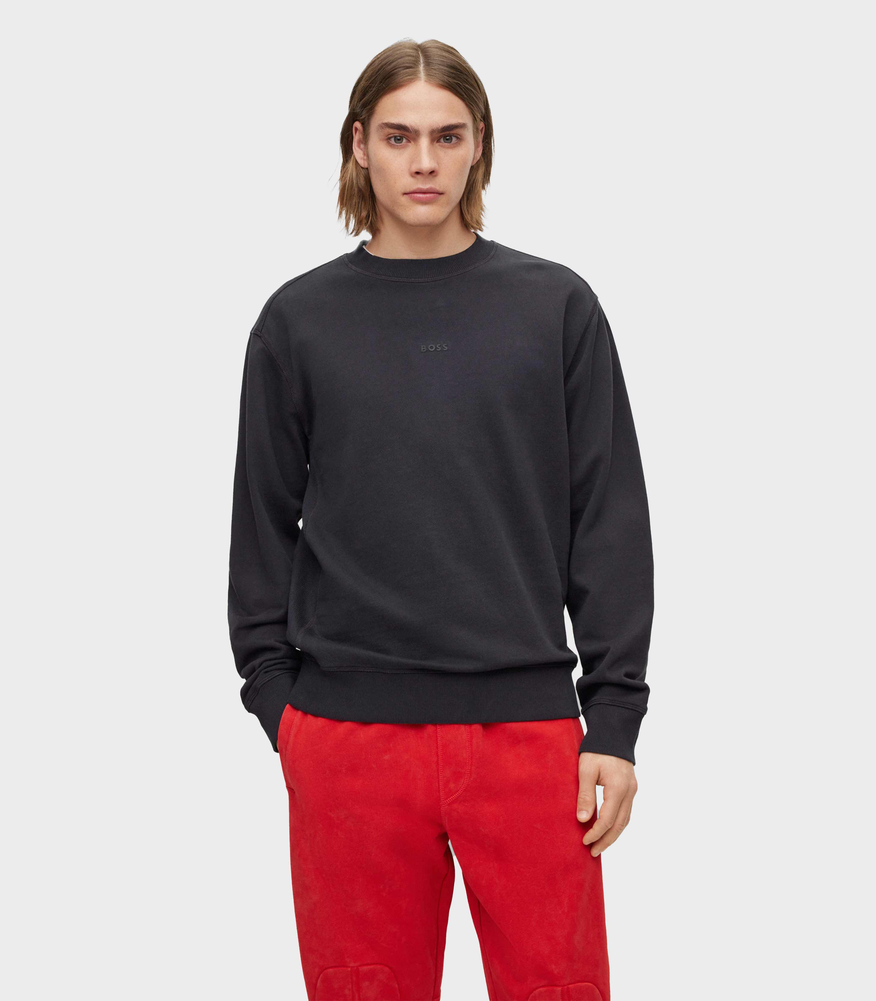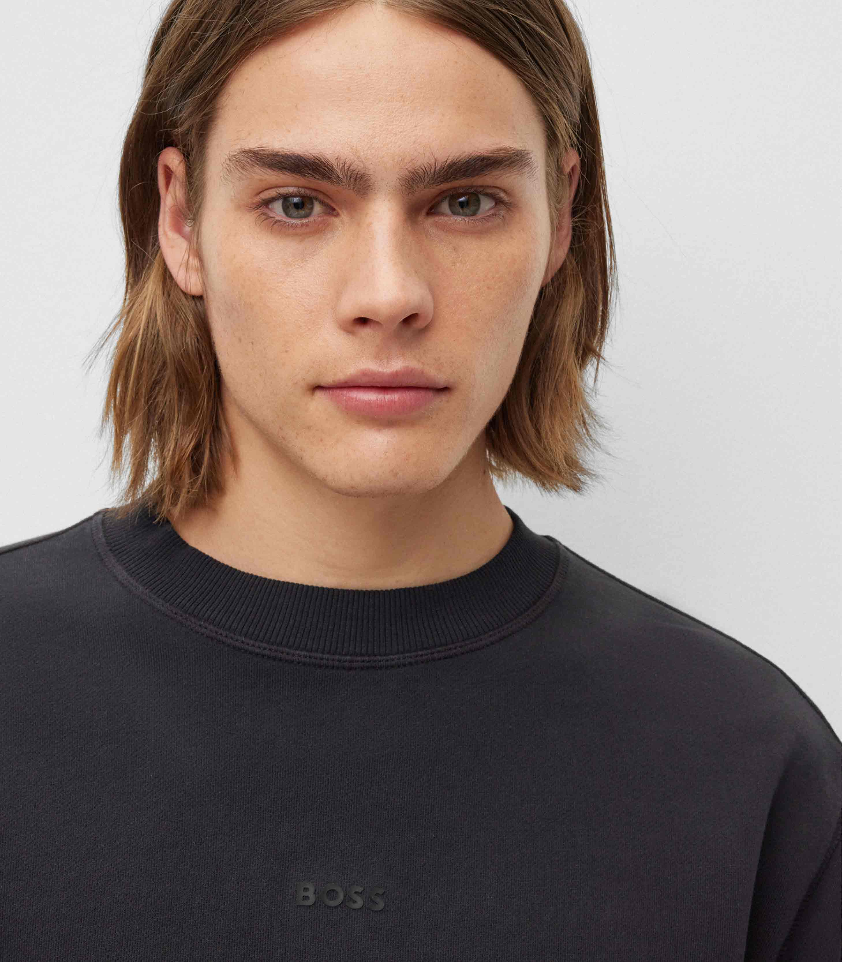 • A solid-color sweatshirt from the BOSS men's collection. This relaxed-fit, crew-neck, long-sleeved sweatshirt is crafted from pure, natural cotton for breathability and optimal body temperature. The brand's signature logo is featured centered on the chest.