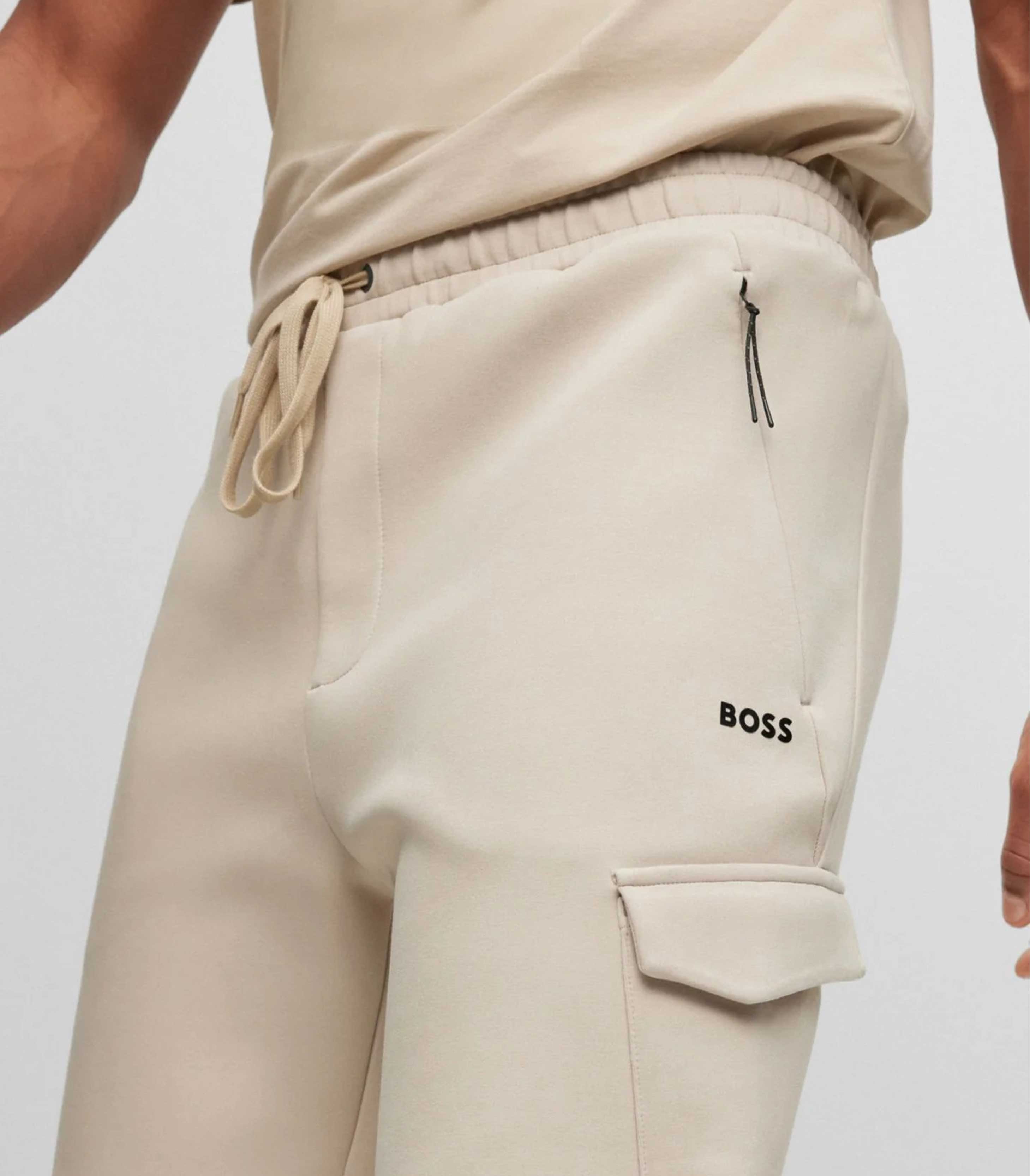 • Regular-fit BOSS Menswear shorts in technical stretch cotton blend with active mint finish, logo detail and cargo pocket.