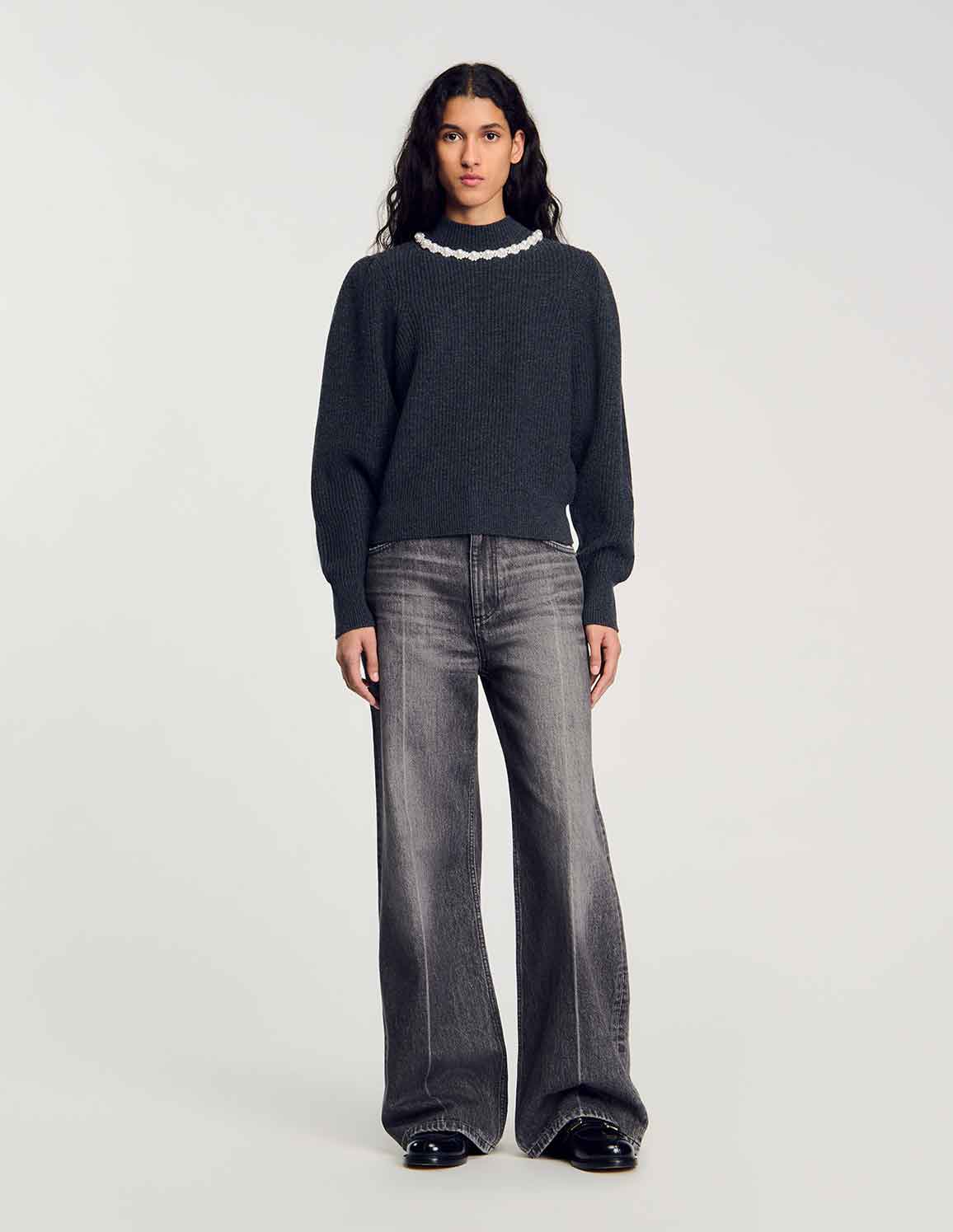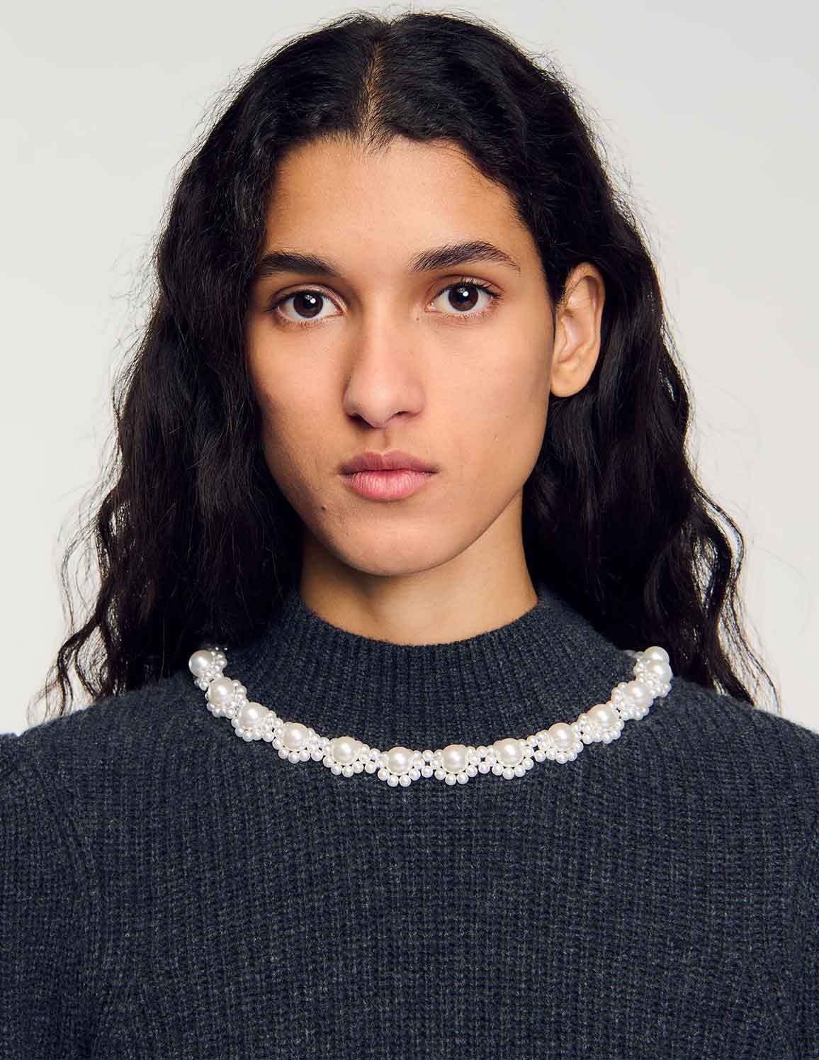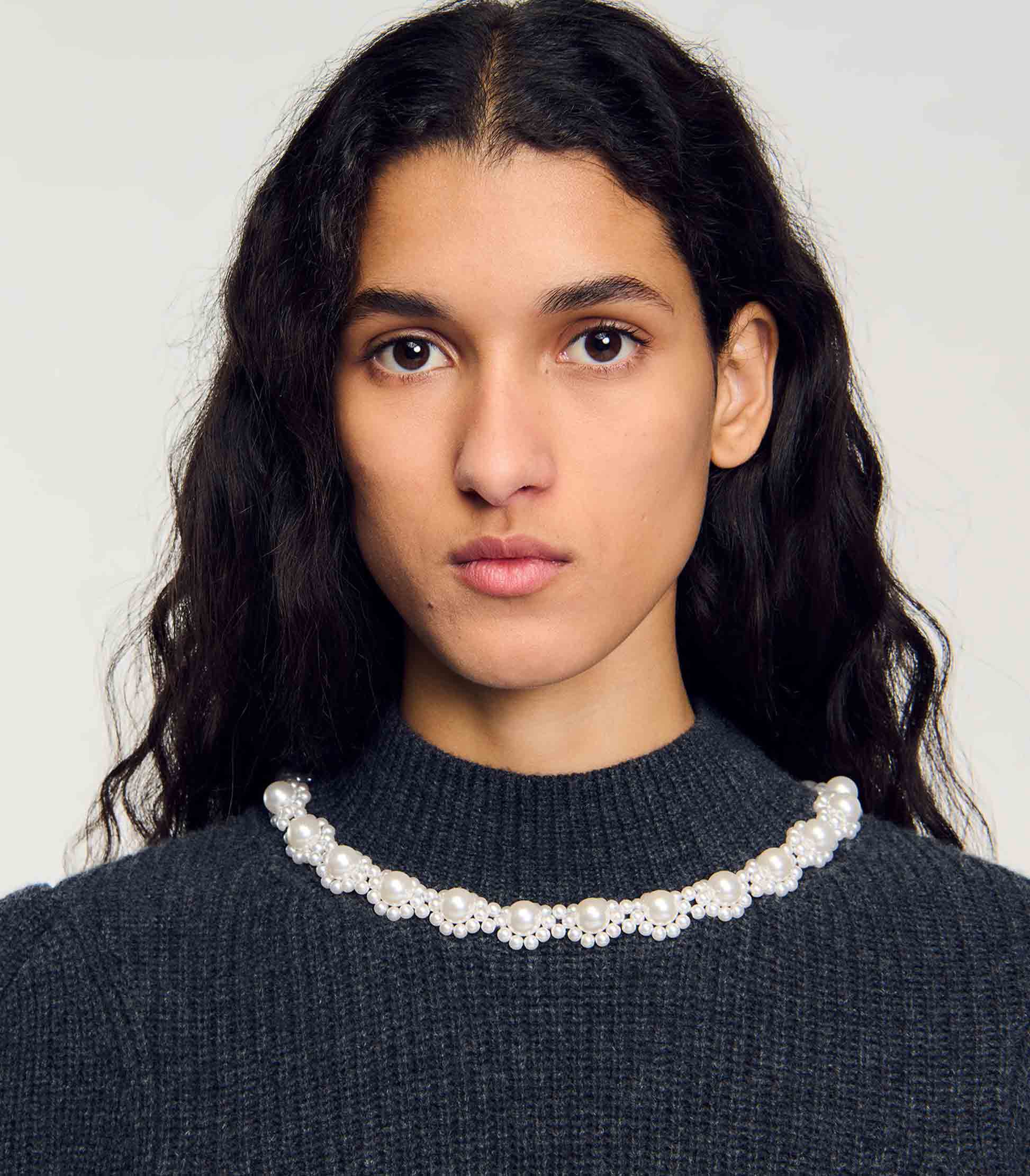 • Knitted sweater in wool and cashmere blend with full long sleeves and high neck with contrasting beads.