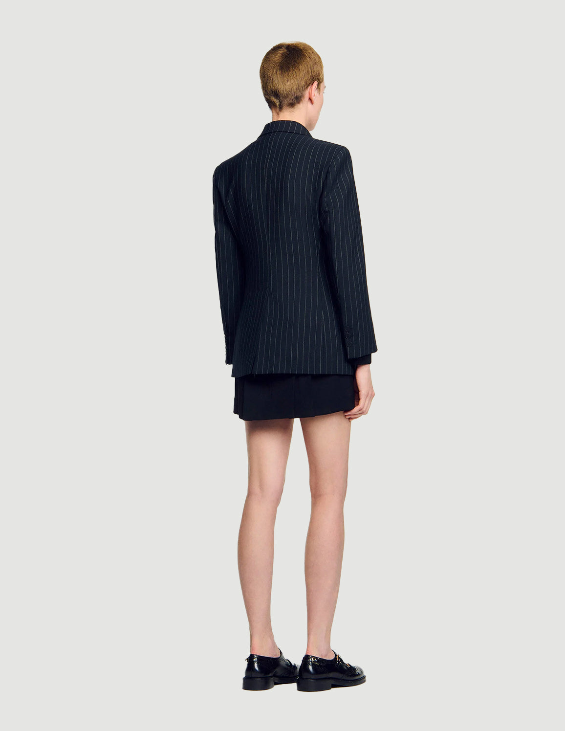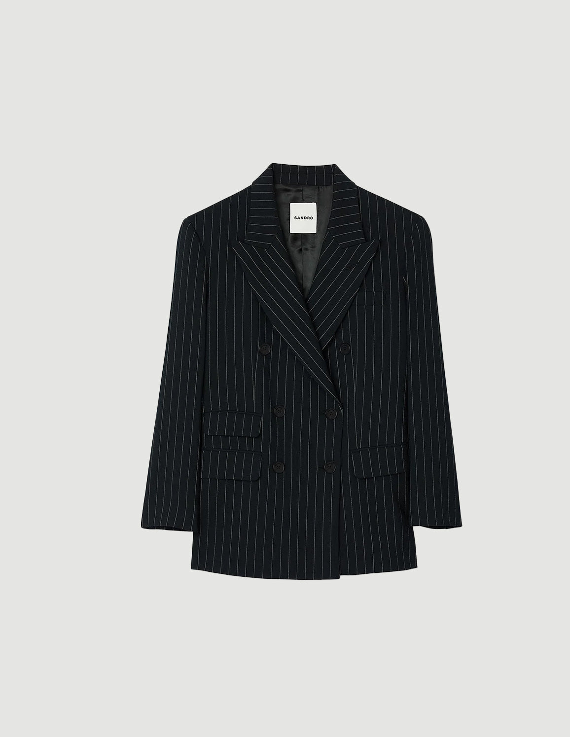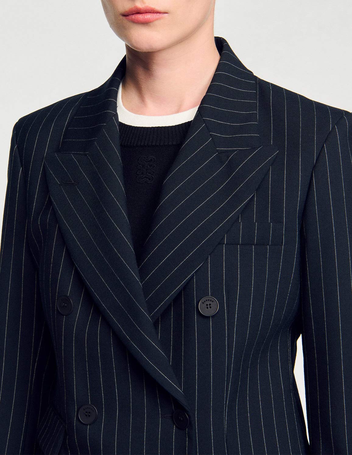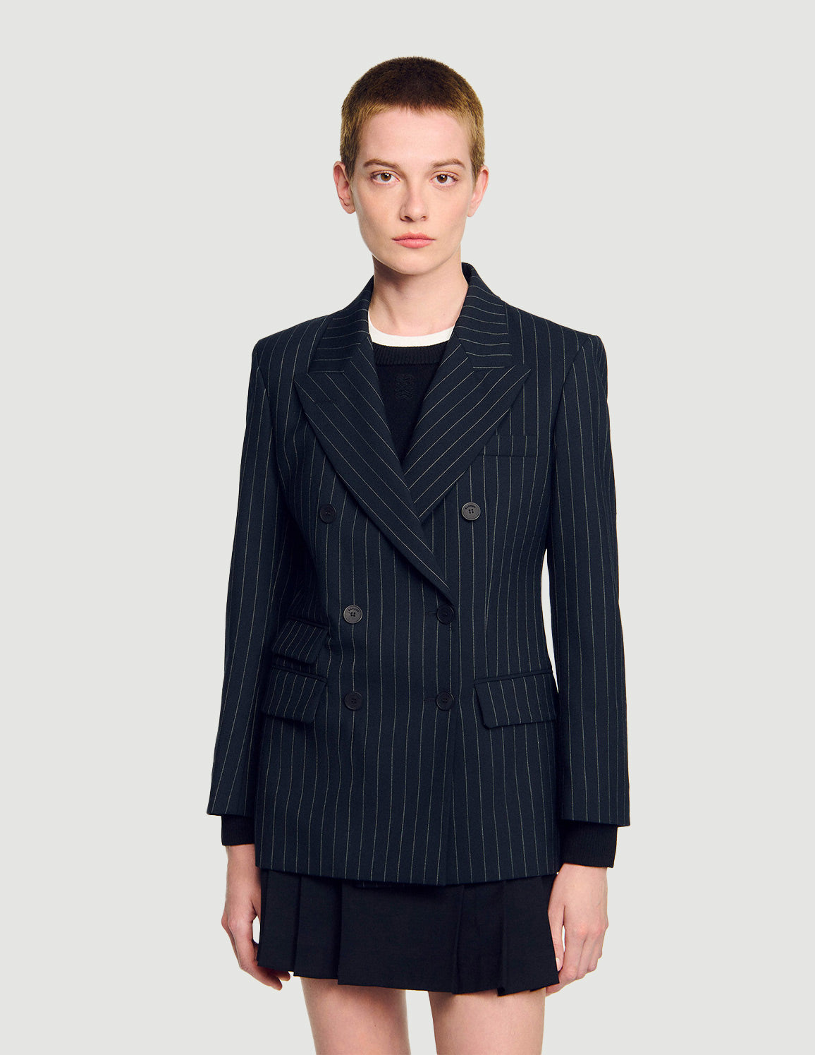 • Striped suit jacket with double-breasted fastening, side flap pockets and rear vent.