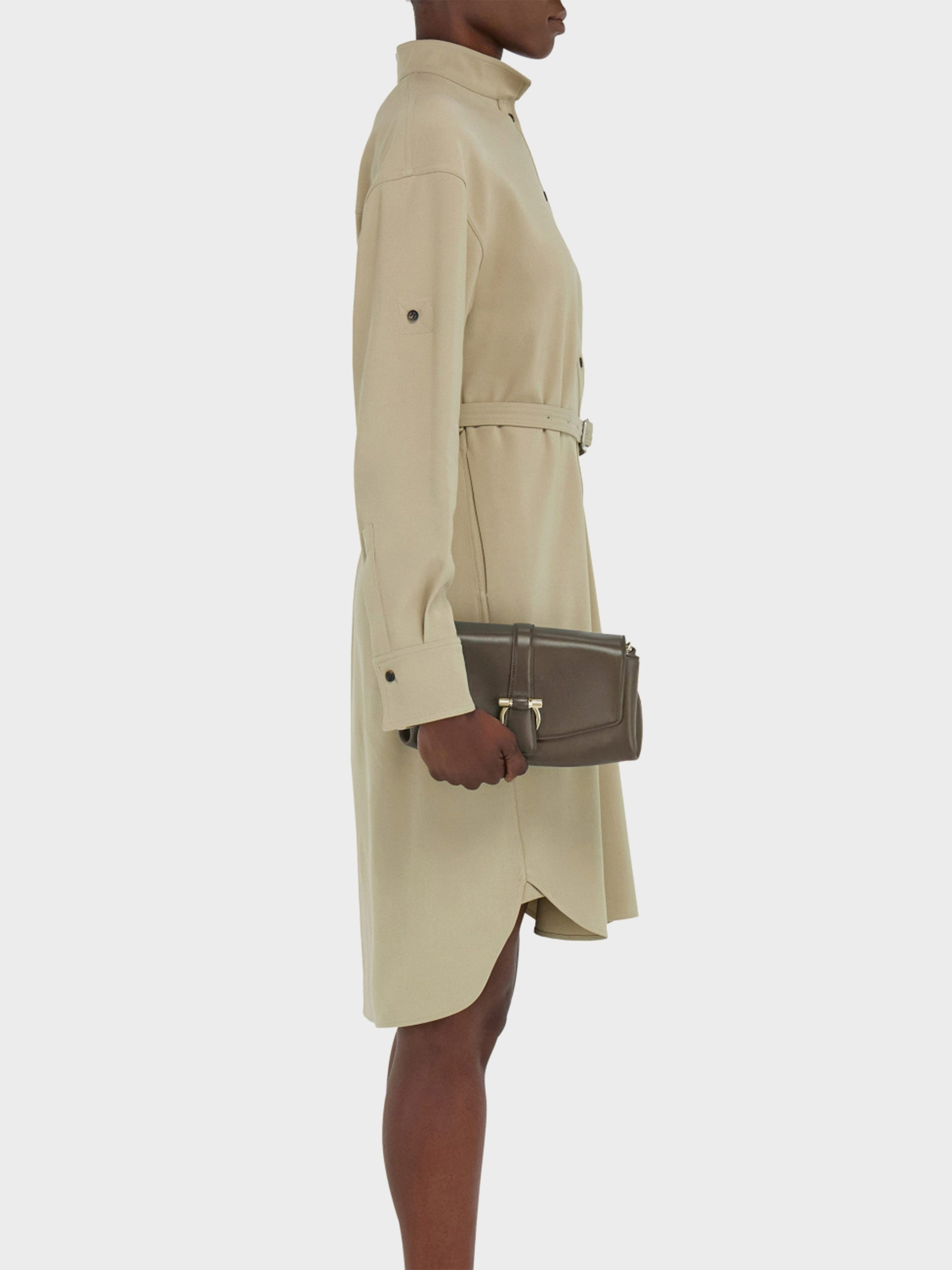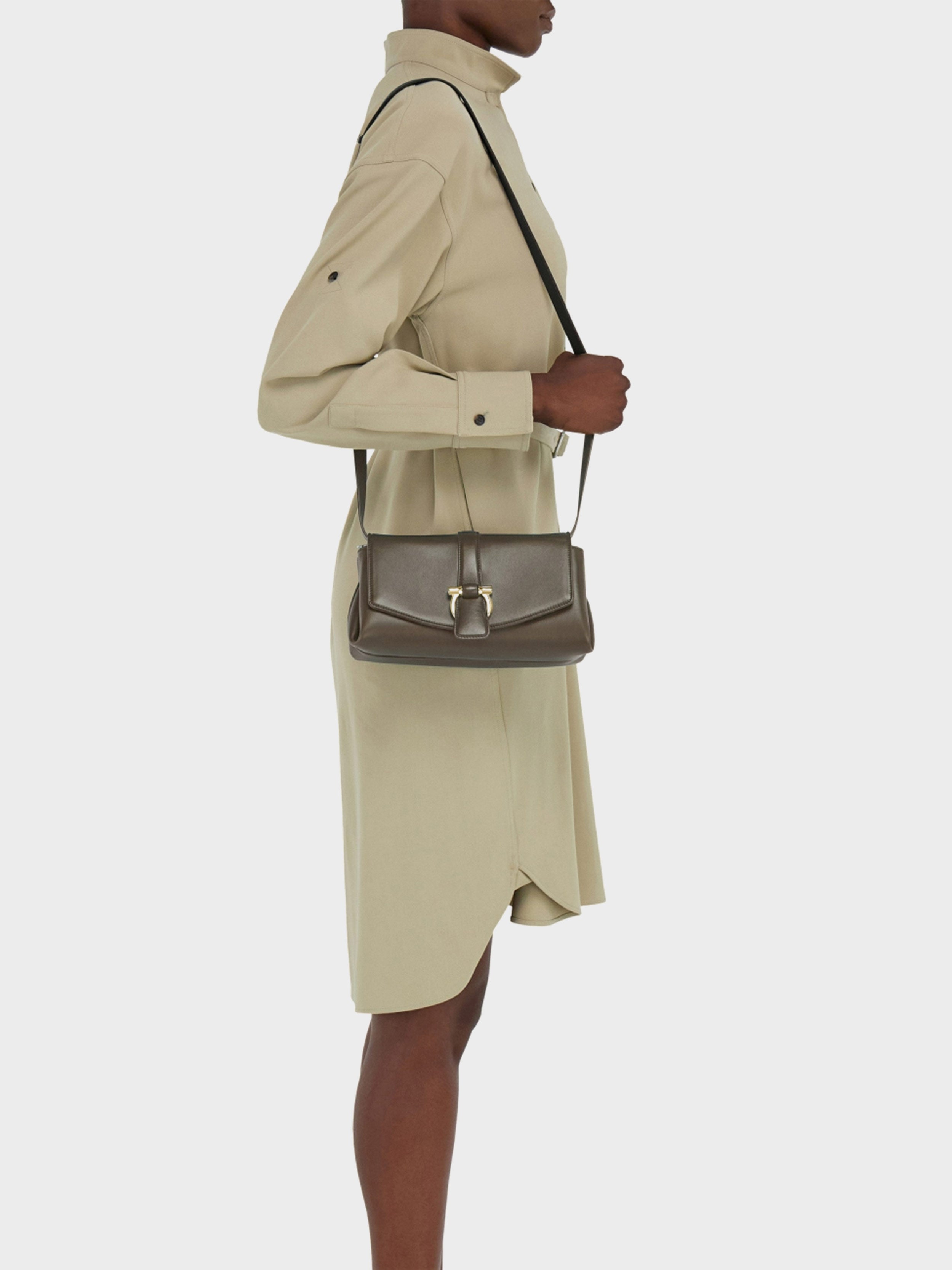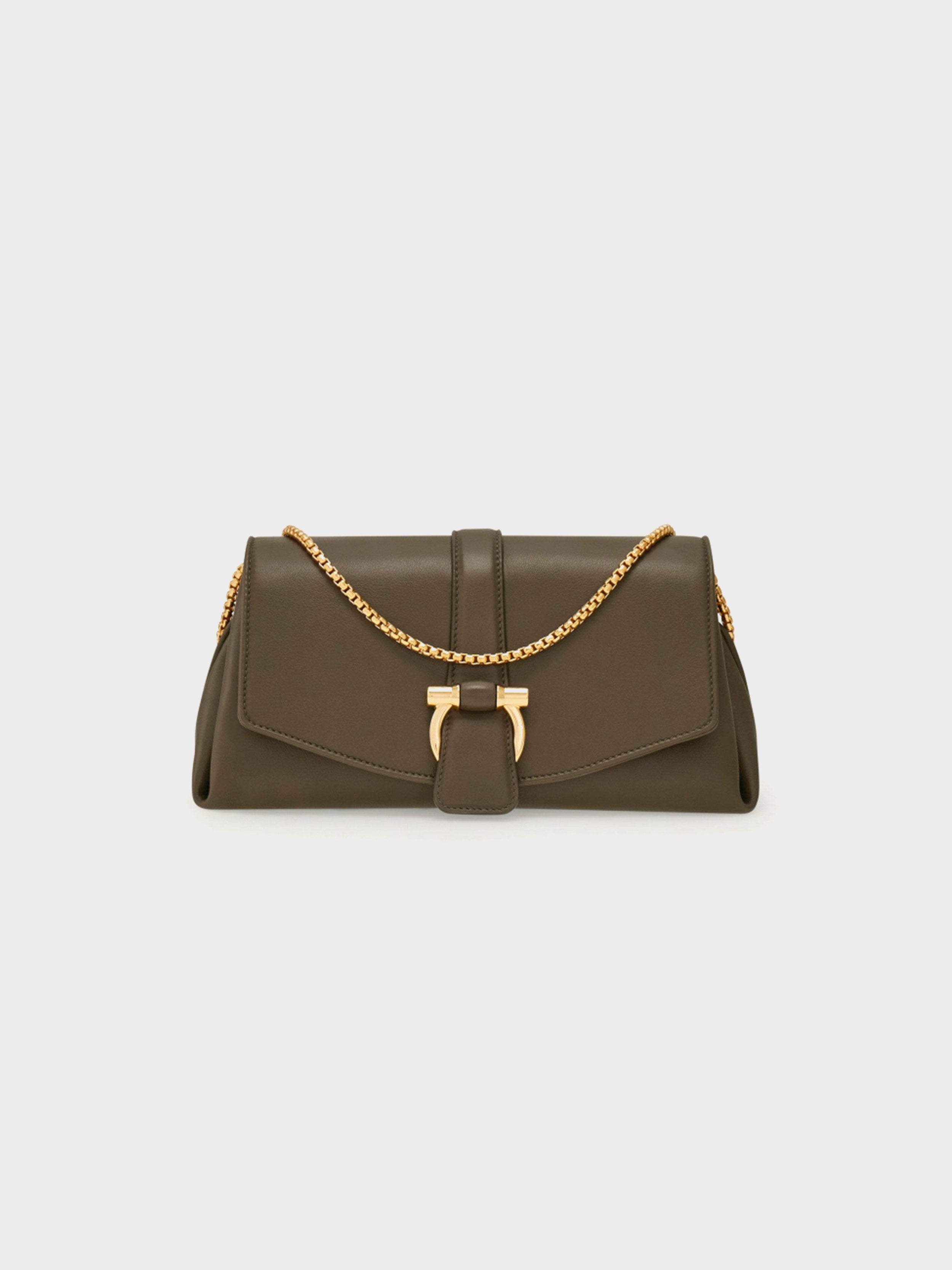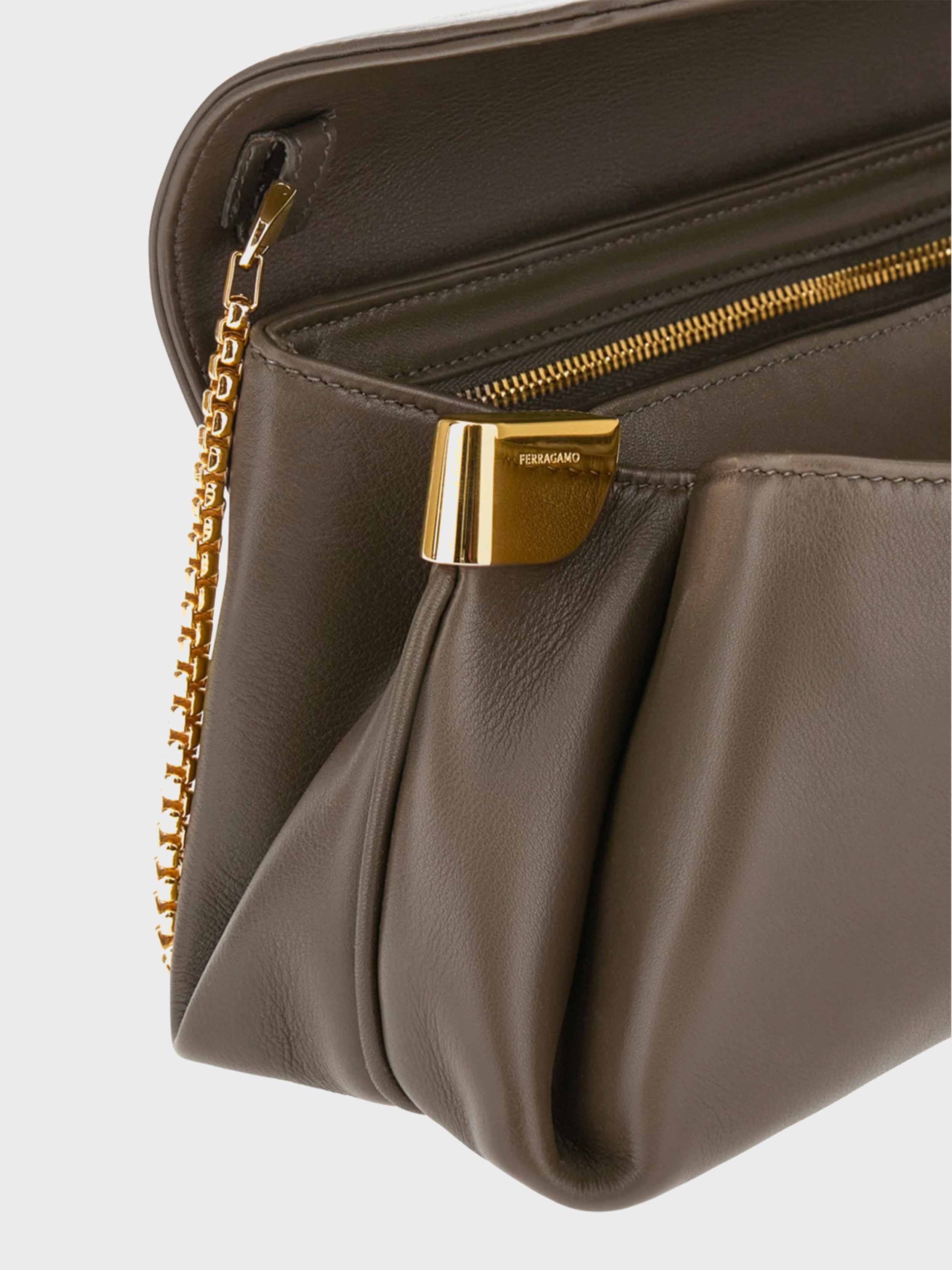 • Sumptuous folds and rich calfskin leather characterize this new cross body bag by Ferragamo. Punctuated by a golden Gancini clasp on the front flap, and golden tabs that gather the side bellows, it can be carried as a clutch, worn cross body or over the shoulder via the interchangeable leather and metallic straps.