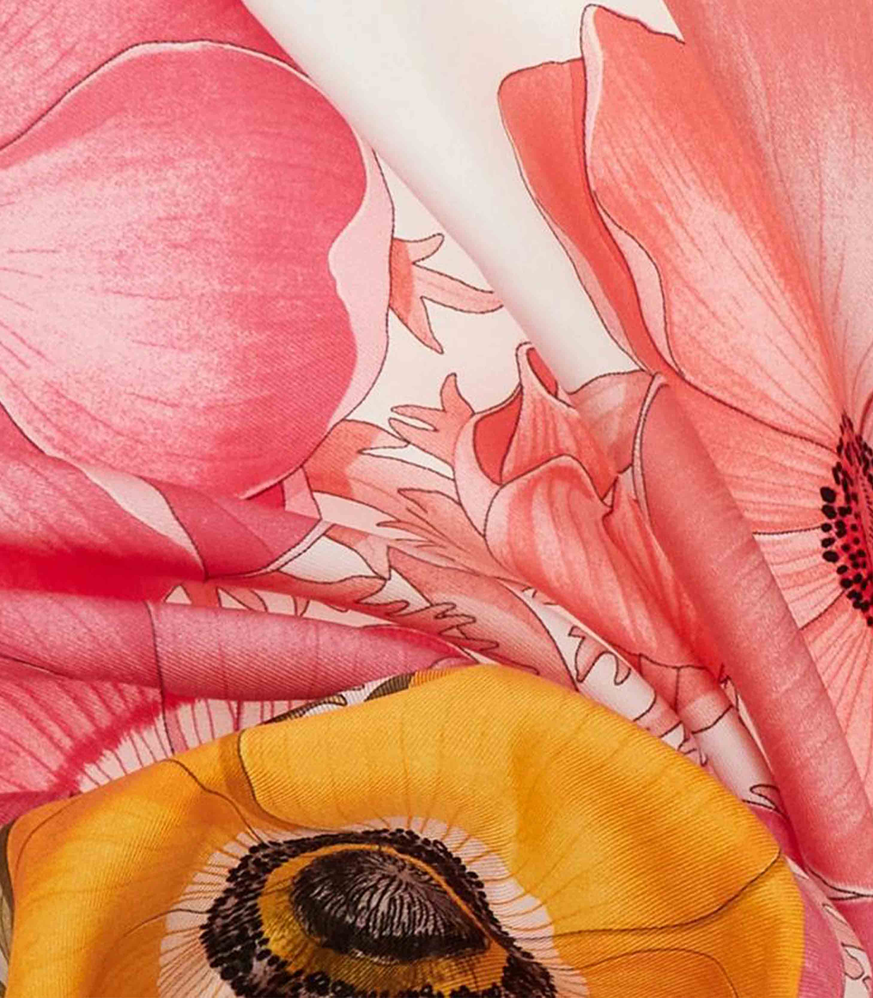 • The Anemone print, a floral archive pattern, is introduced with new proportions and a play of contrasting colors for a romantically hearted motif. The result is a versatile scarf, radiant in its shades, and contemporary in its contrasting color treatment.