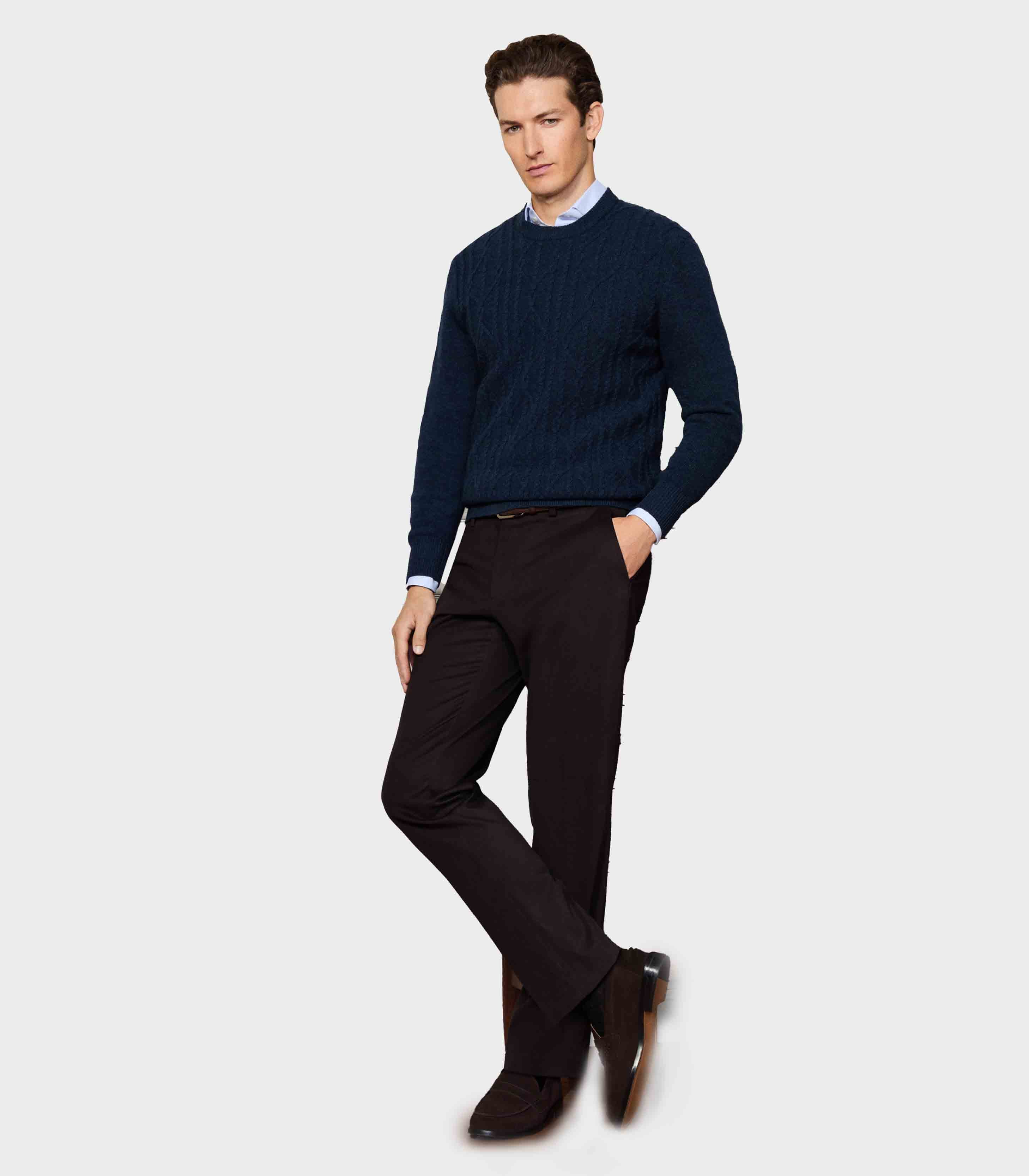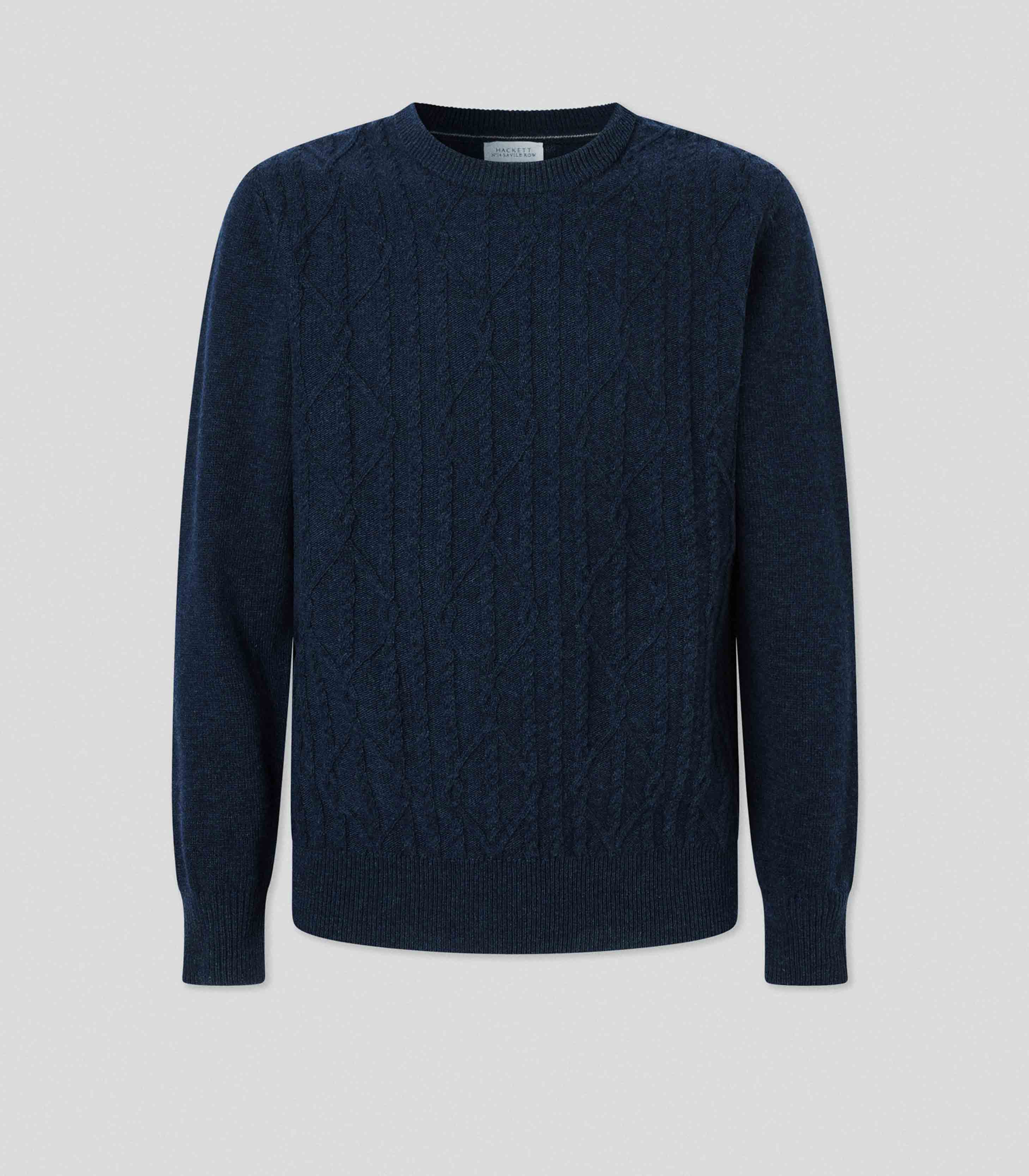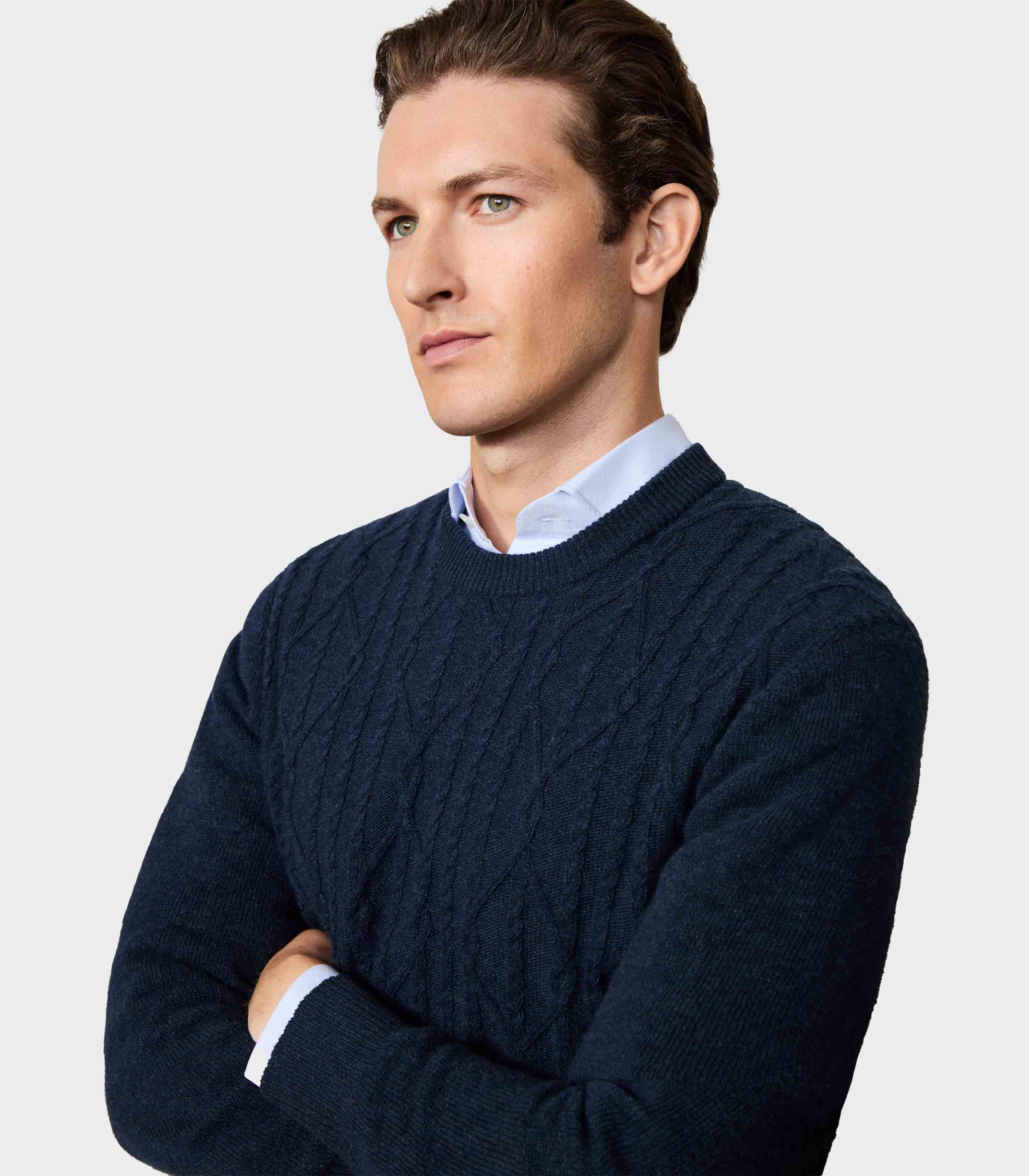 • Luxurious jumper made from a blend of wool and cashmere from sustainable sources with cable knit details. Smooth knit sleeves that are comfortable and stylish, perfect for layering under outerwear. Available in mottled denim blue and mottled ecru. Italian yarn. Garment crafted in England.