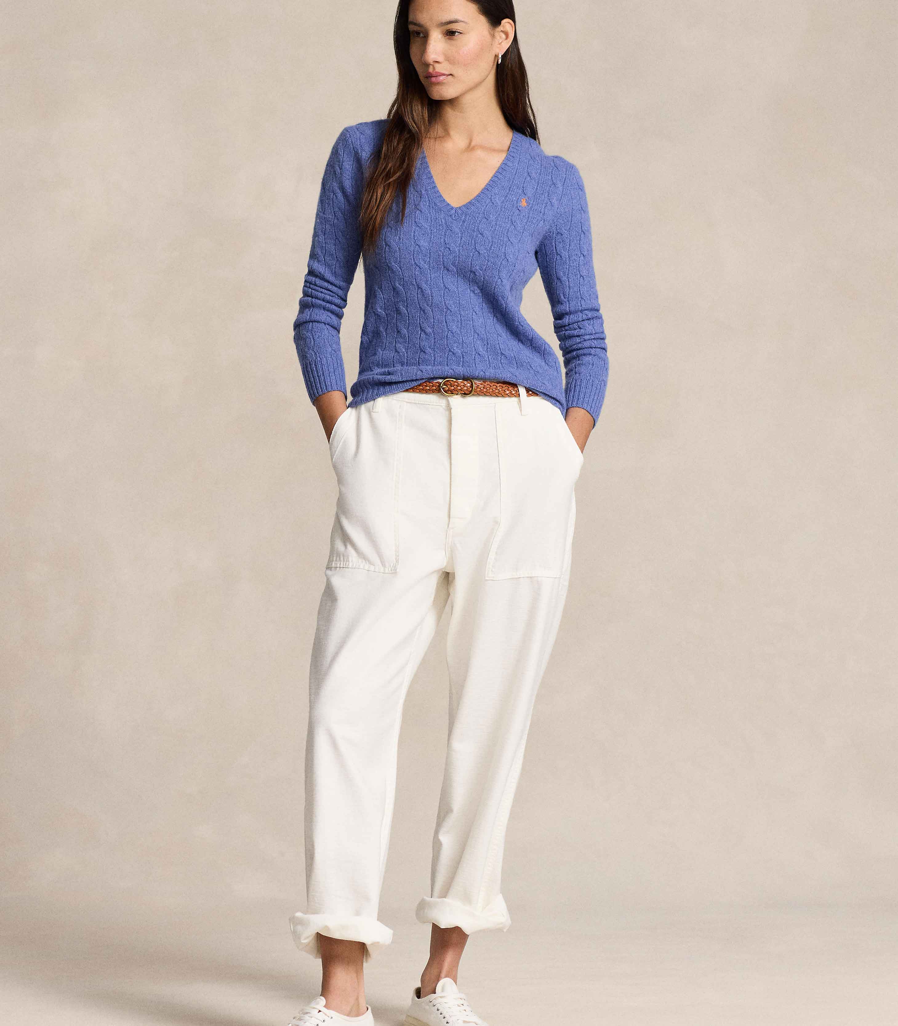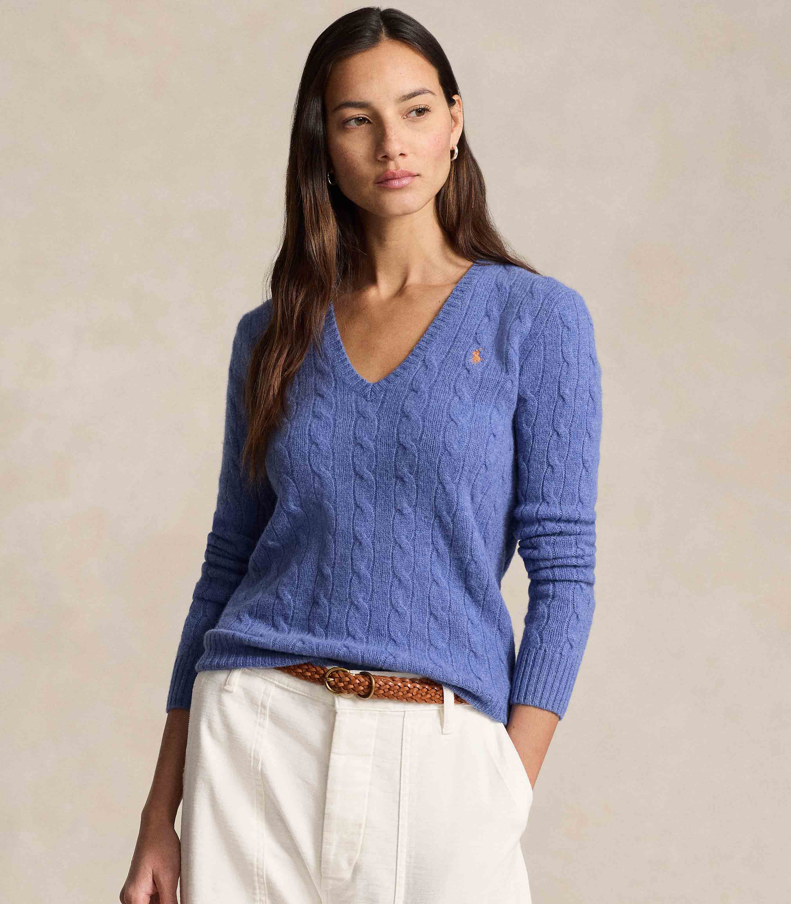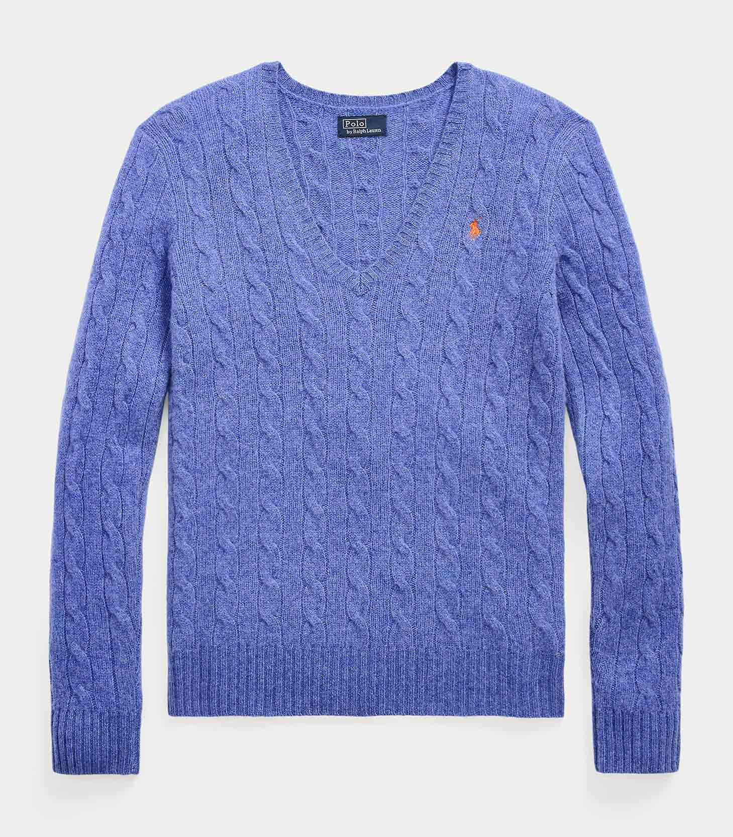• Cable-knit with a soft wool-and-cashmere-blend, this medium-weight V-neck jumper is designed in a slim silhouette and accented by our signature embroidered Pony.
