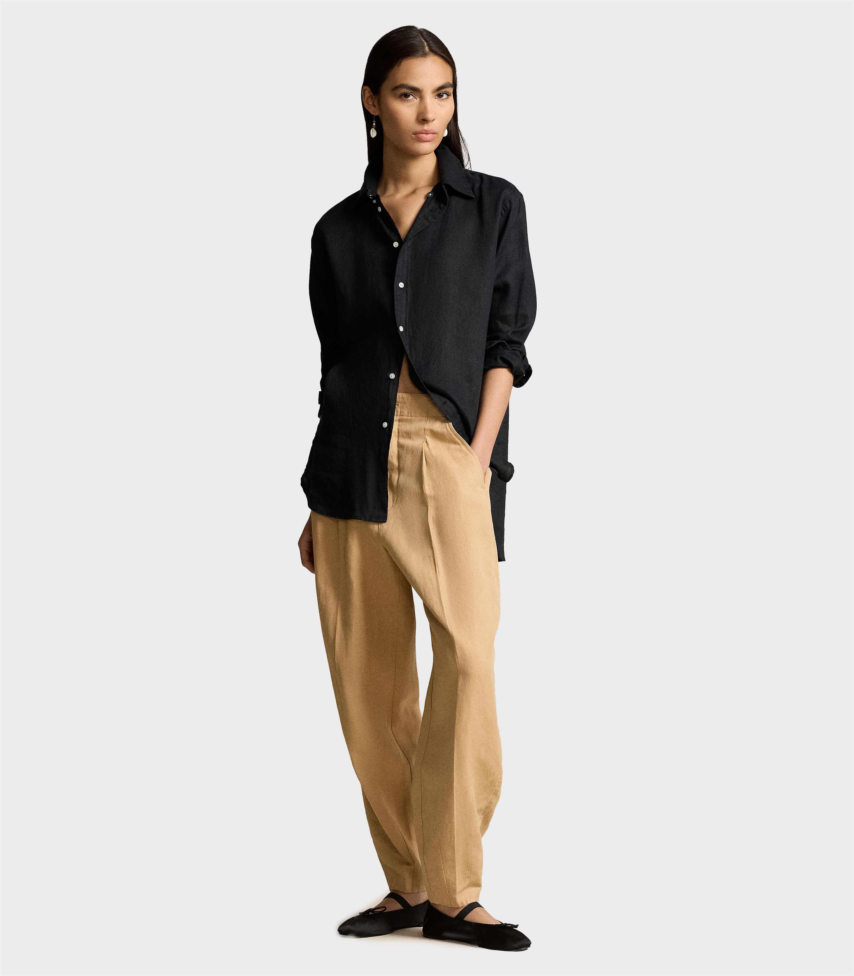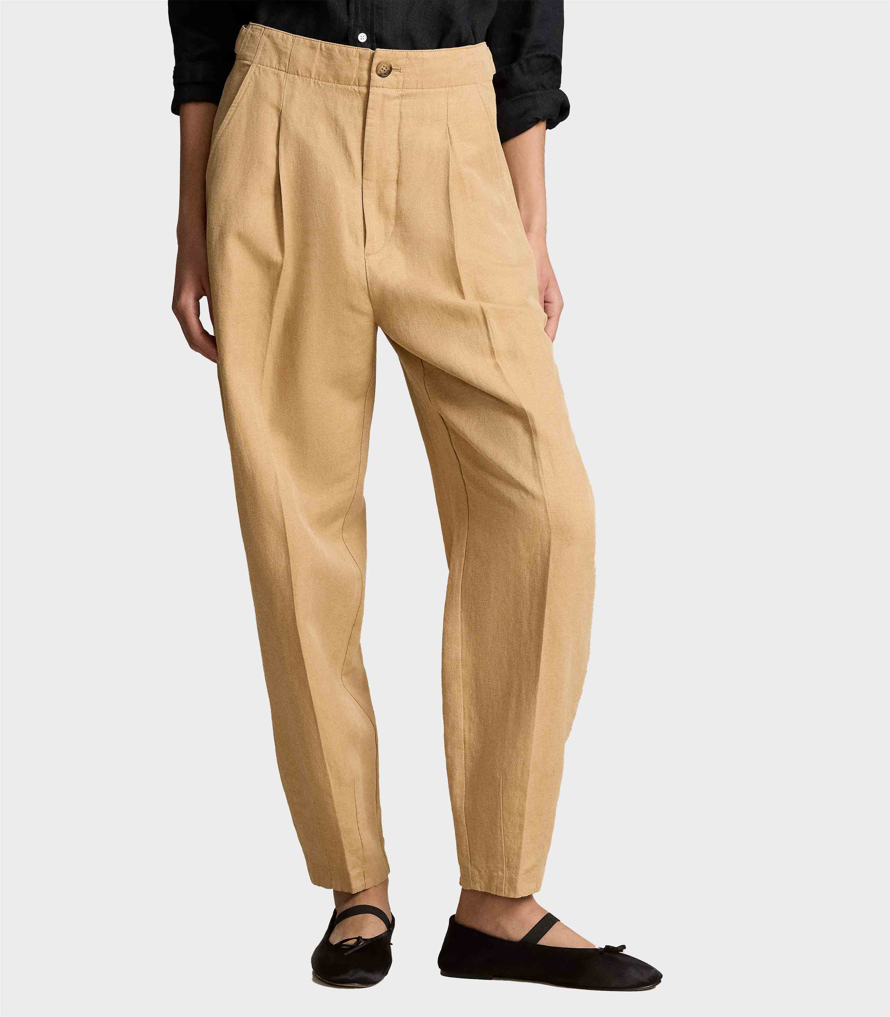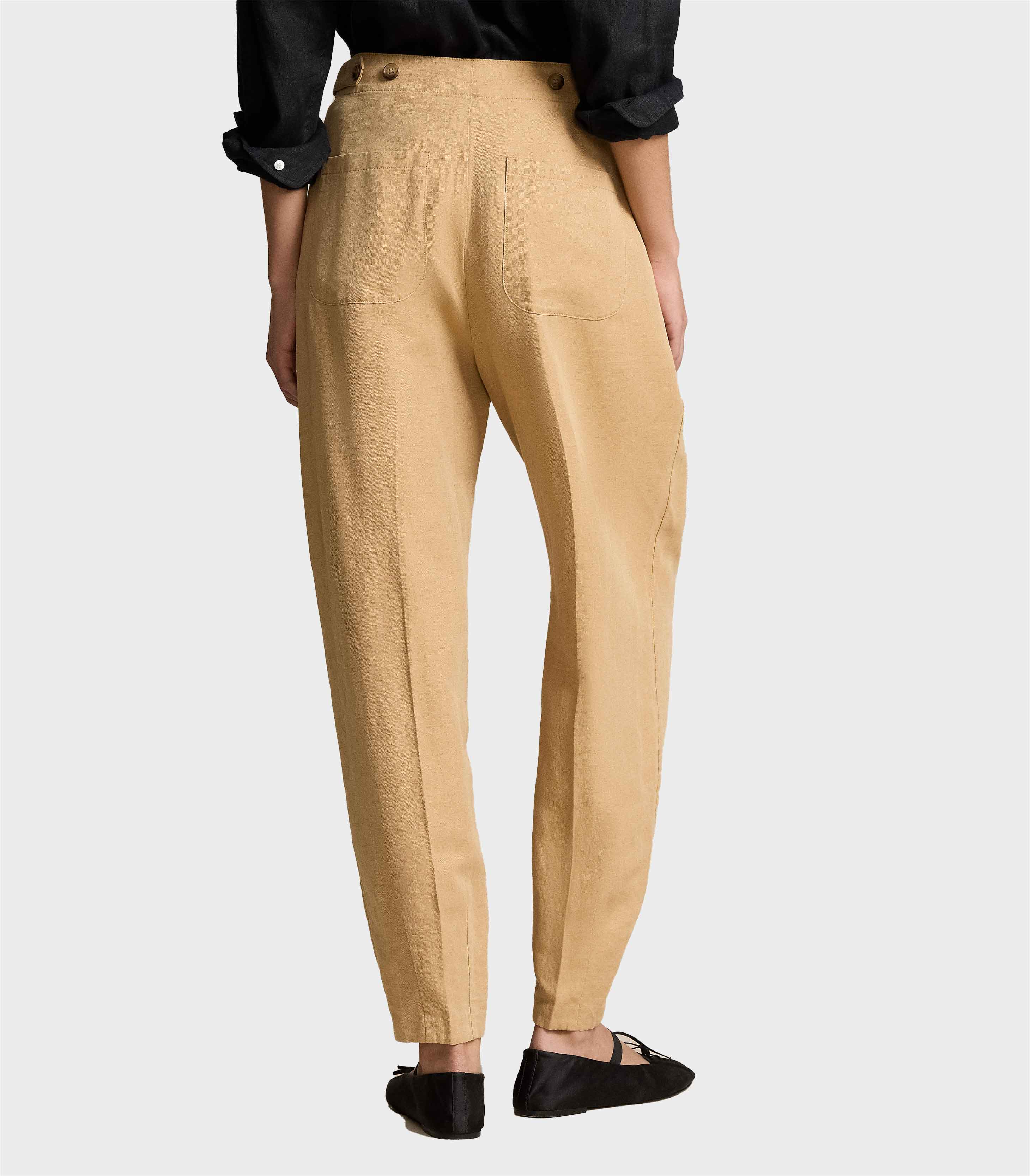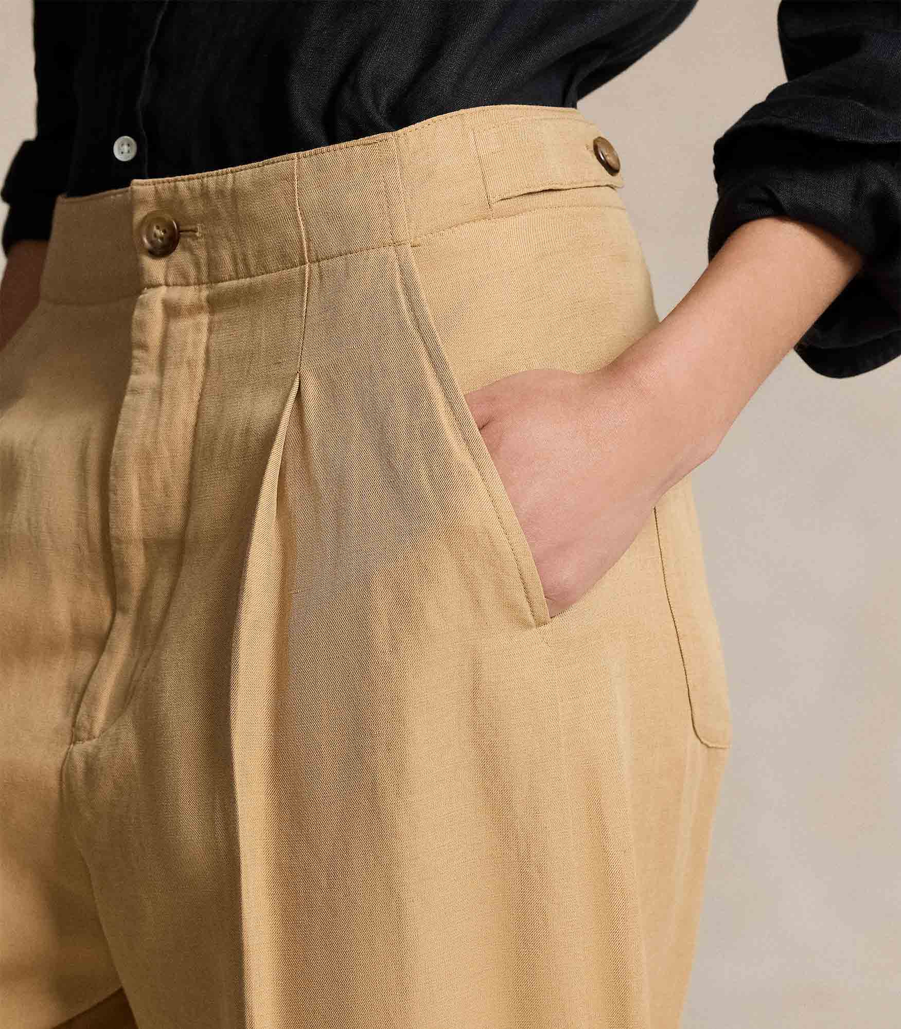 • Front waist pleats. Creases run down the front and back of each leg. Back waist darts.