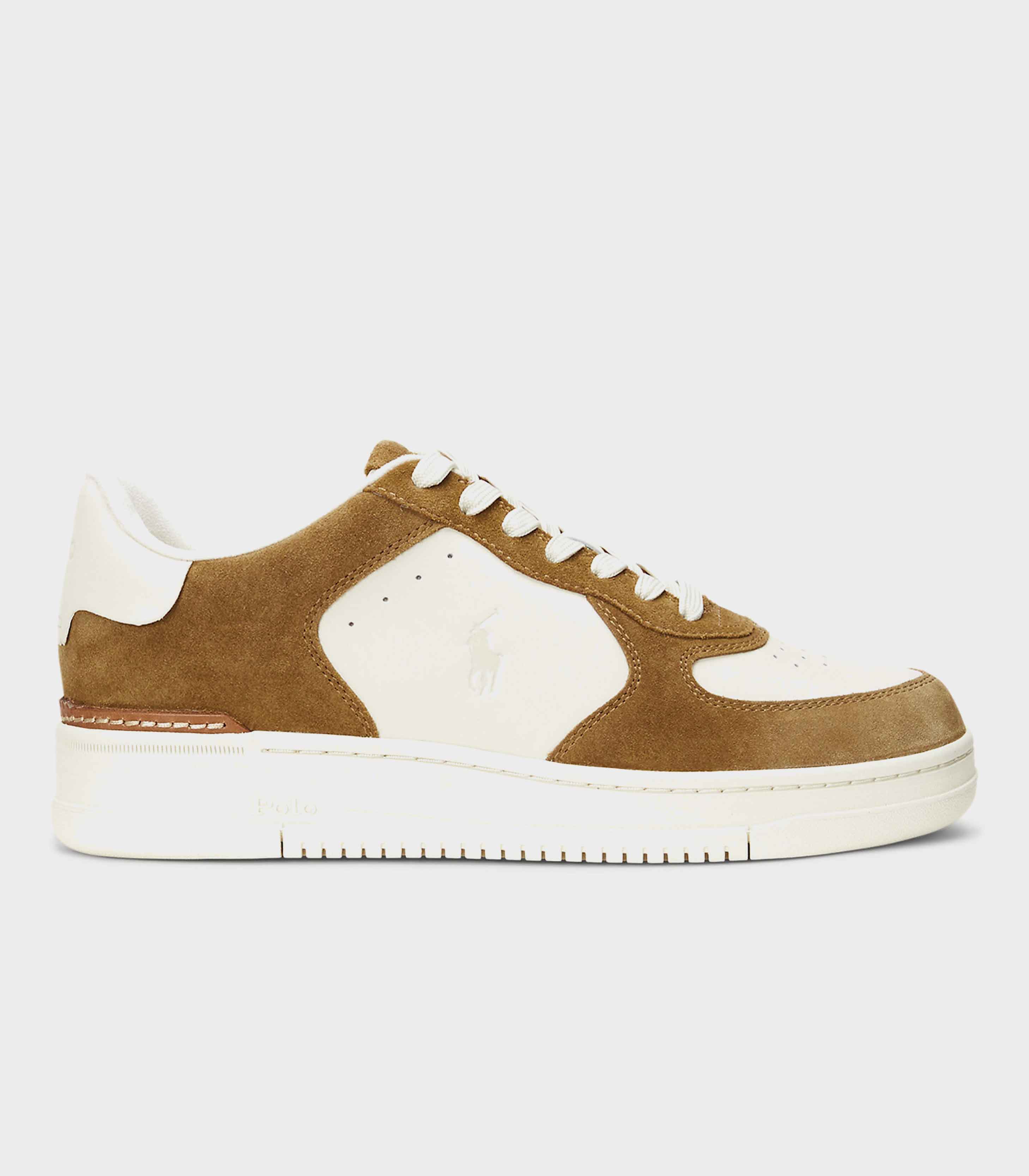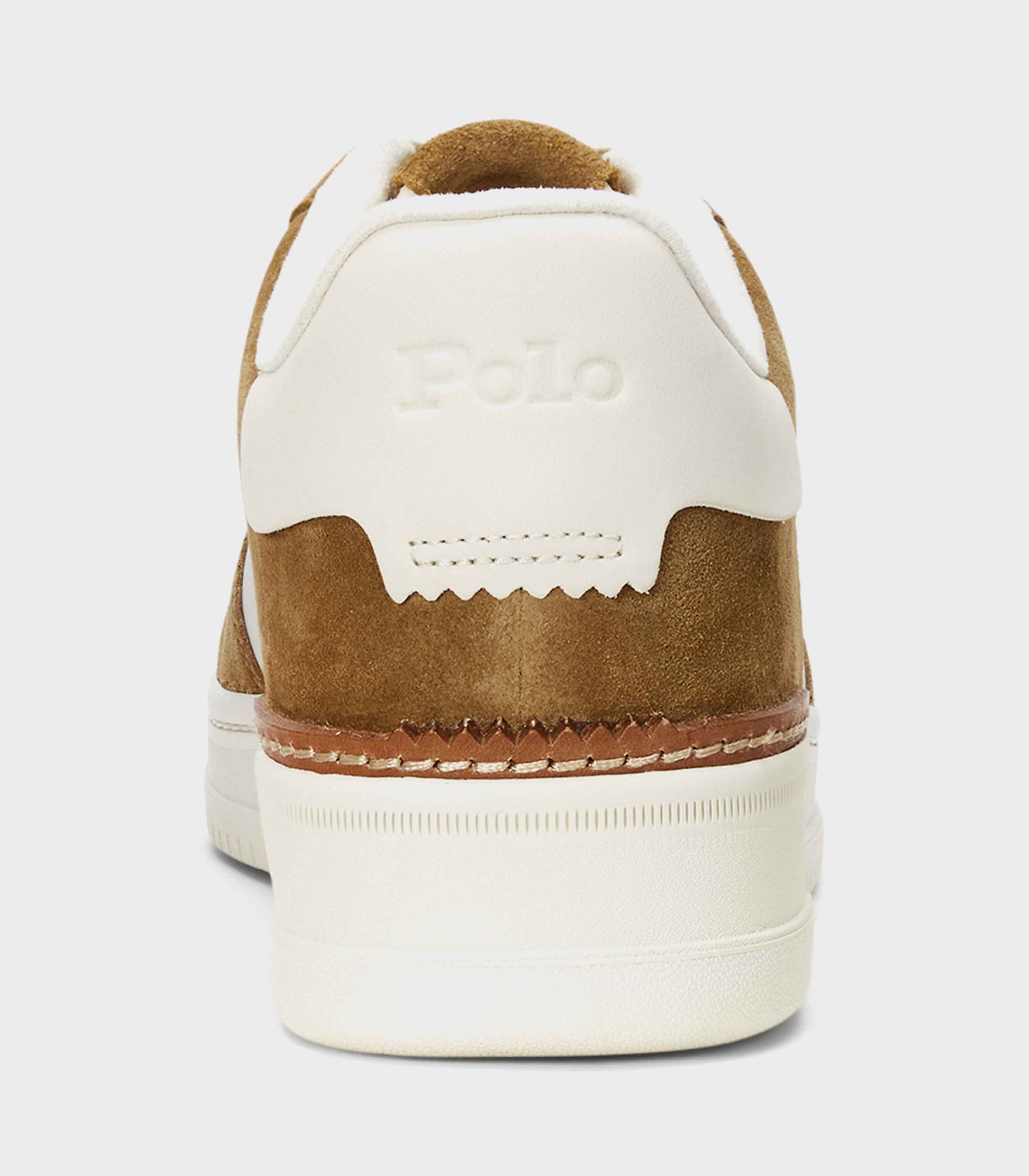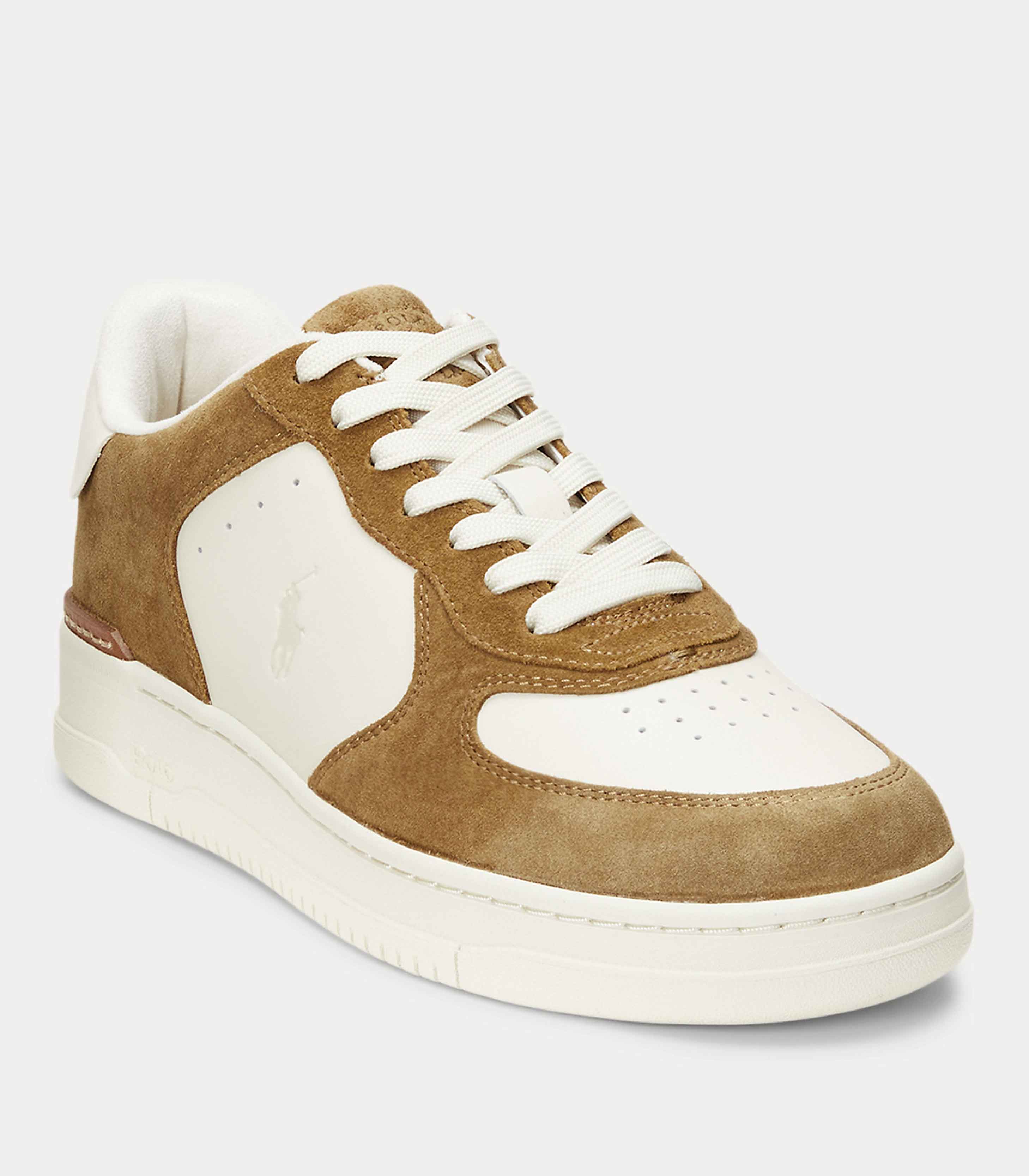 • The Masters Court elevates Polo's classic low-top trainer, adding a leather heel clip, an EVA midsole and a substantial sole. The suede-and-leather upper combines streetwear design elements like a perforated vamp with subtle logo detailing.