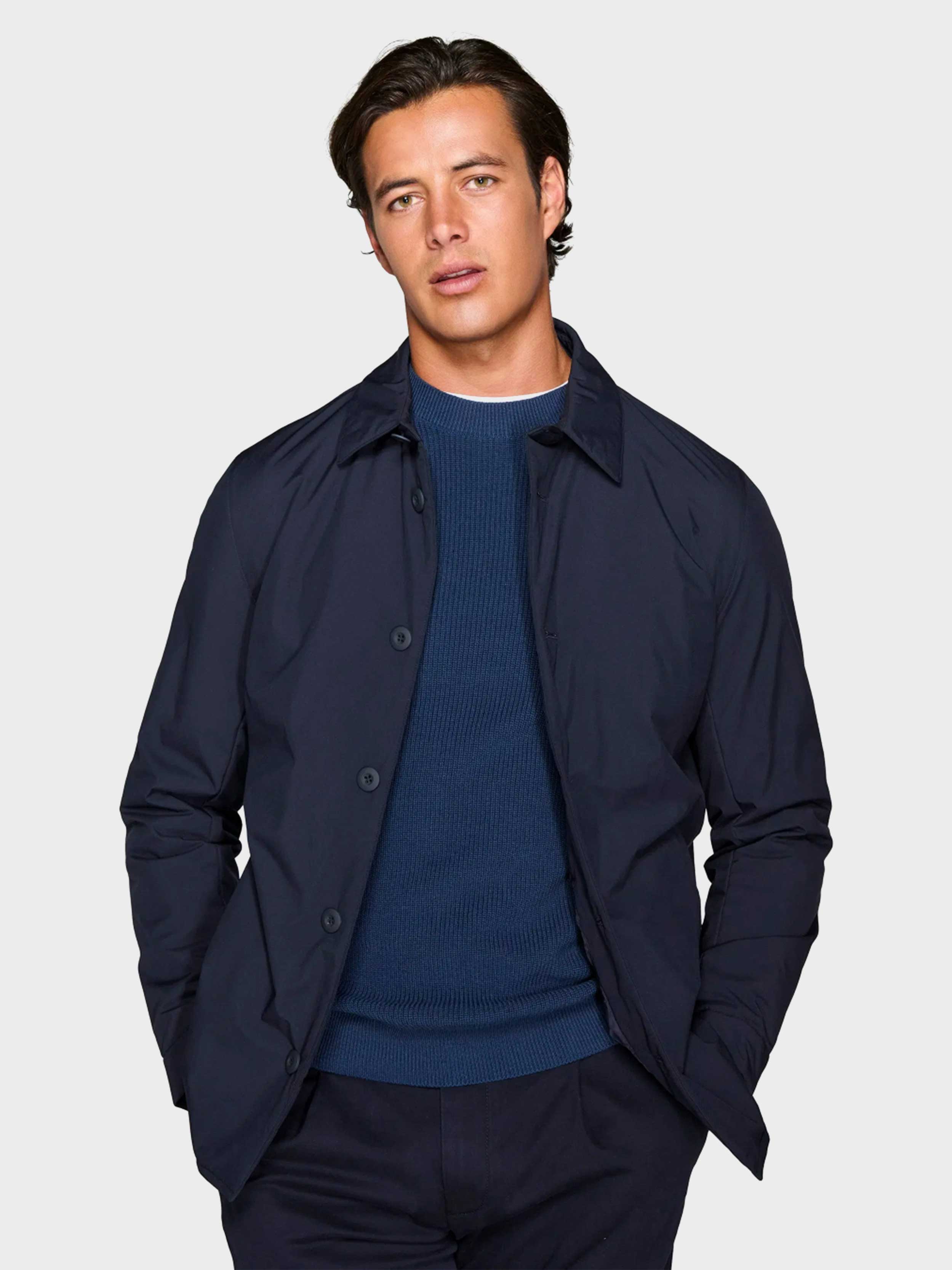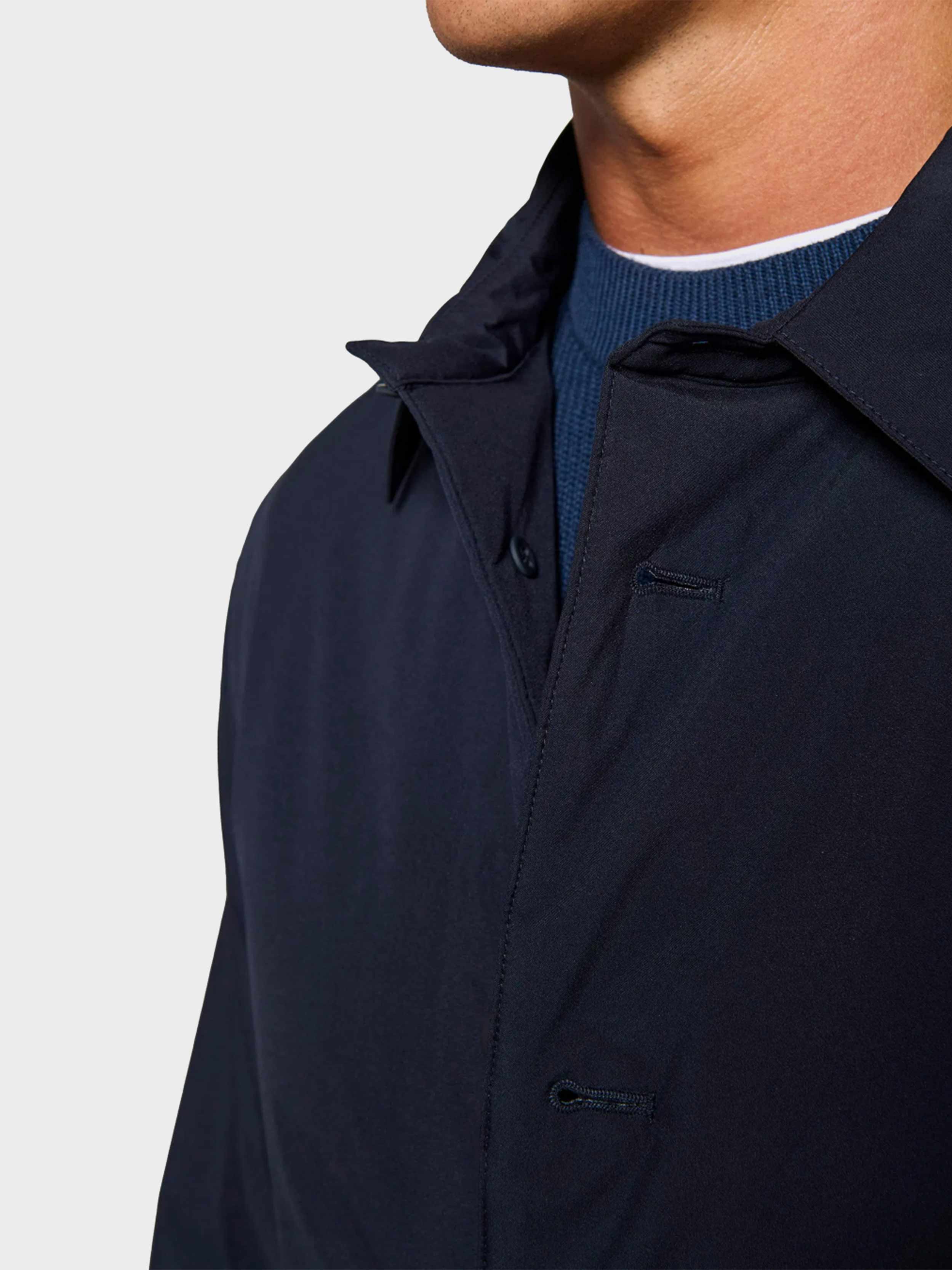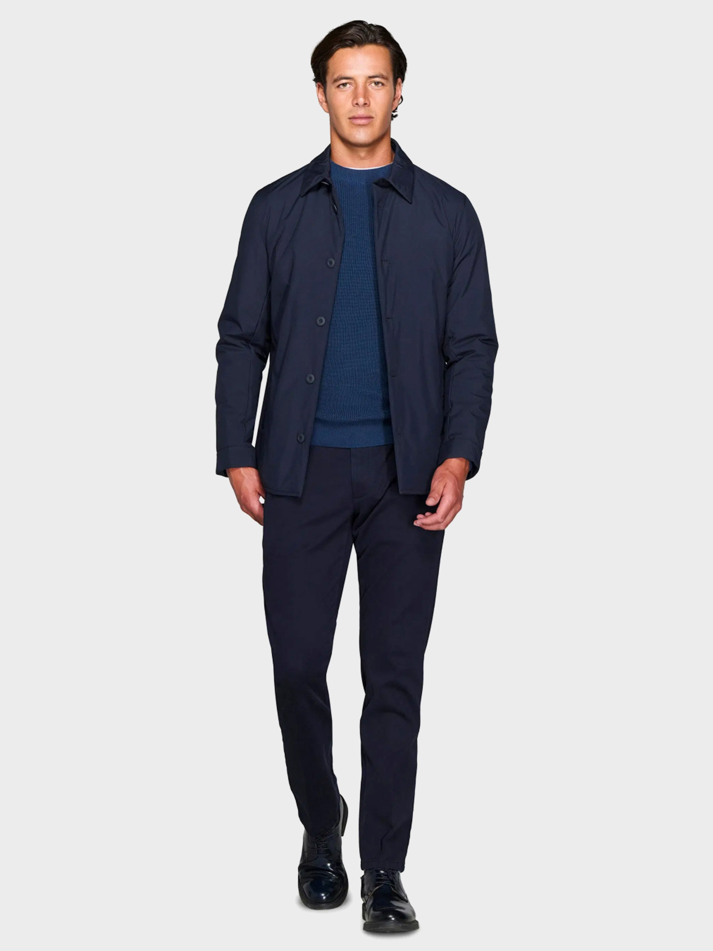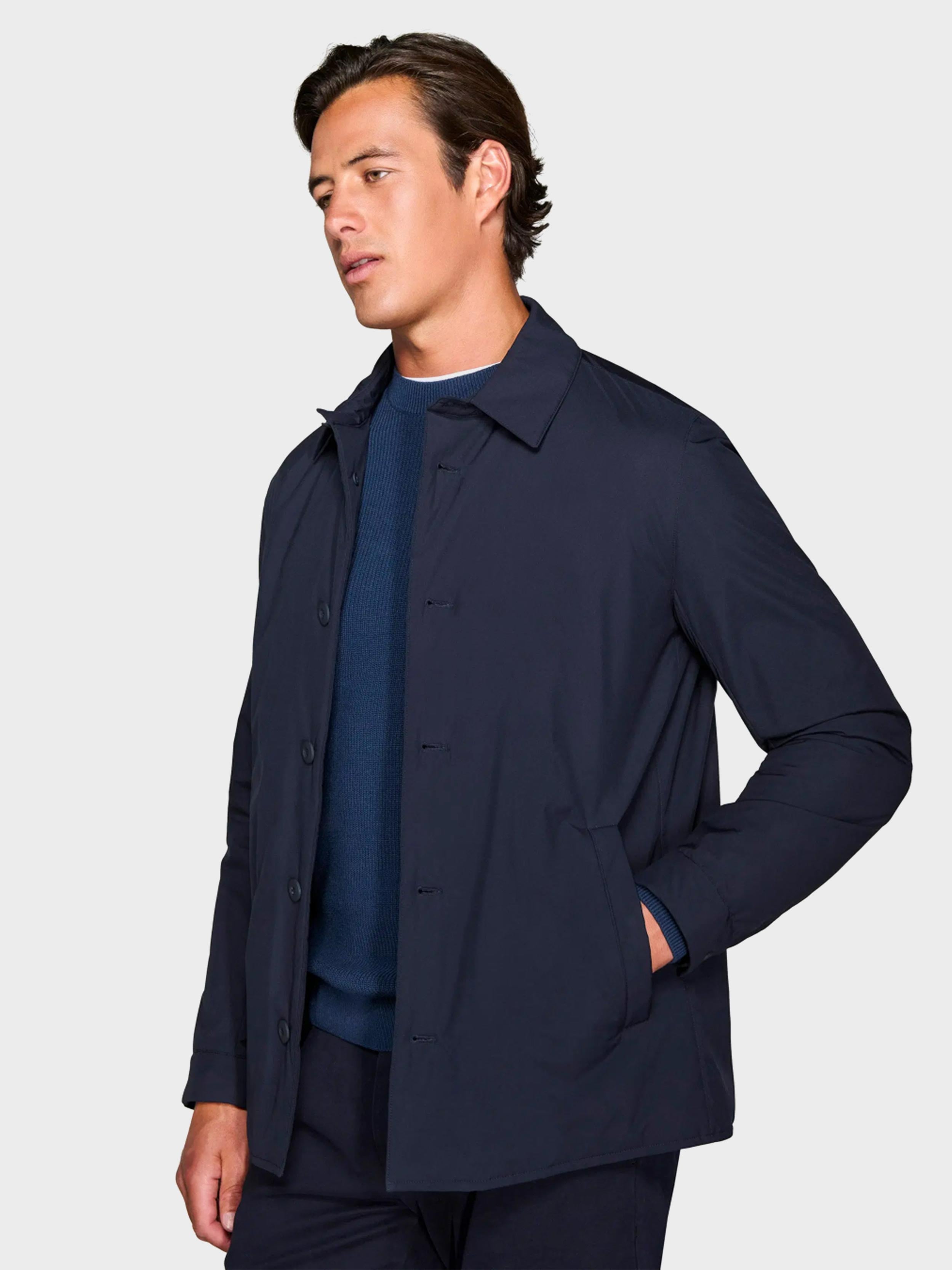 • Made with two front sewn welt pockets, double interior pocket, visible button closure and buttoned sleeves.