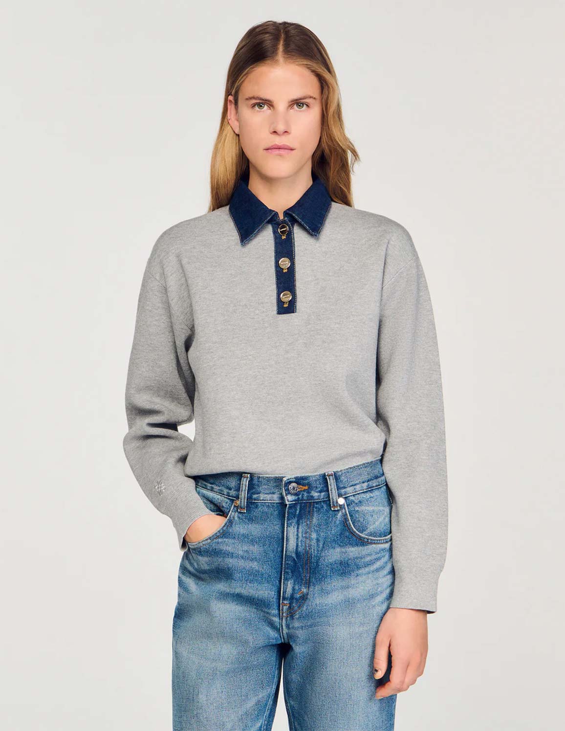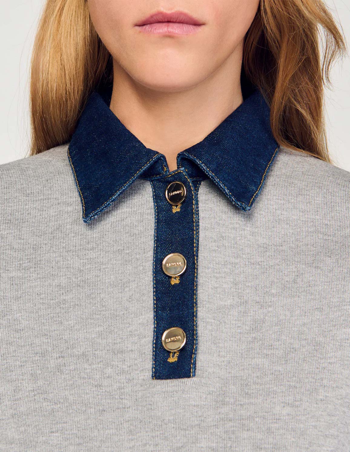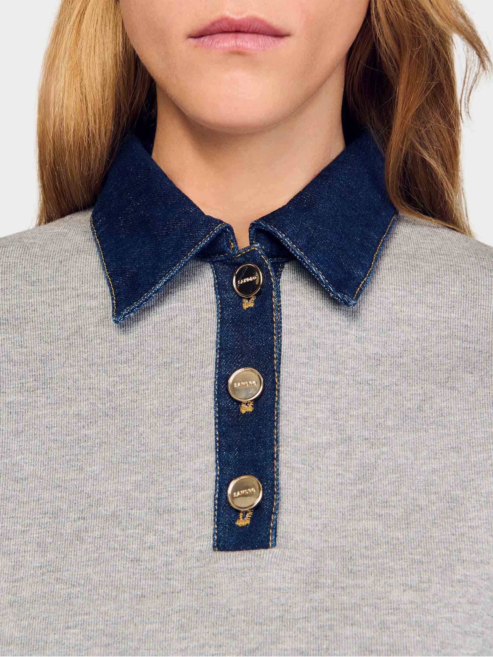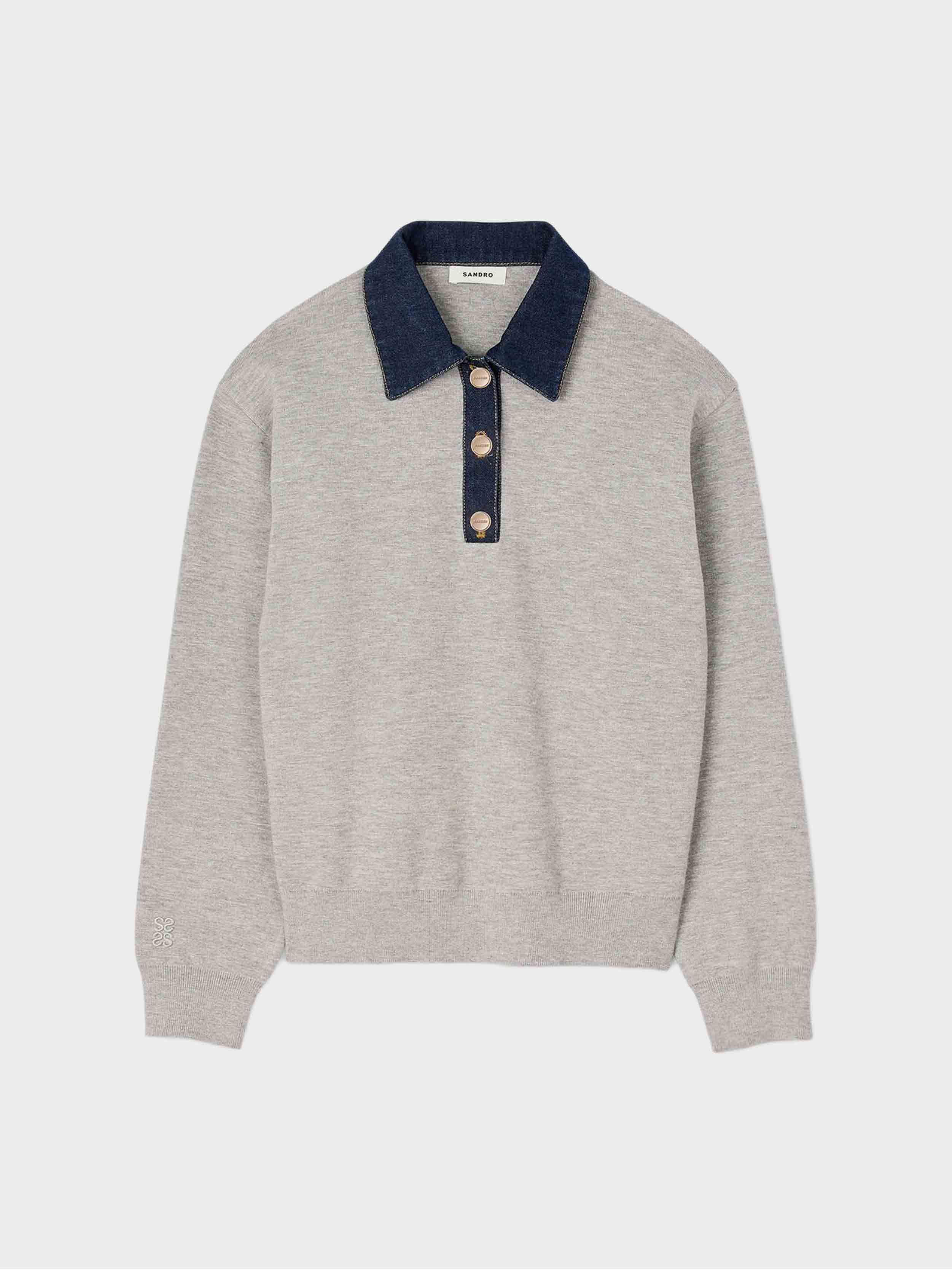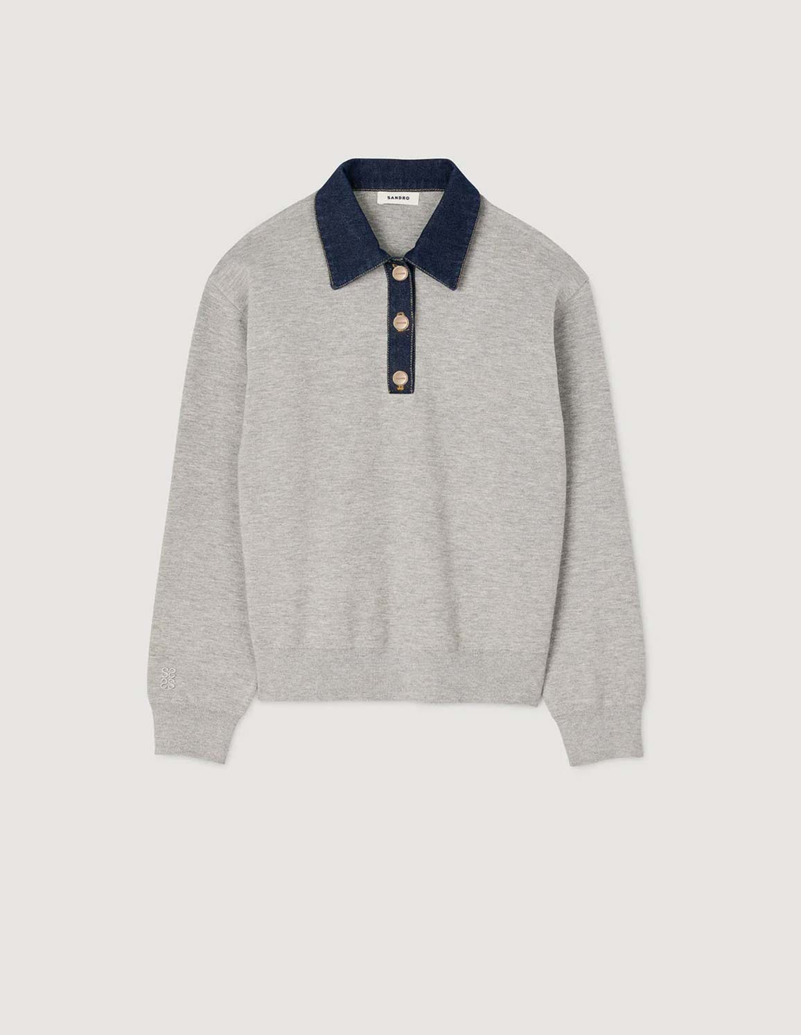 • Knit jumper with denim button-down polo collar neck and long sleeves with gathered cuffs.