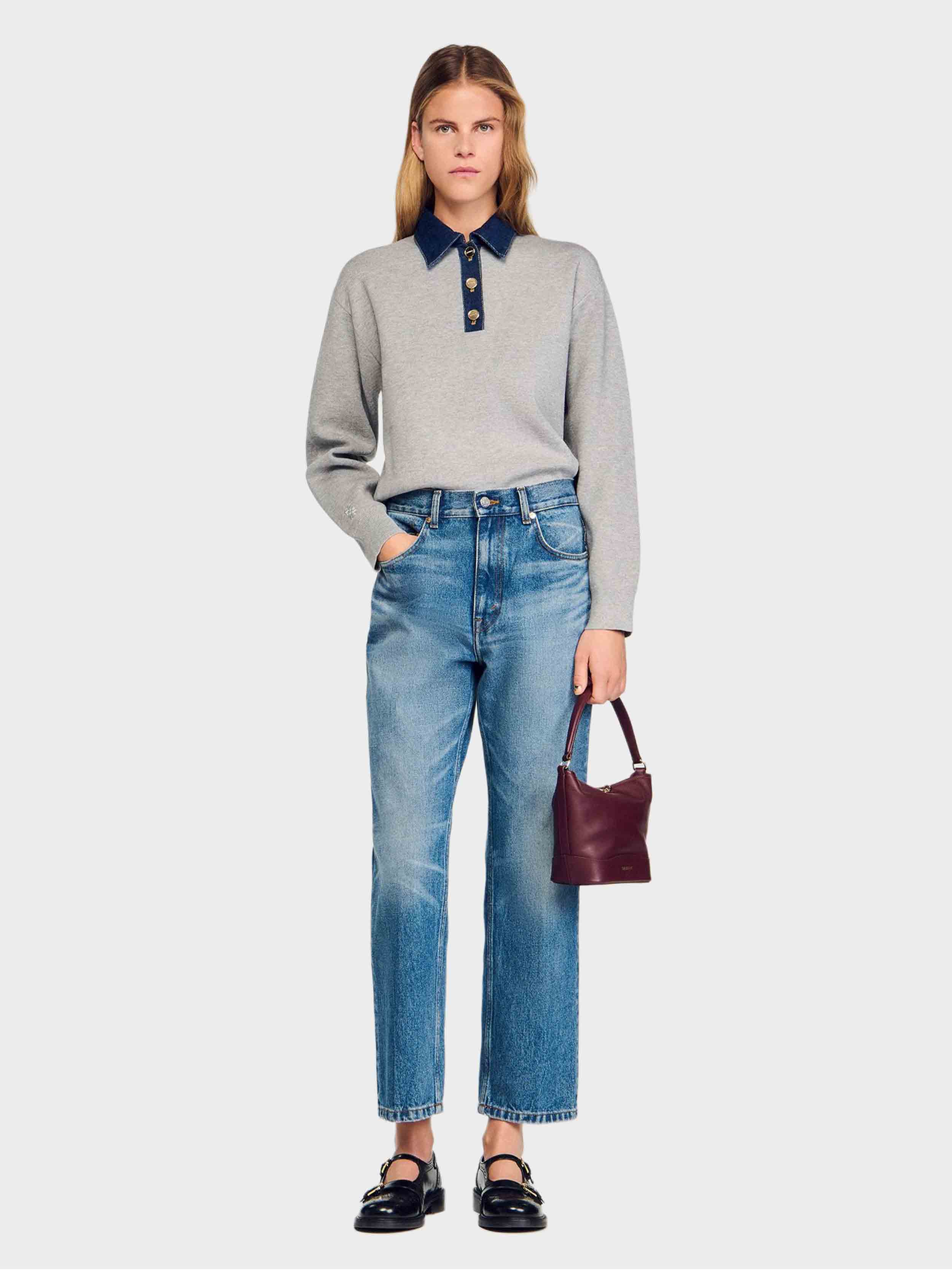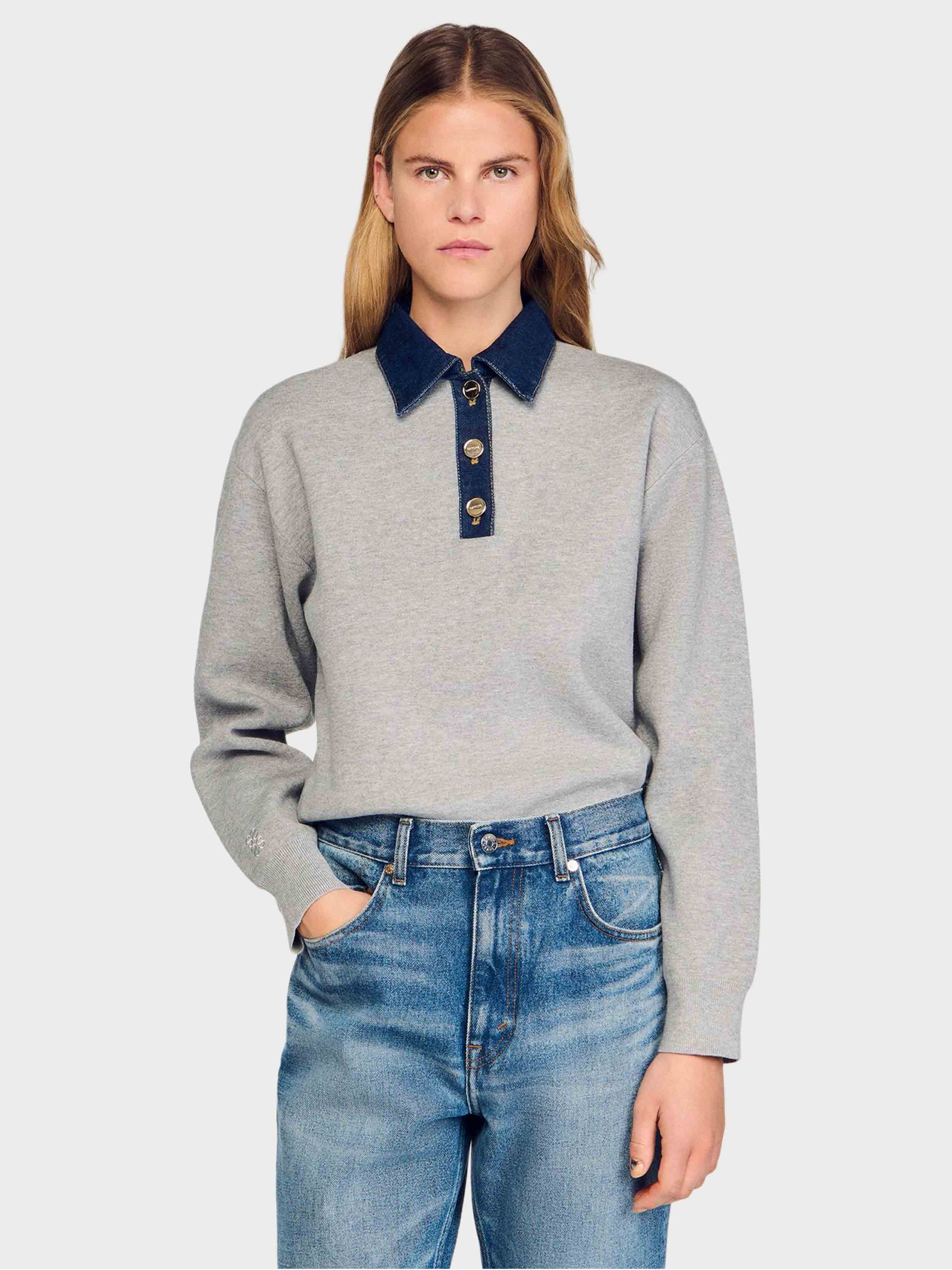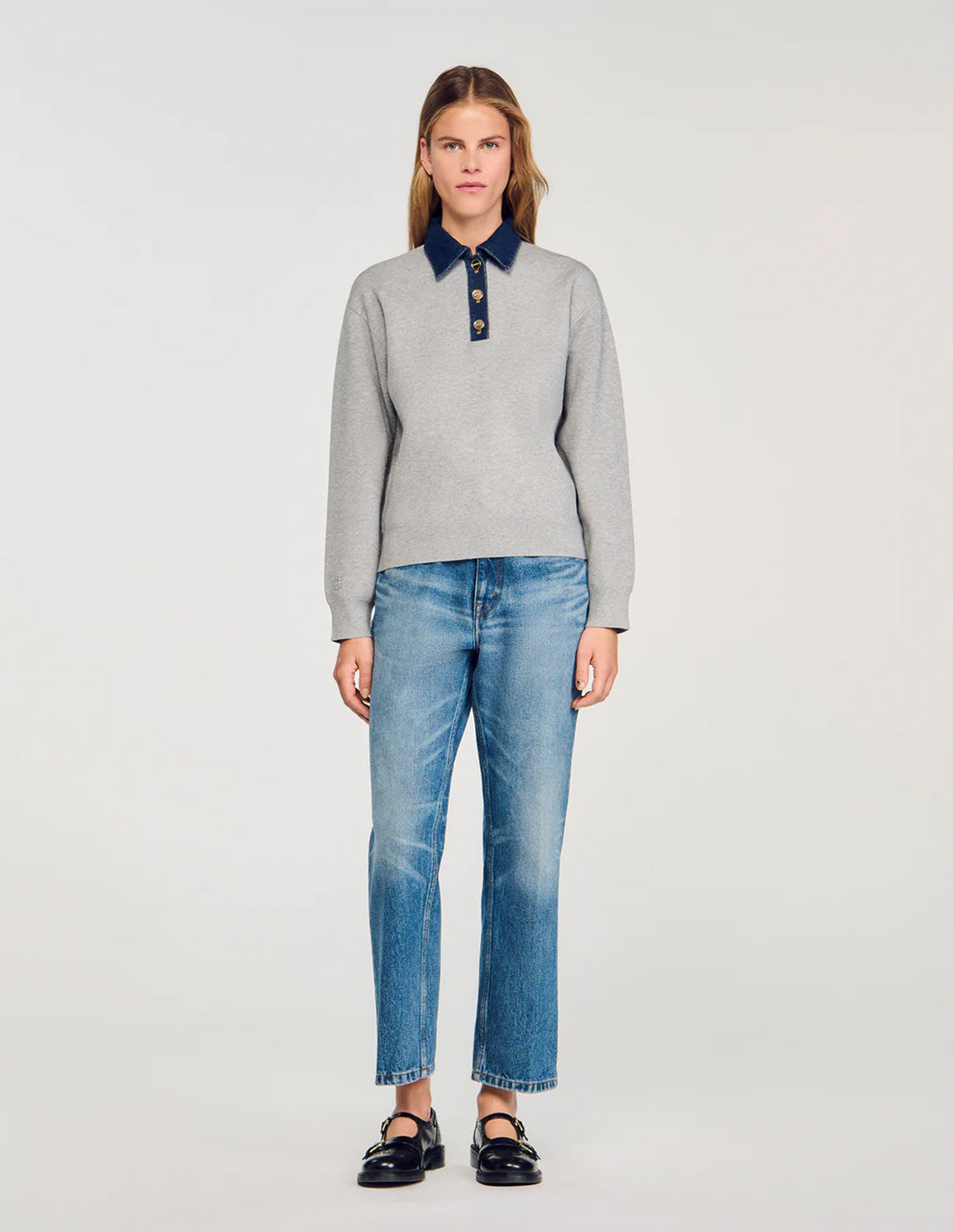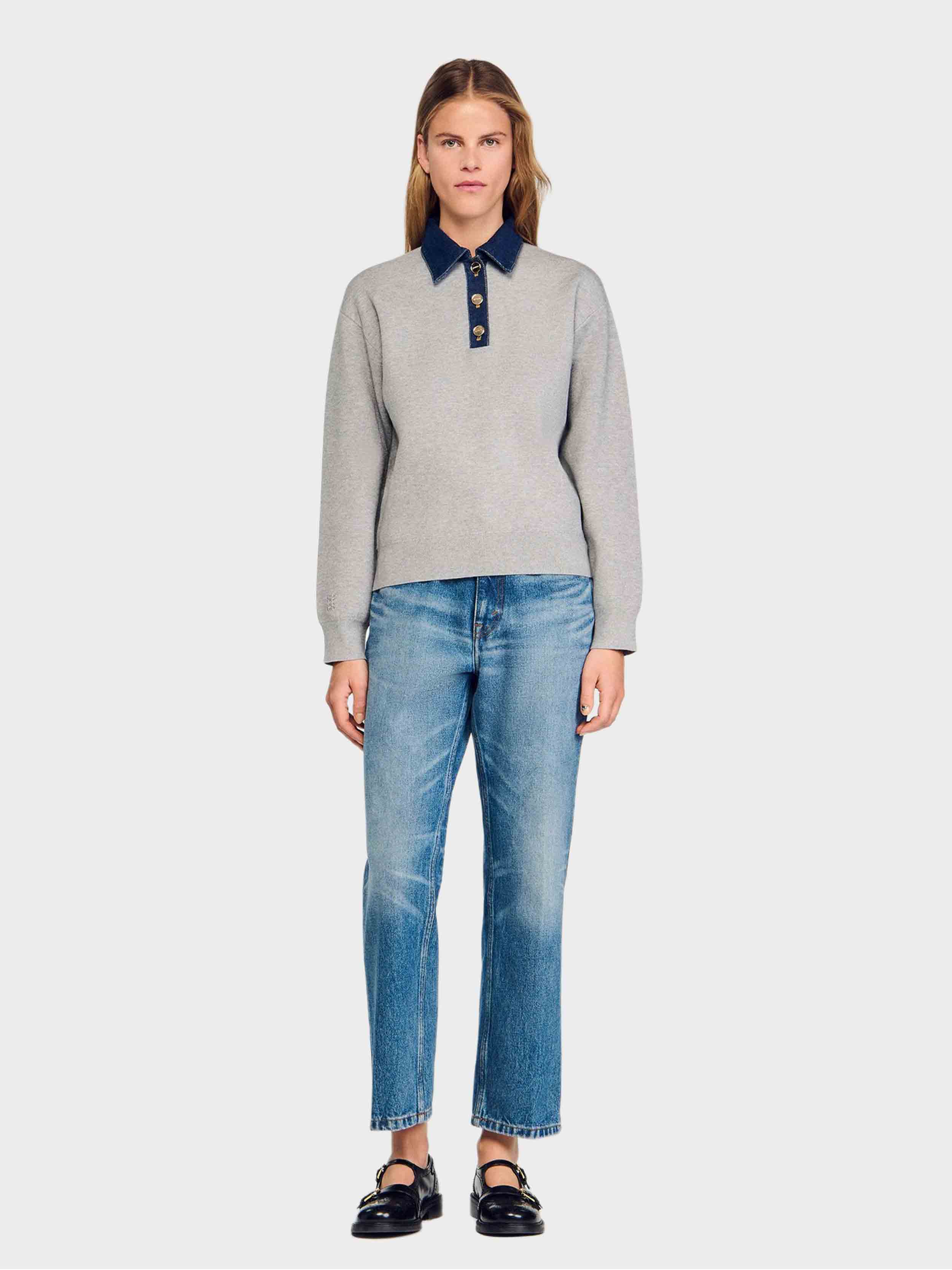 • Knit jumper with denim button-down polo collar neck and long sleeves with gathered cuffs.