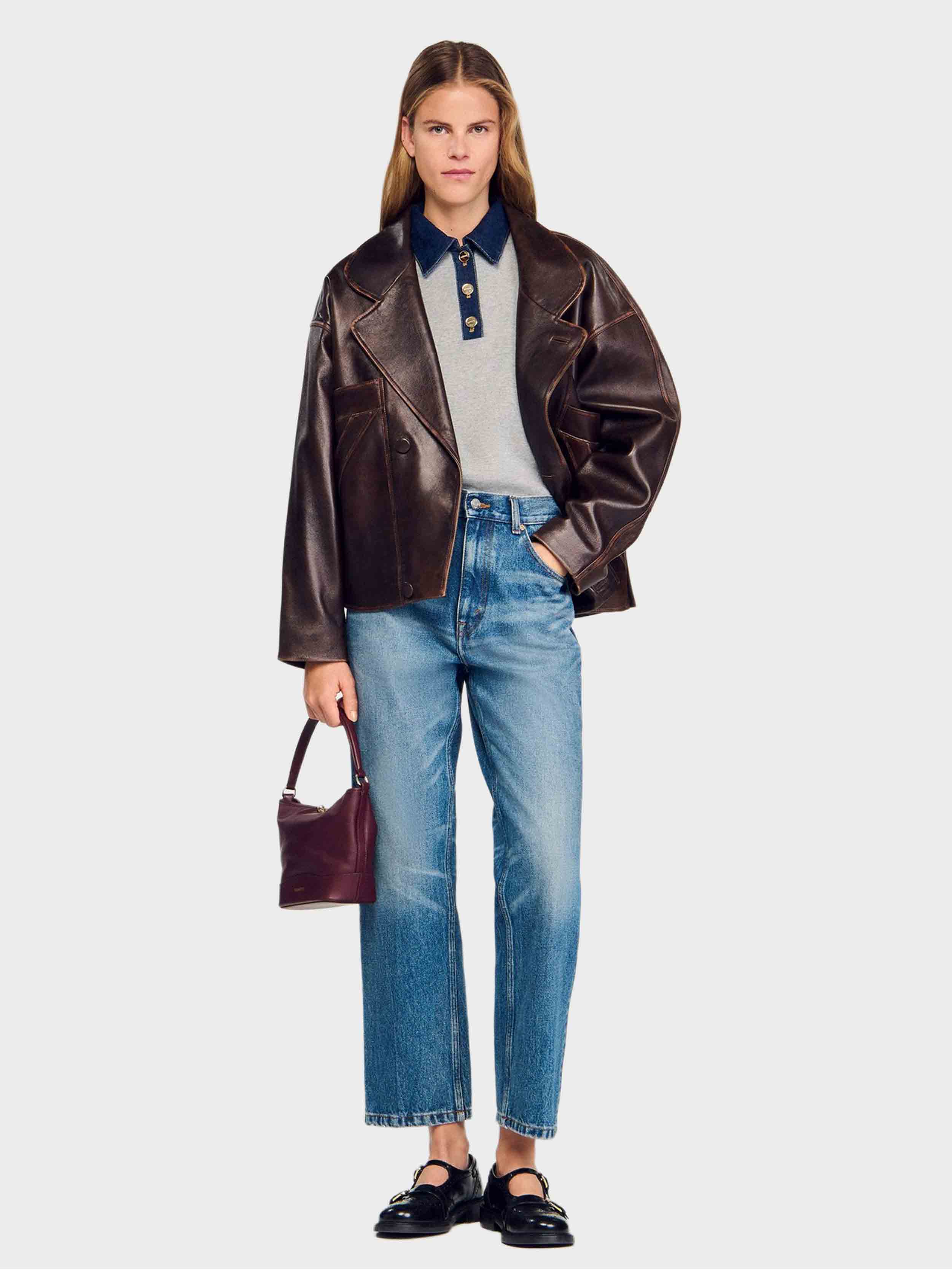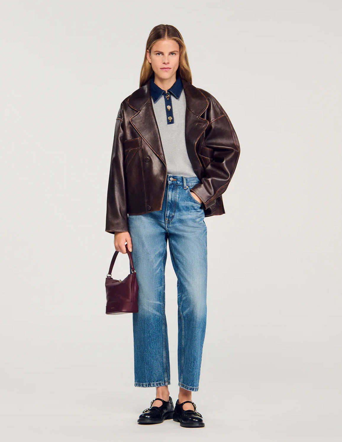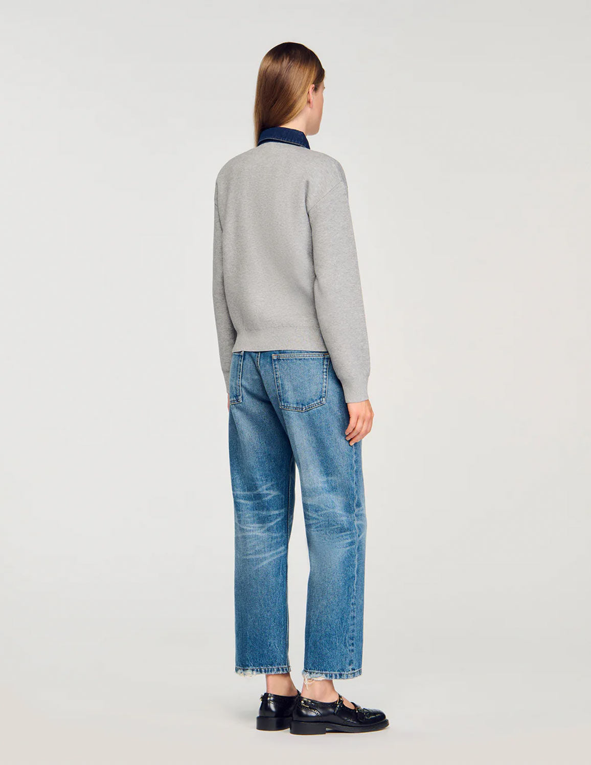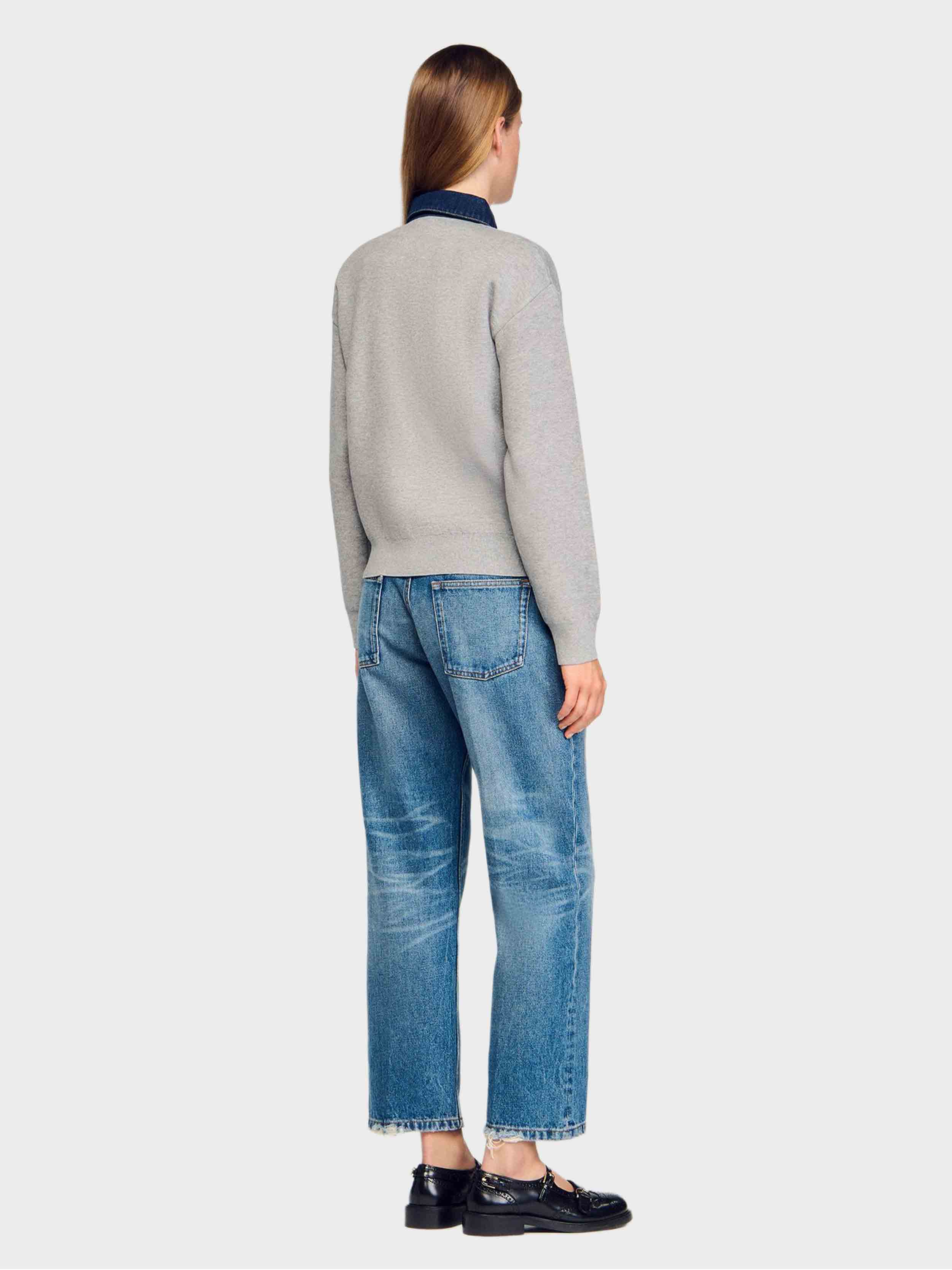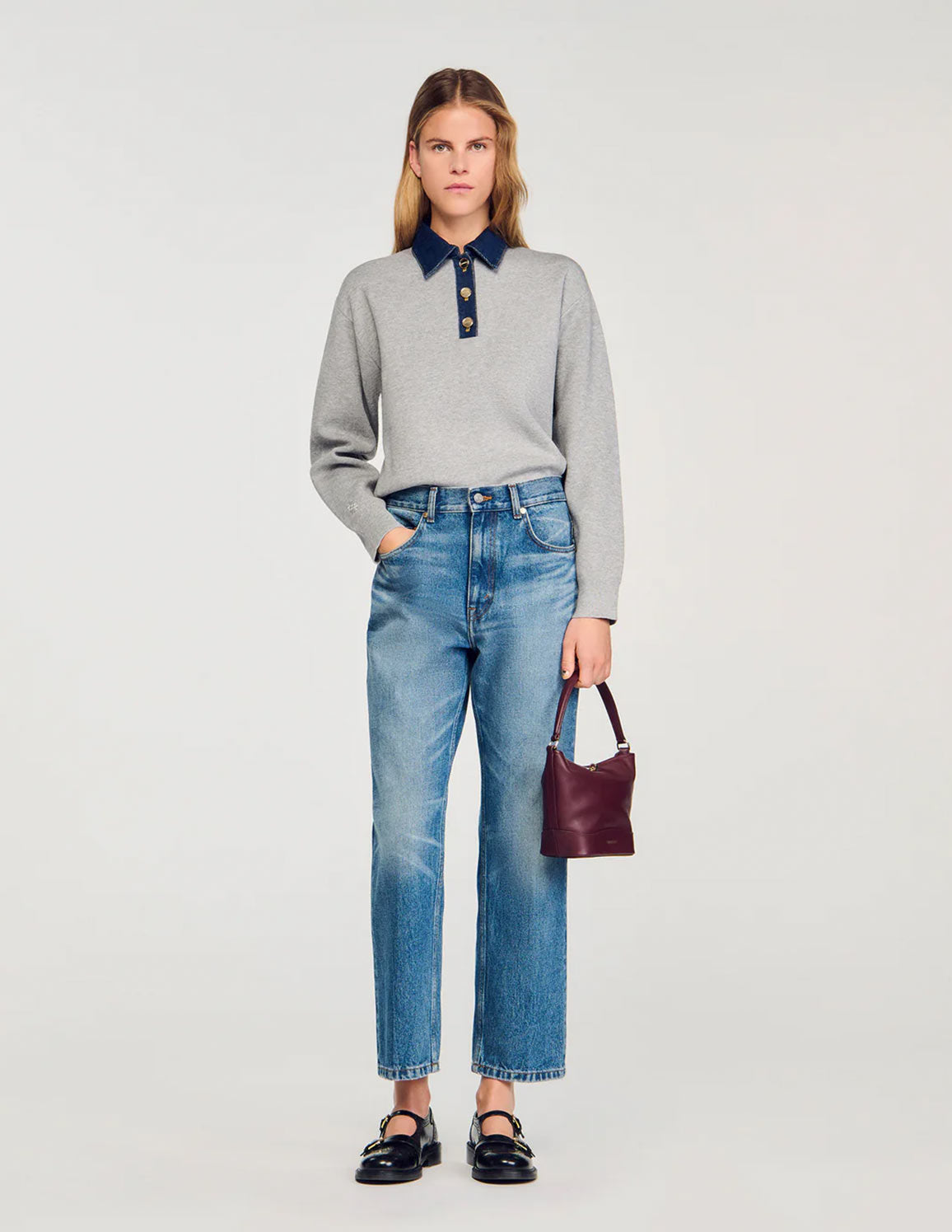 • Knit jumper with denim button-down polo collar neck and long sleeves with gathered cuffs.