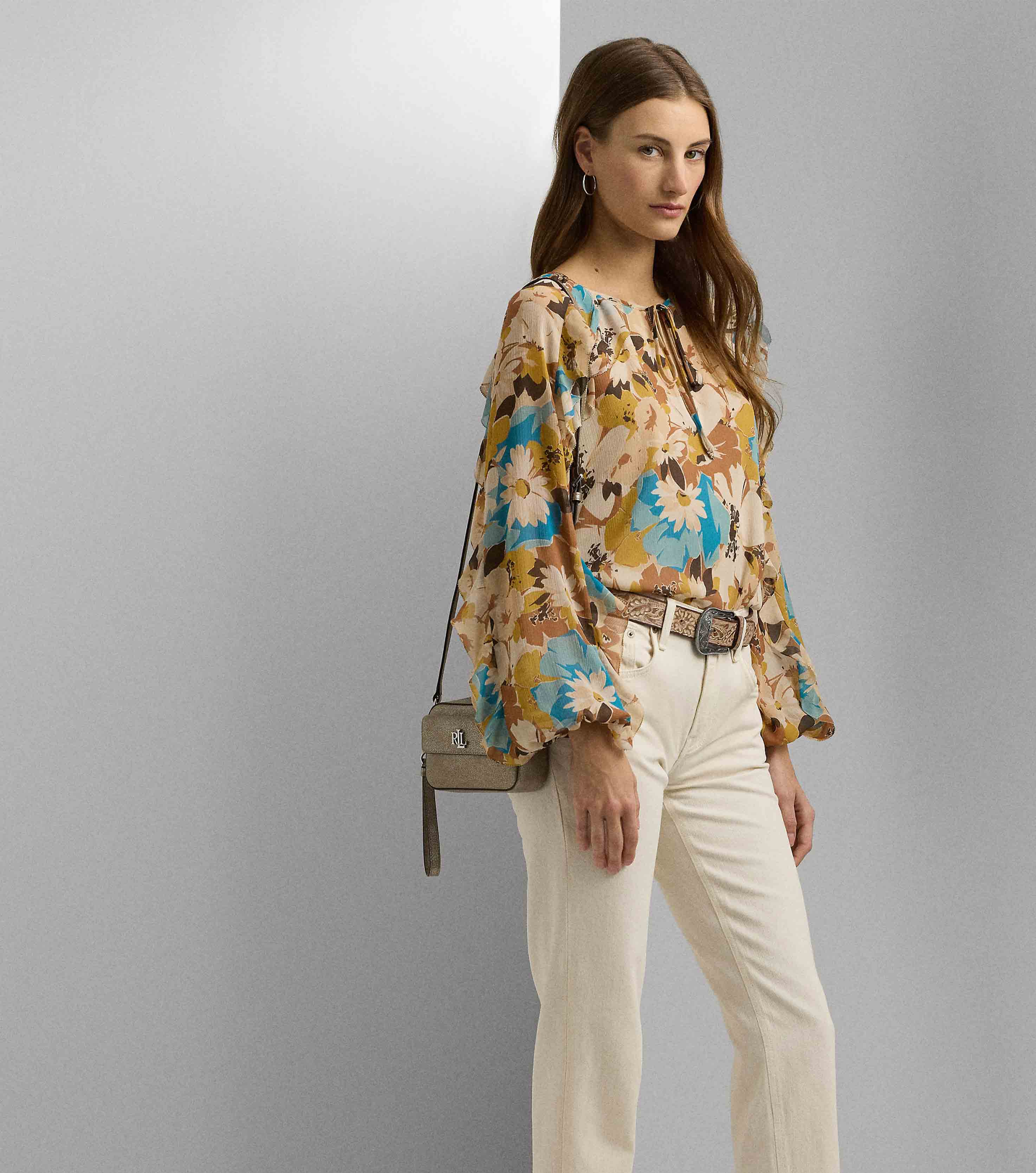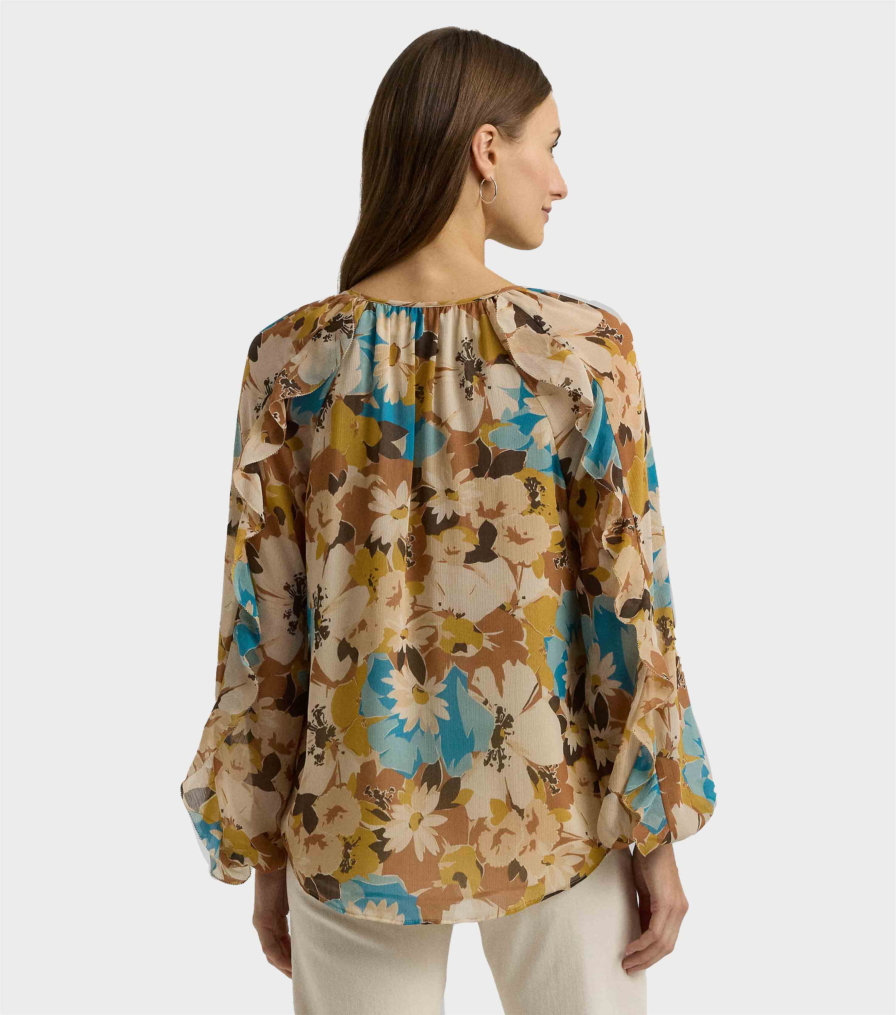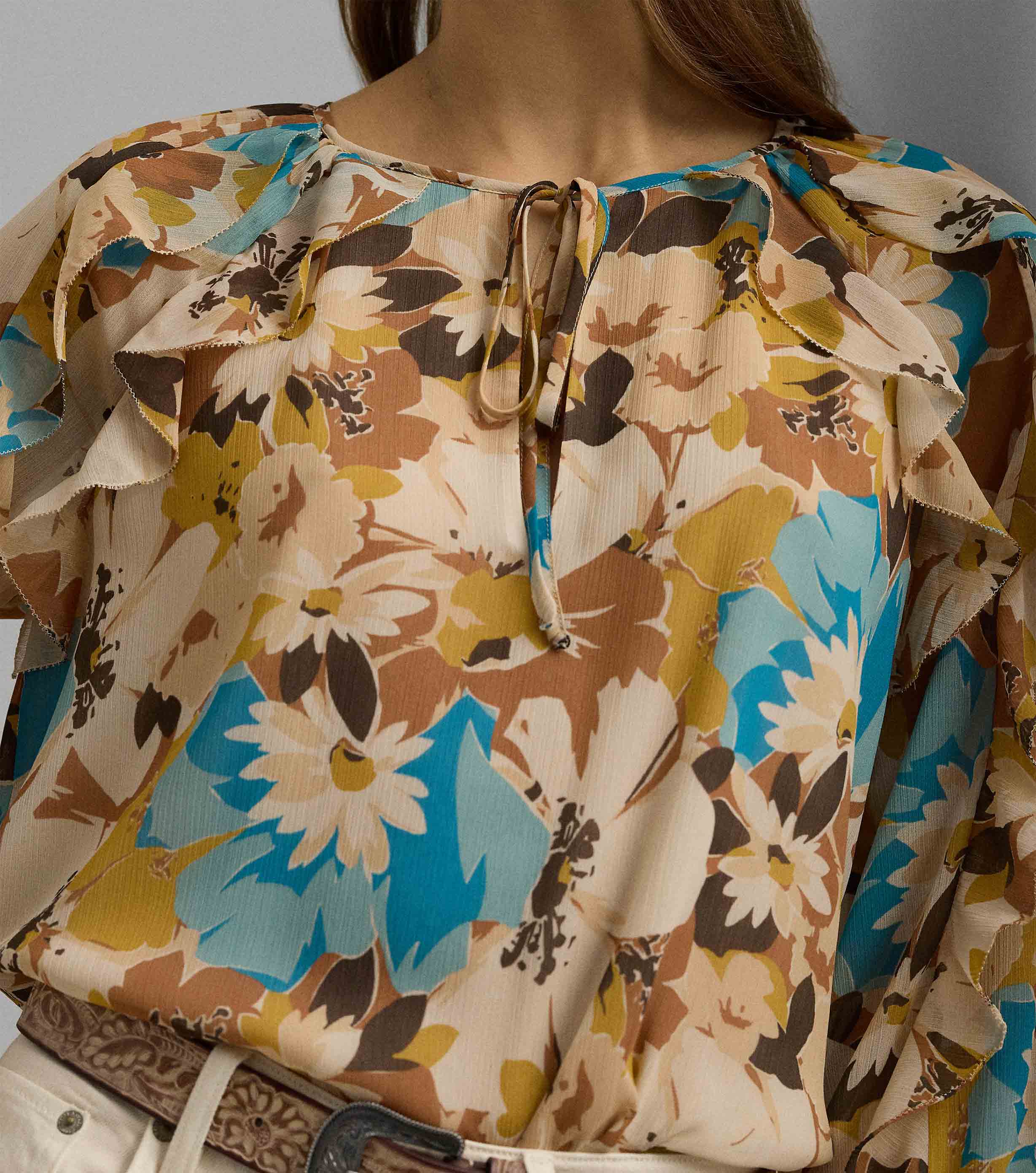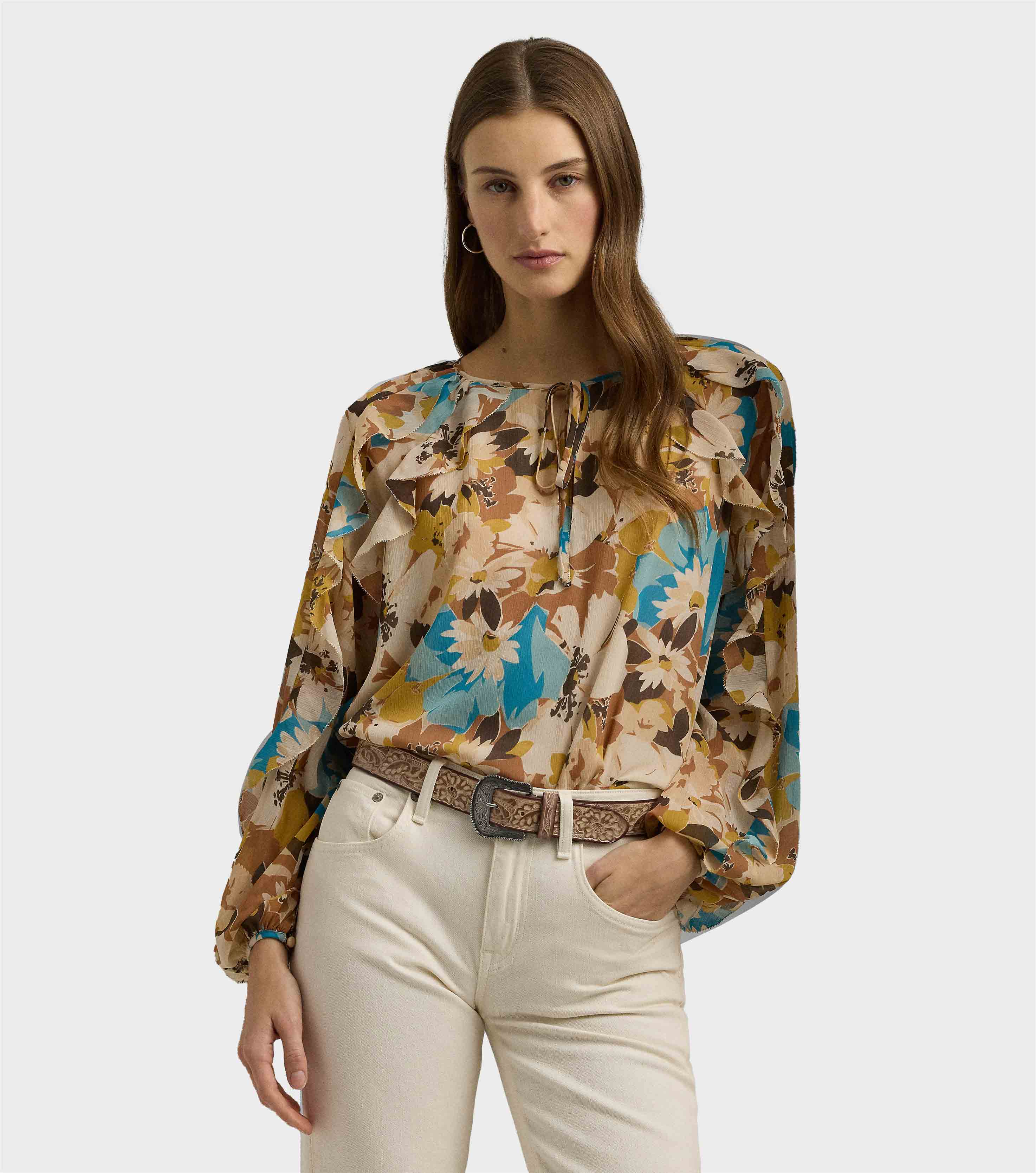 • Crafted with crinkle georgette for an effortless drape, this tie-neck blouse is characterised by blouson sleeves, ruffle trim and the season's painterly floral motif.