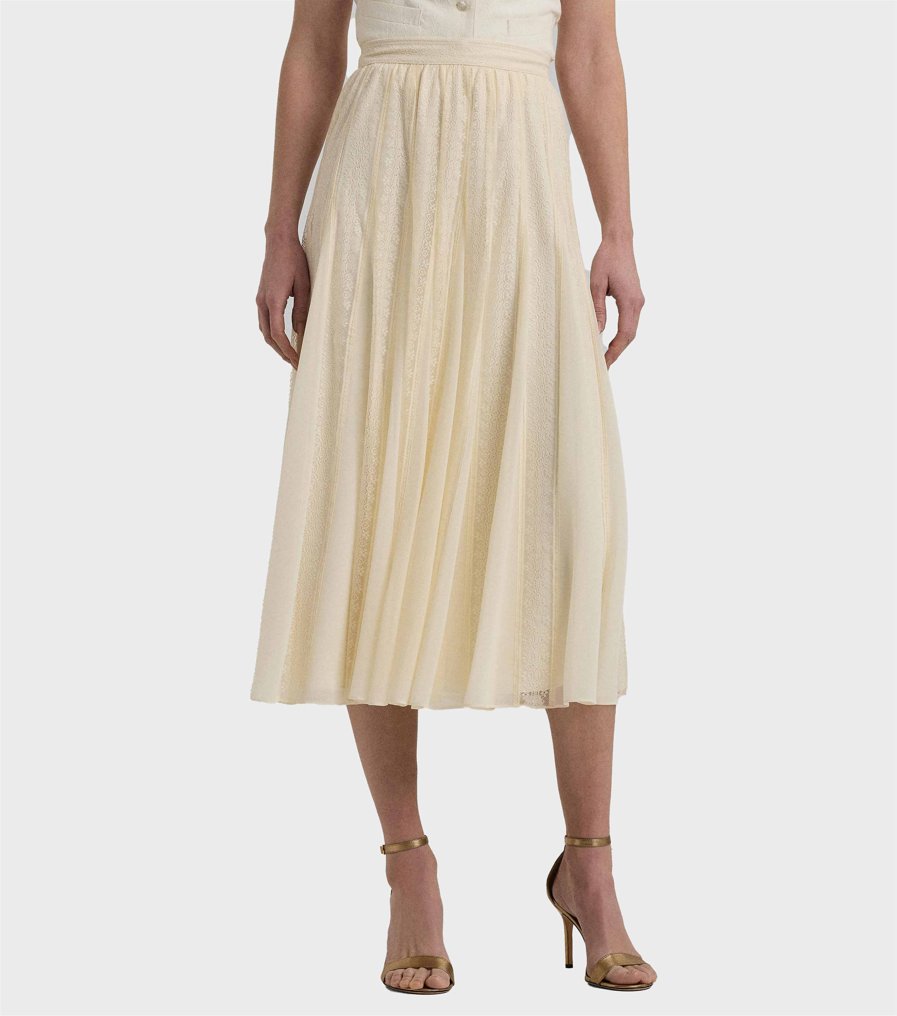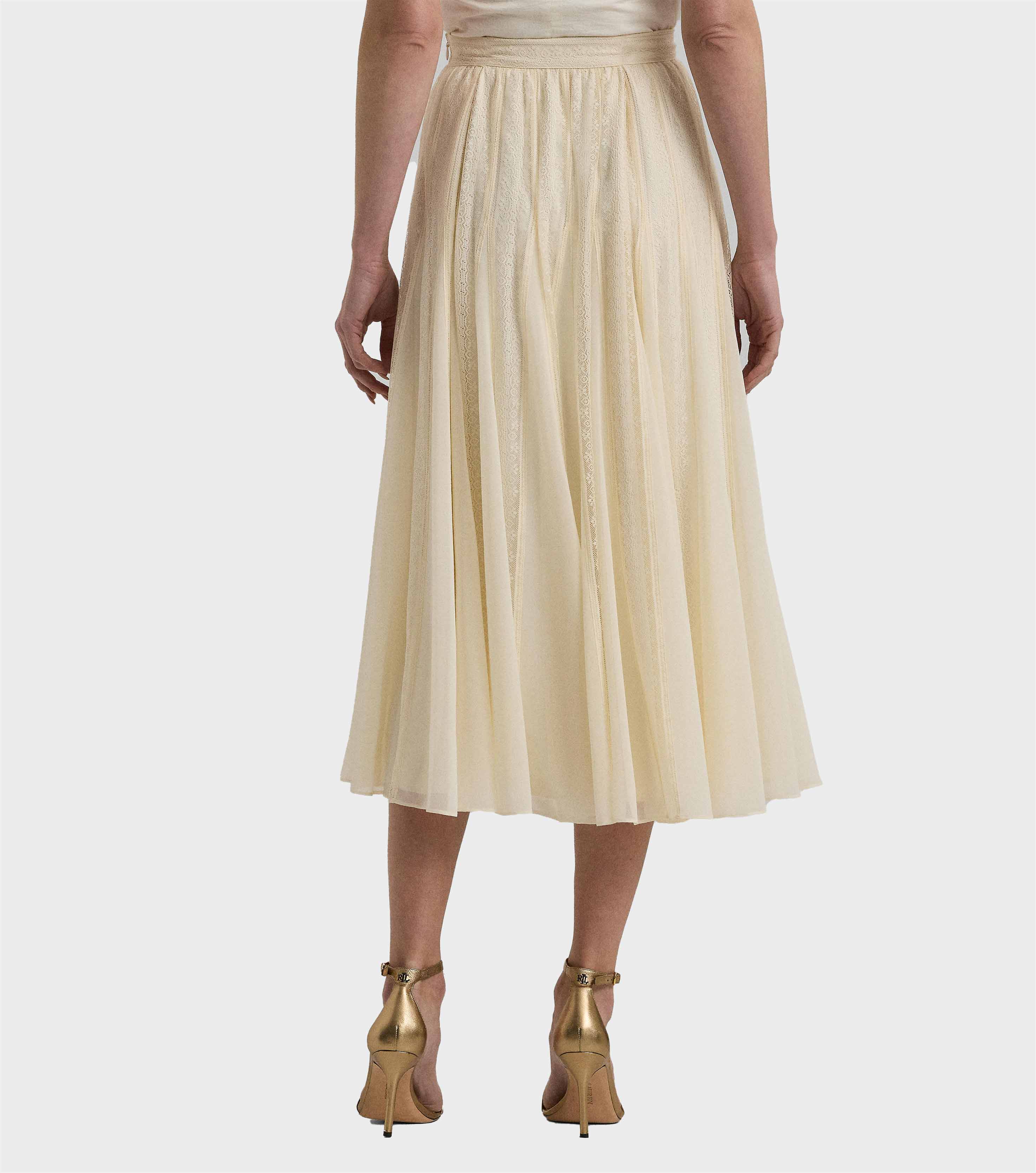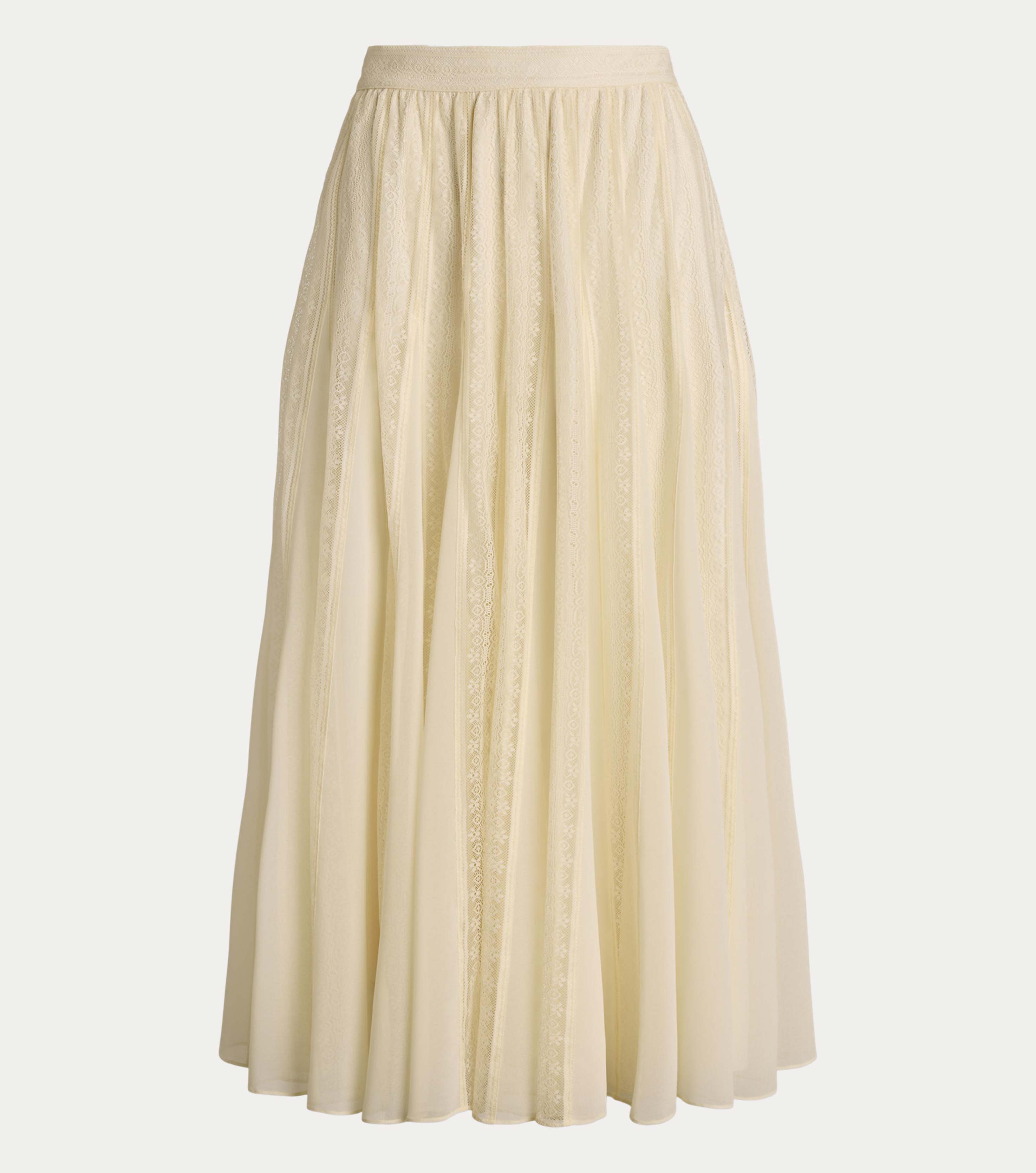 • A romantic Lauren Ralph Lauren style, this midi skirt is constructed with chiffon-and-lace gores for ethereal movement with each step.