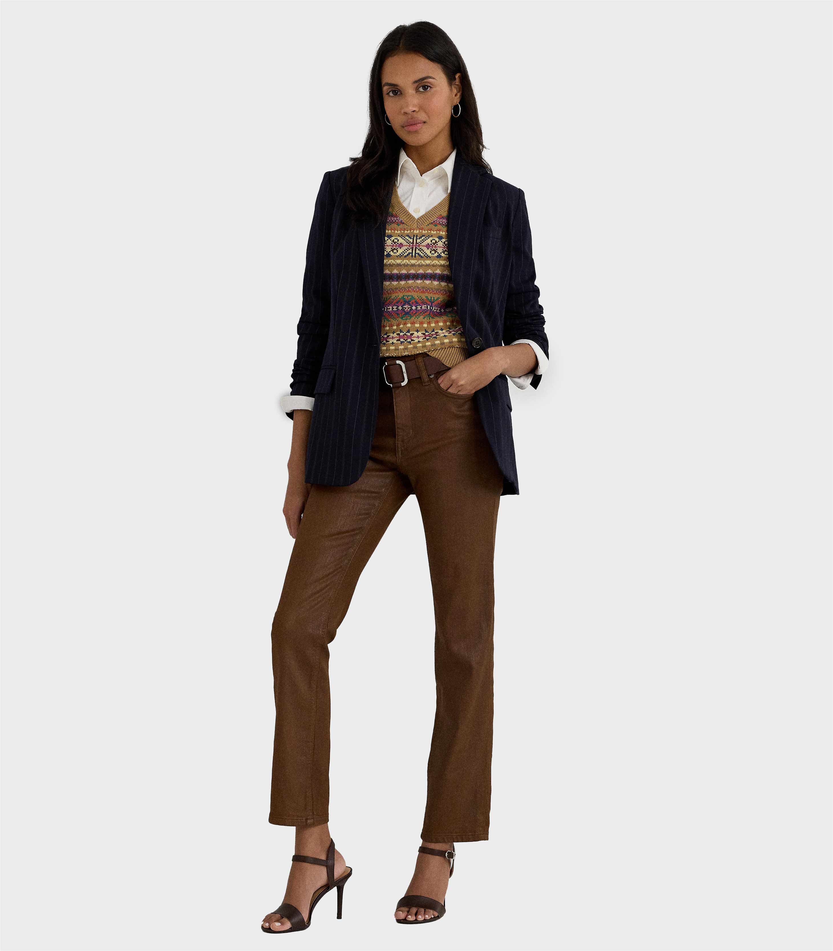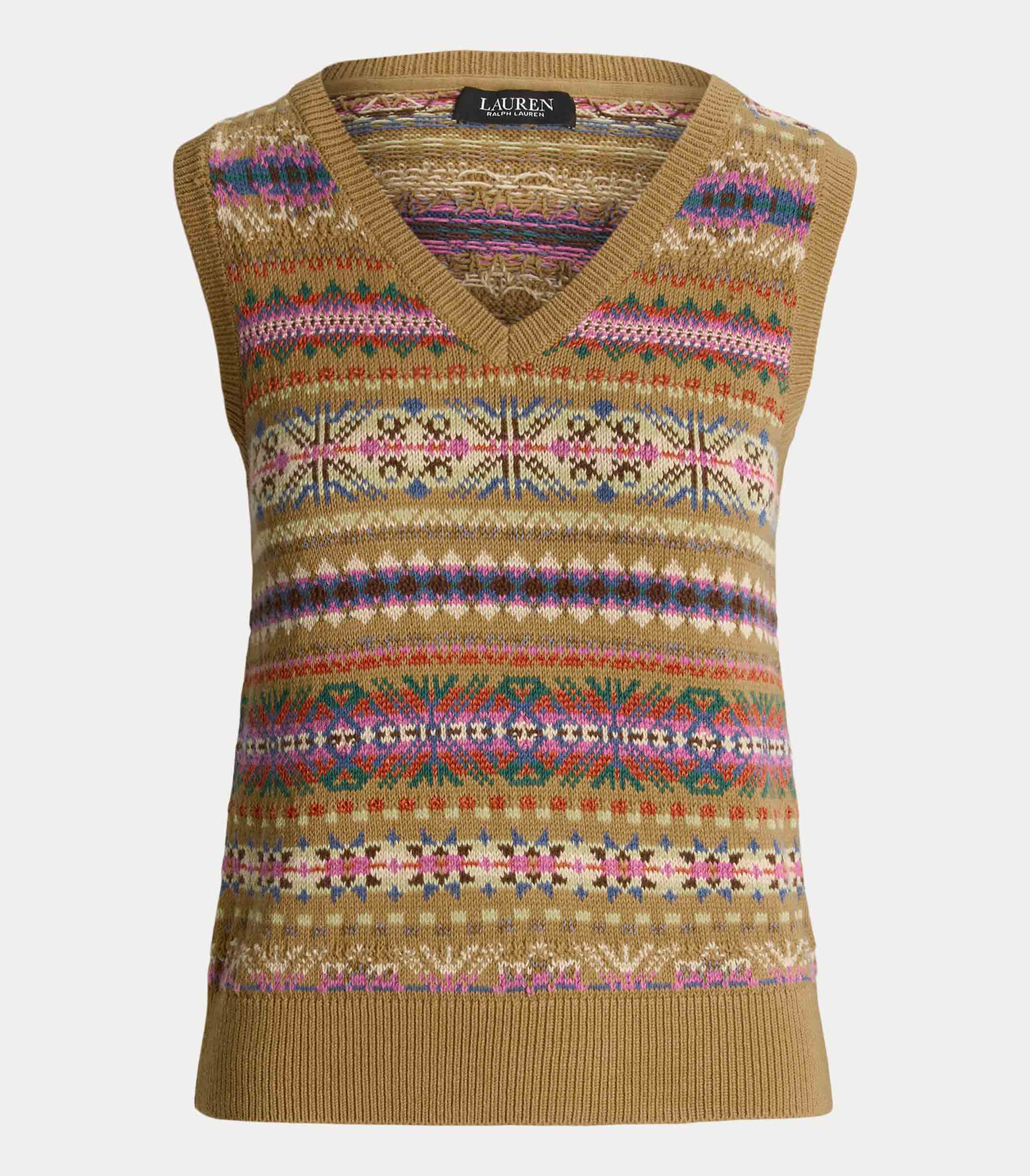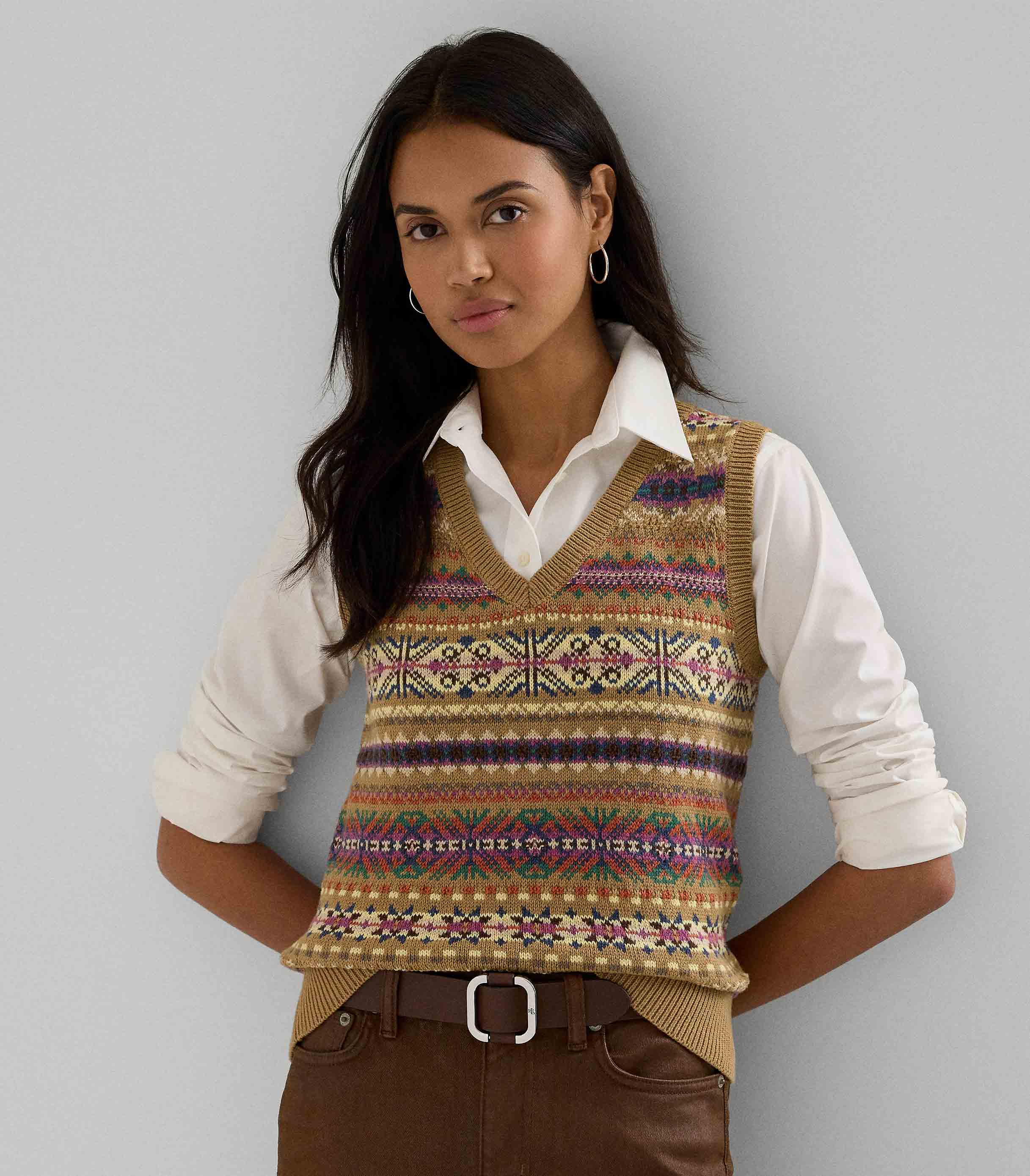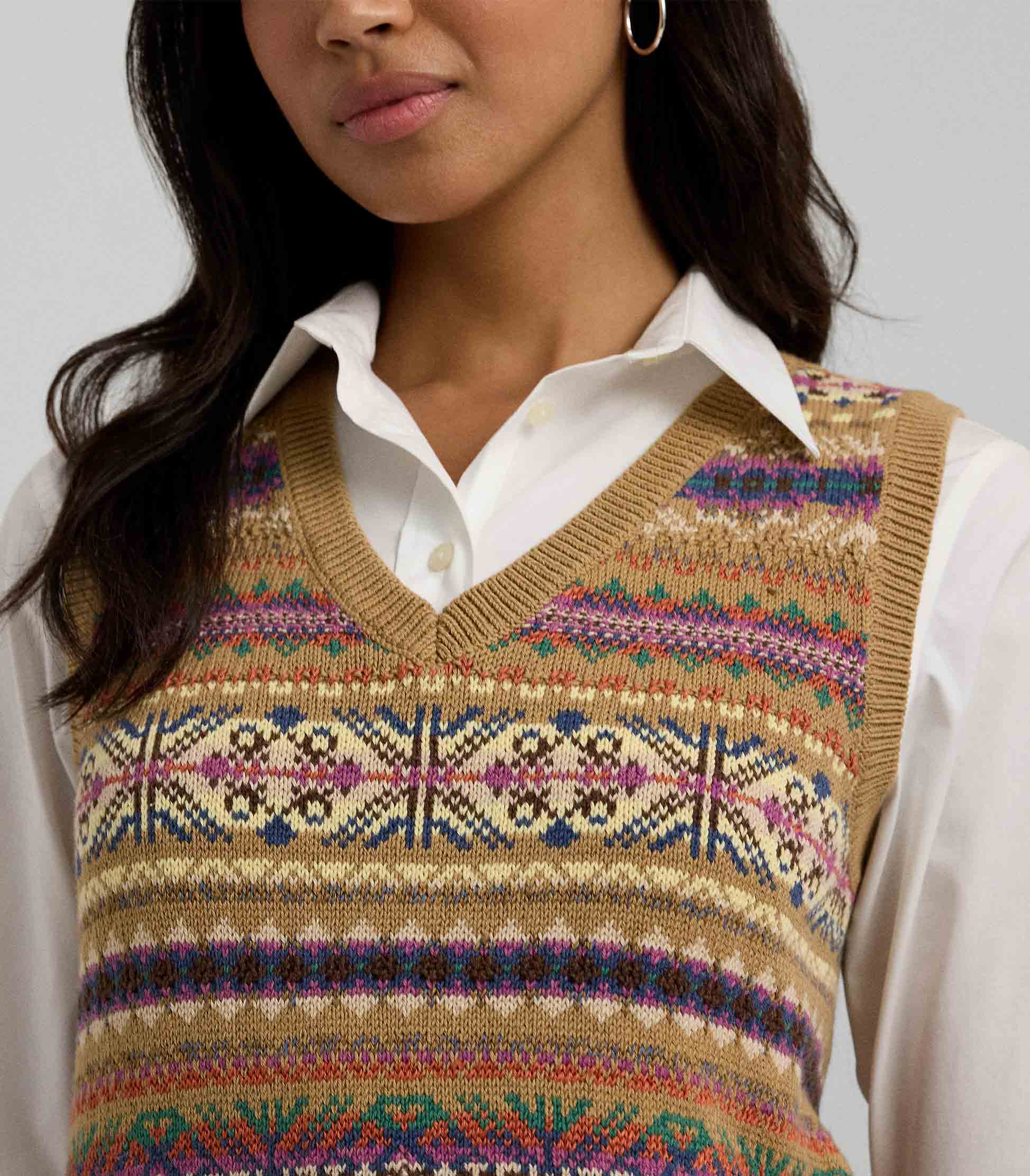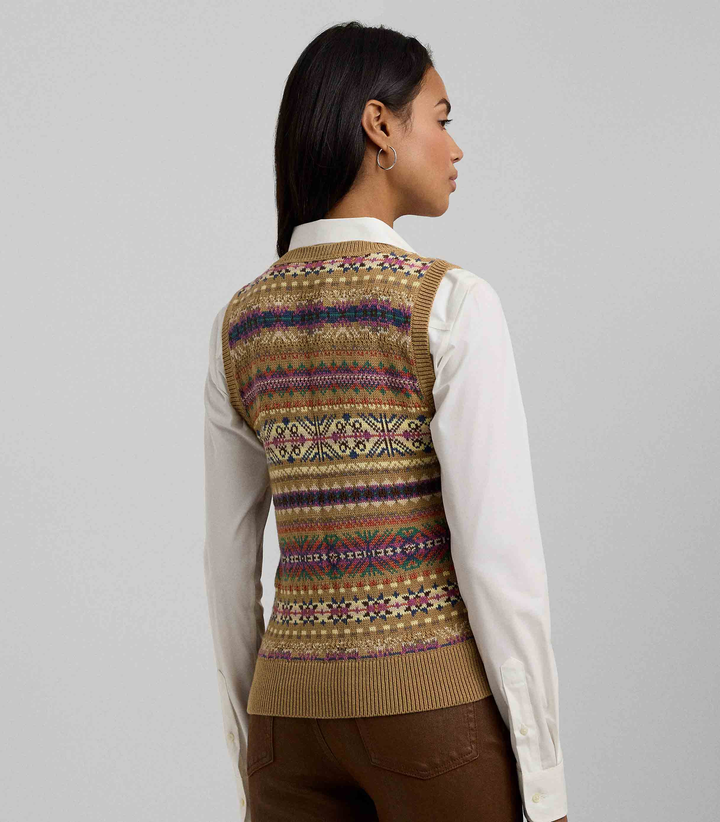 • Spun with a lightweight blend of cotton and linen for a comfortable feel, this V-neck jumper waistcoat features a classic Fair Isle motif, making it a must-have layer for transitional dressing.