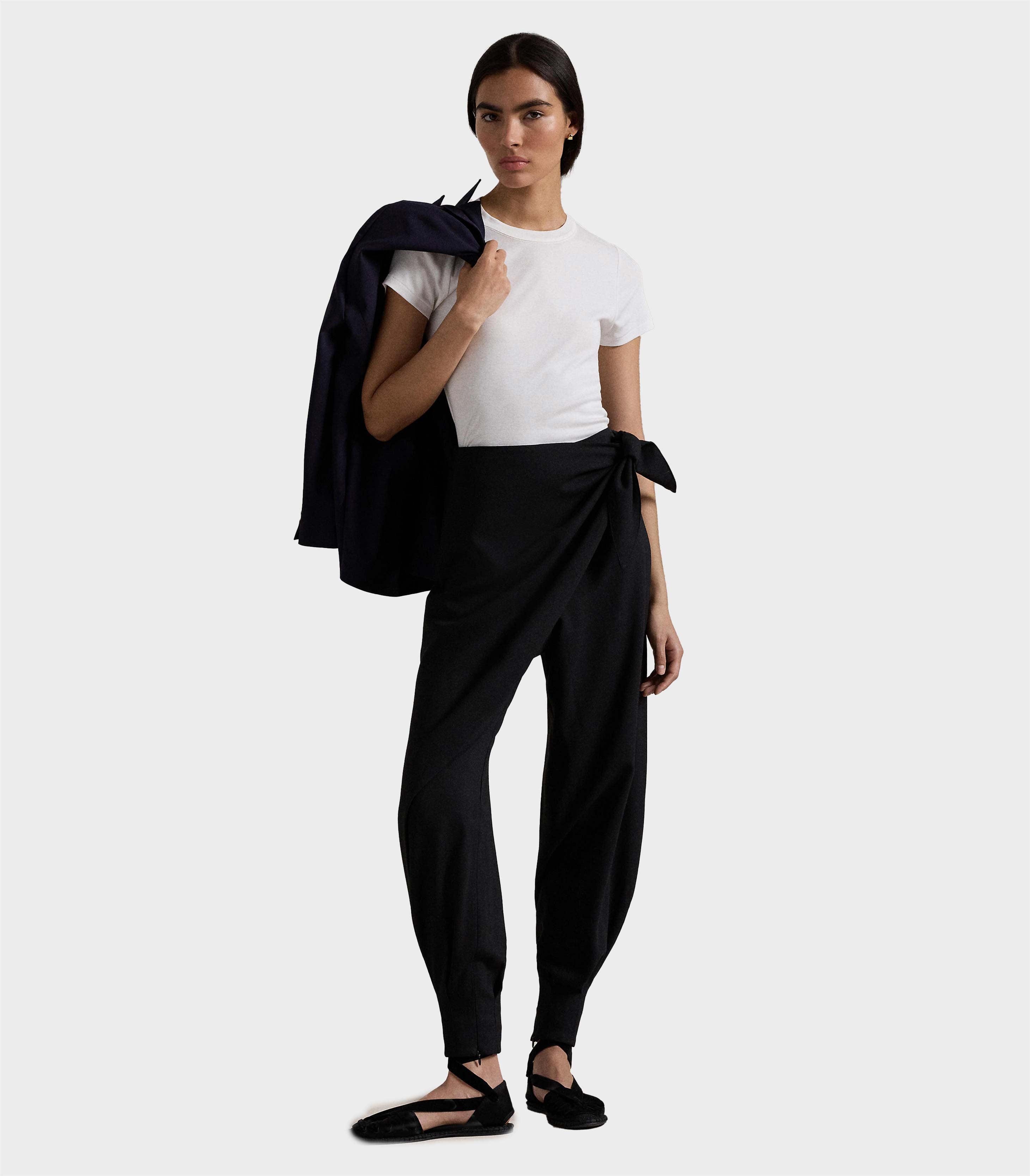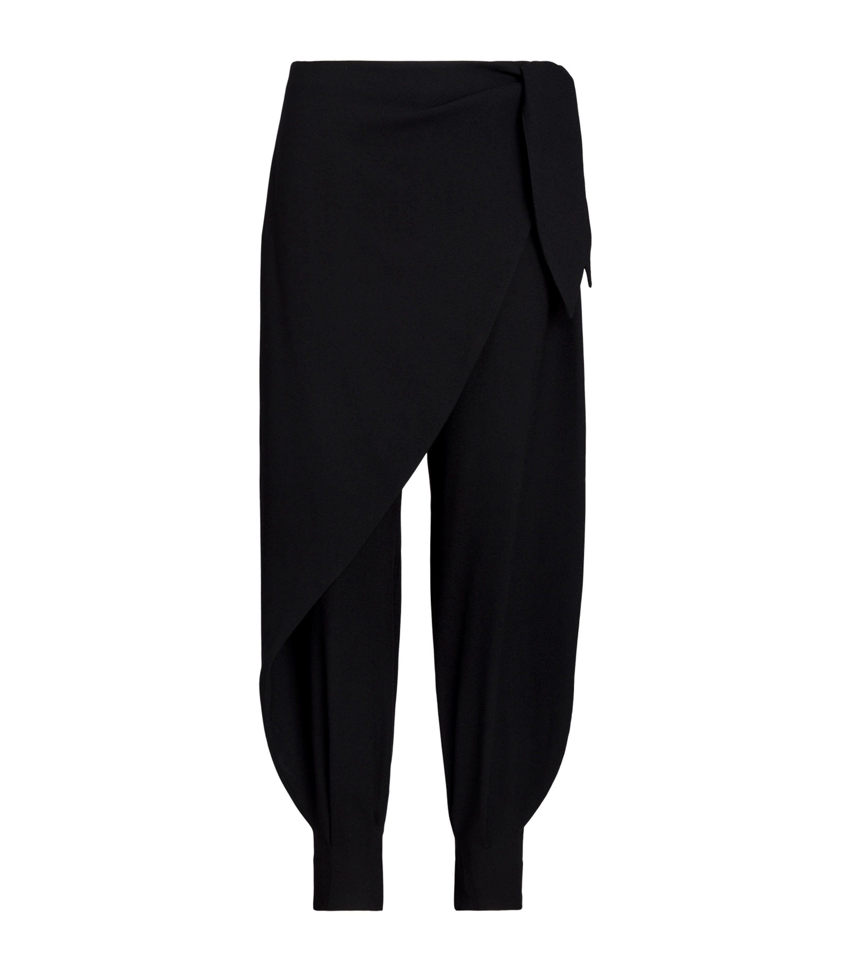 • Rendered in Italian wool crepe, these wide-leg pants feature a wrap detail that ties at the front waist and tapered cuffs with concealed zip vents.
