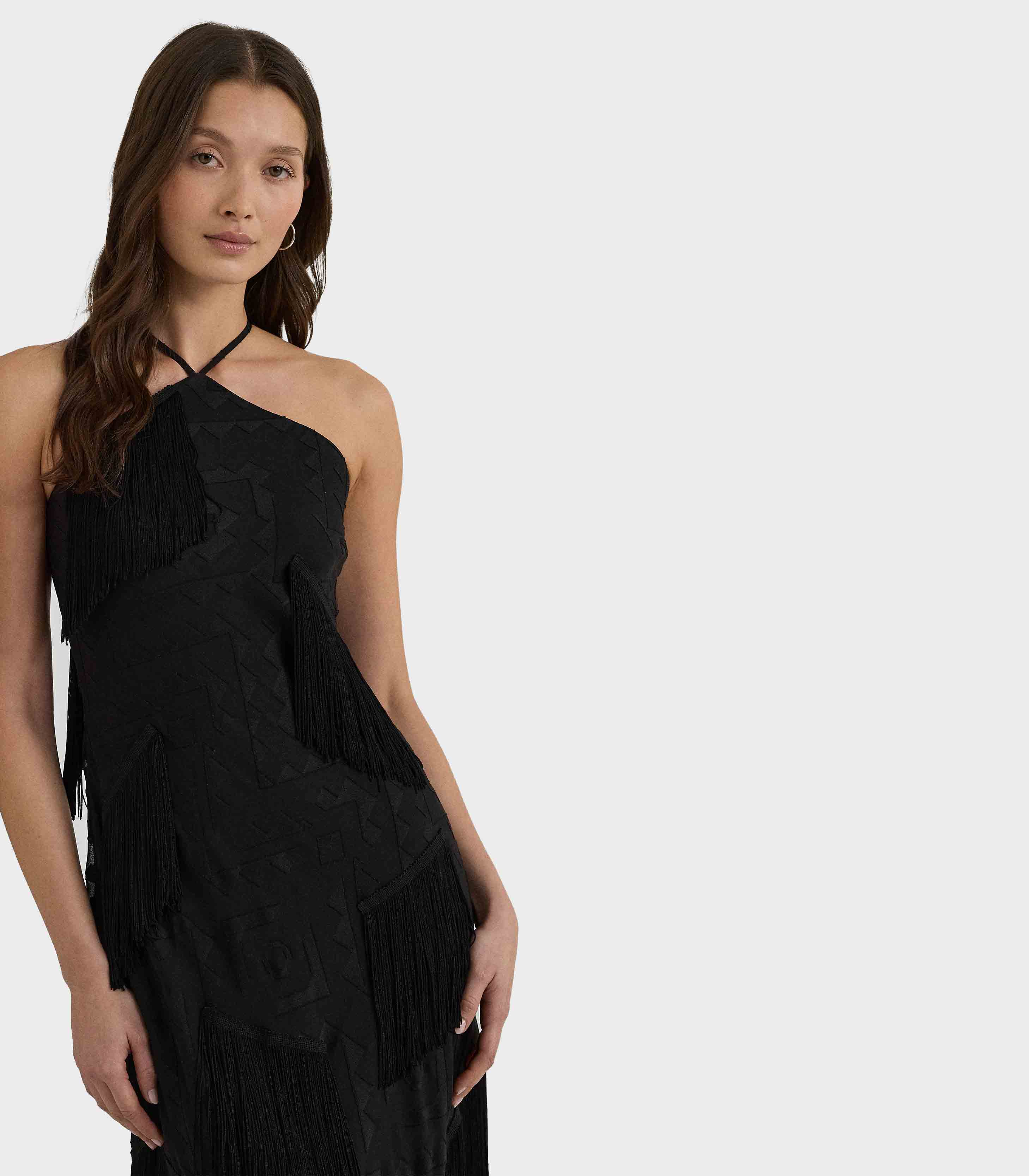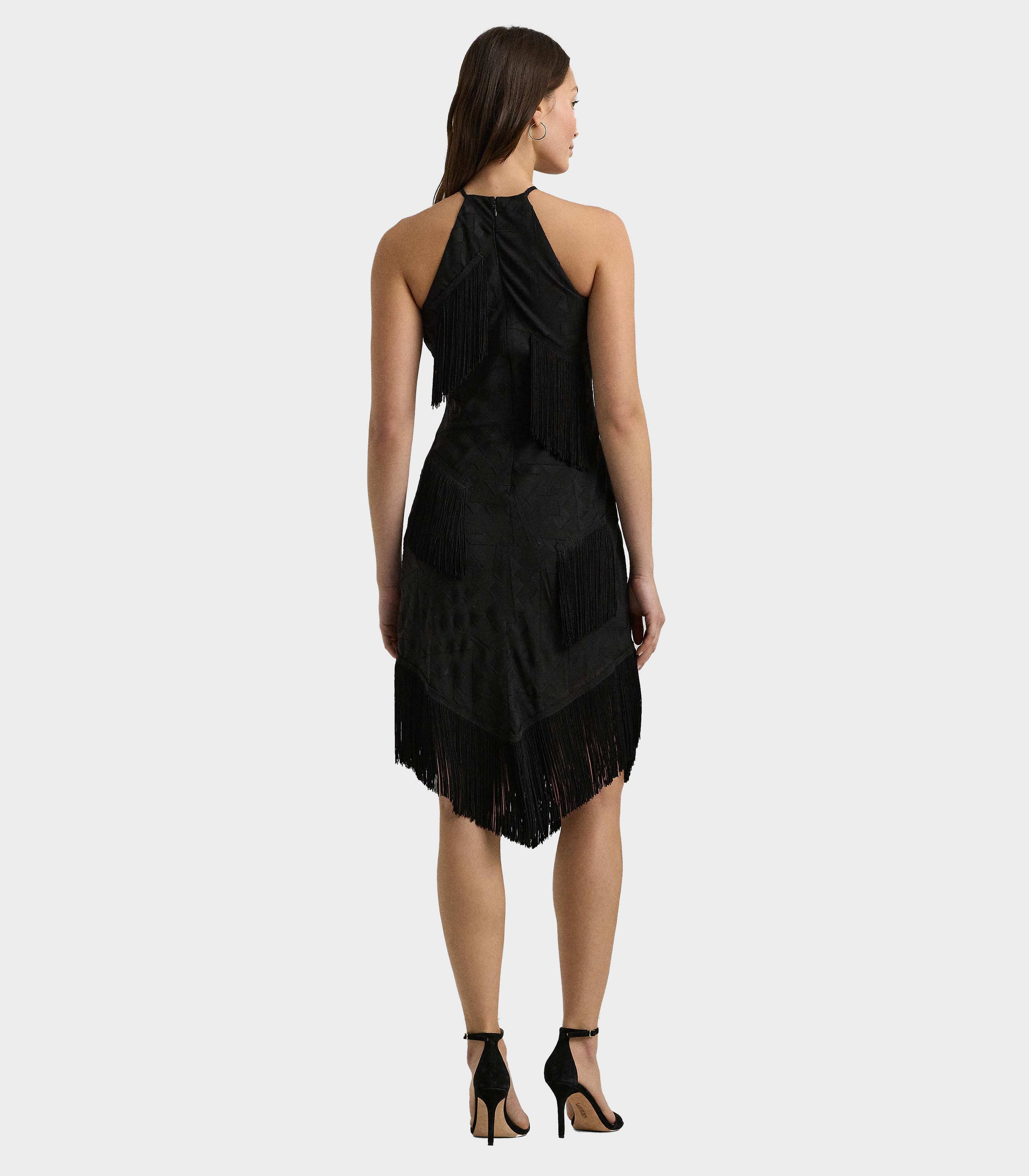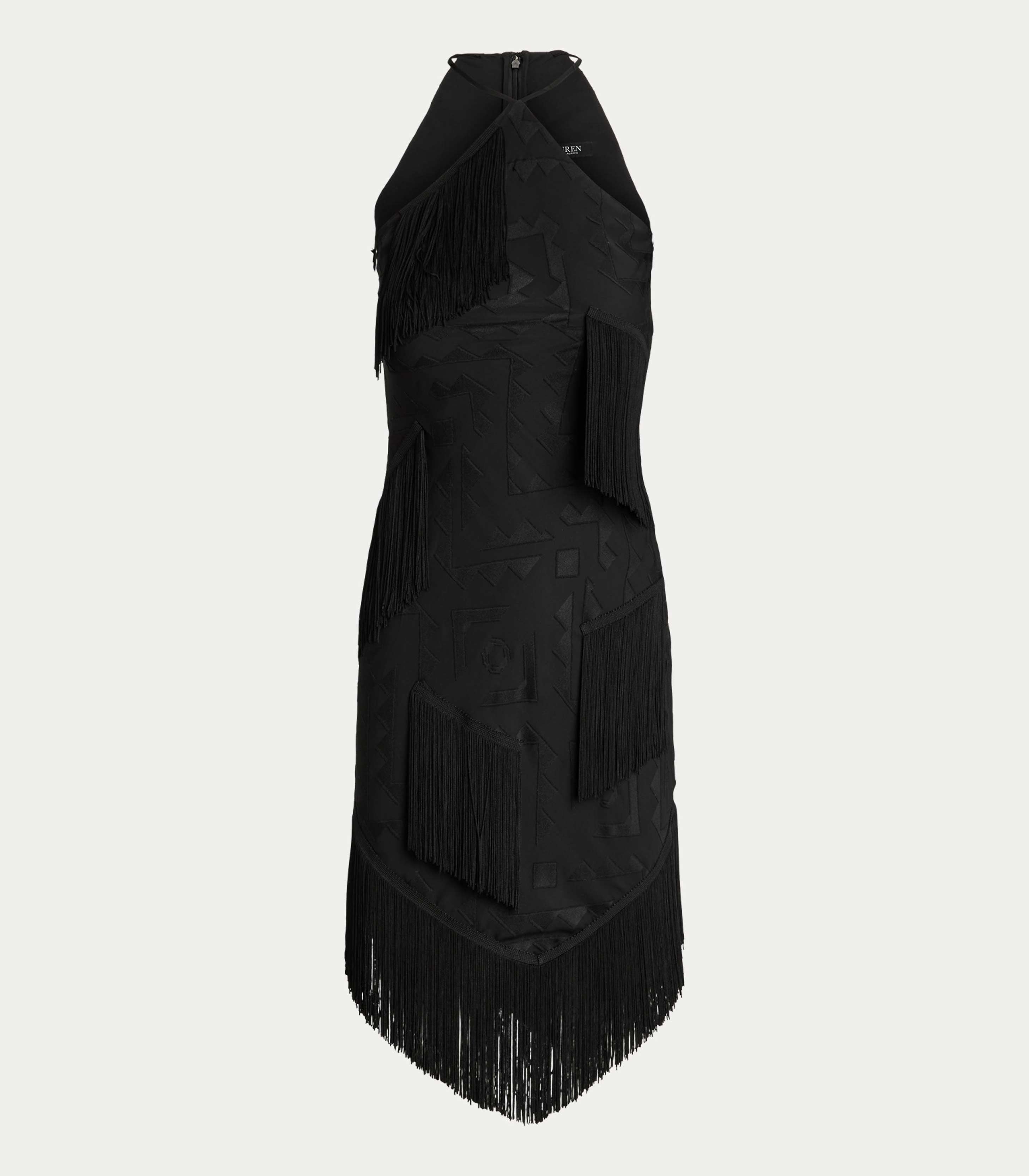 • Contemporary glamour defines this halter cocktail dress, which is crafted from a fil coupé jacquard fabric showcasing a tonal geometric motif. Fluid fringe trim is pieced throughout this style's slim-fitting silhouette for a playful finish.