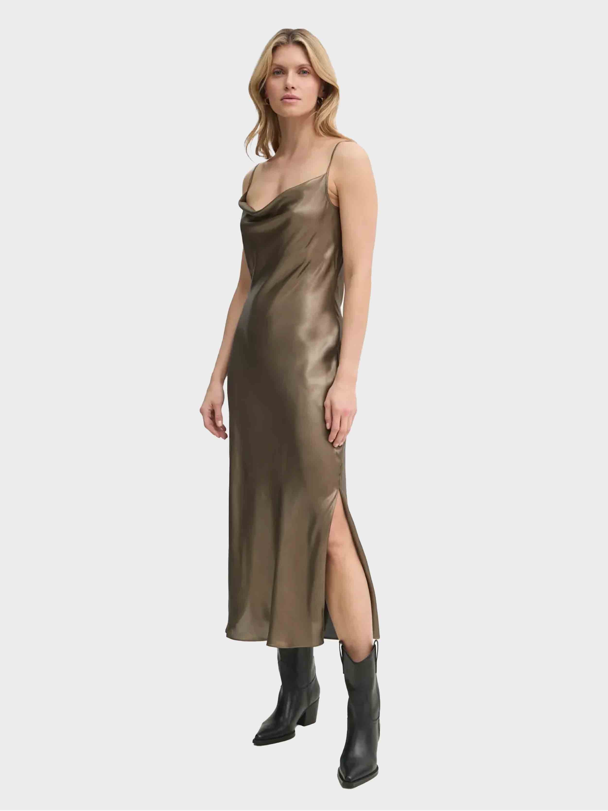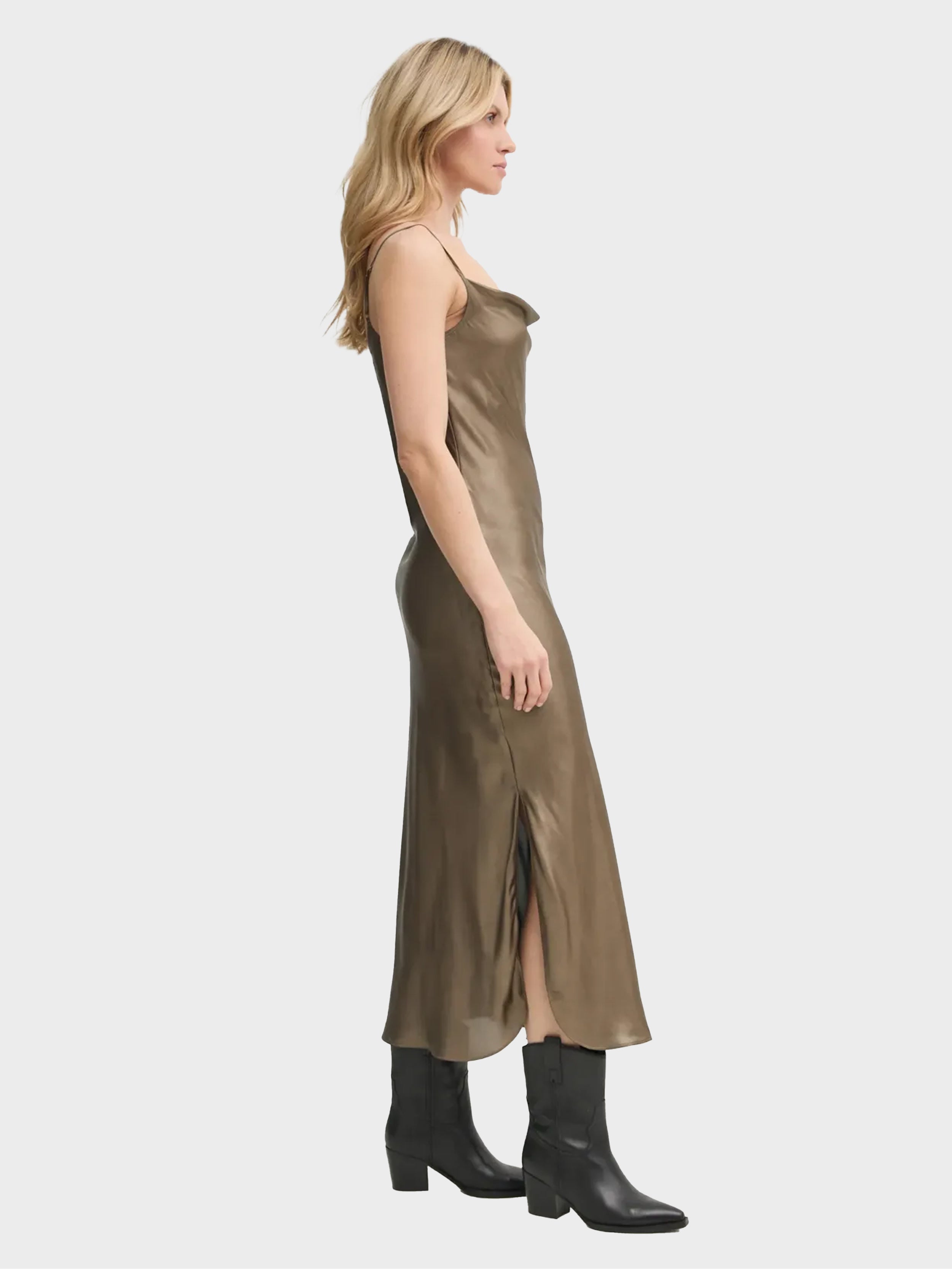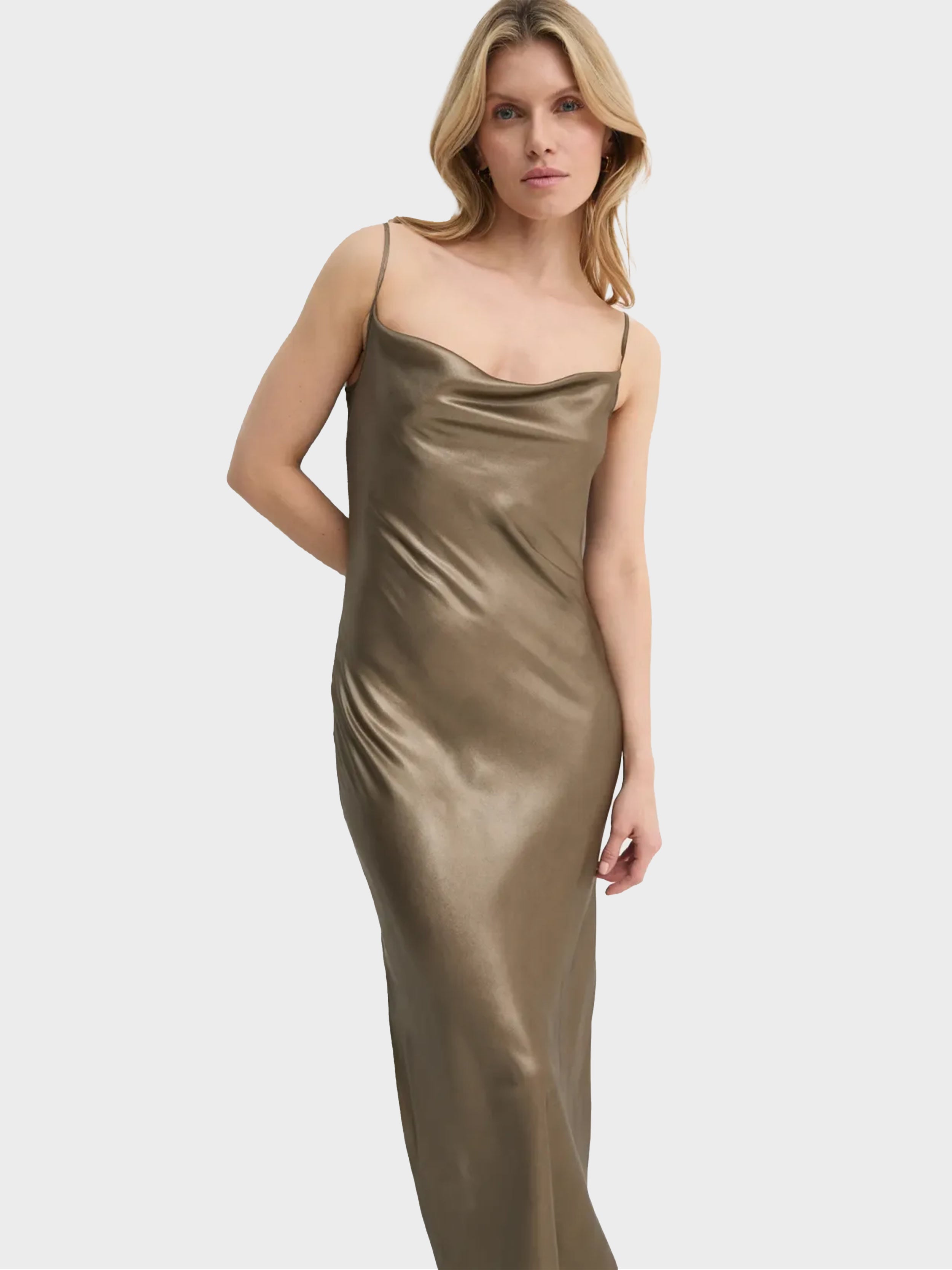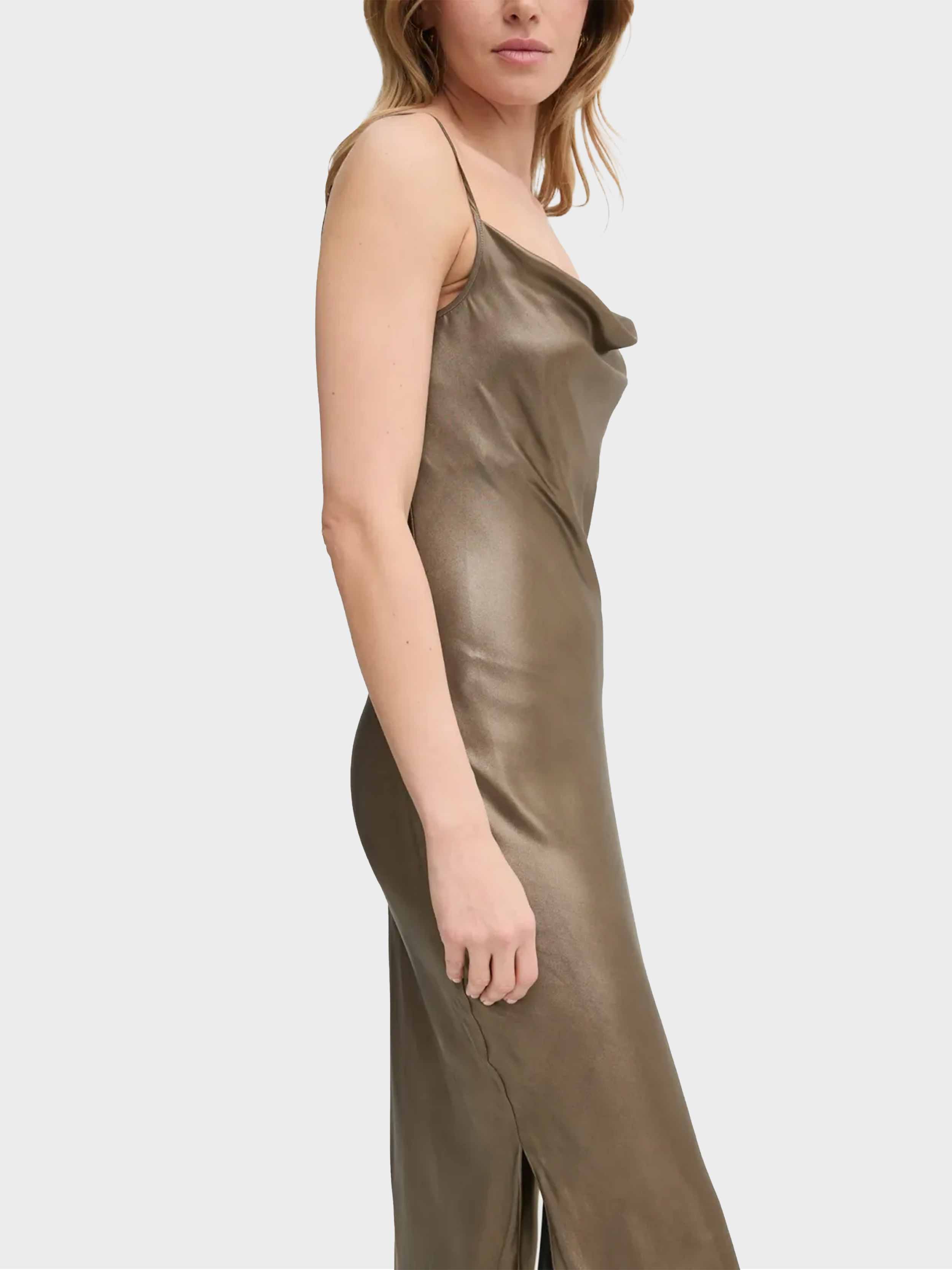 • Meet our statement slip dress, this is the Hadley. Crafted from an elegantly draped satin with a seasonal metallic sheen, it's shaped to flatter with a slight cowl neck, side split and adjustable straps. It's giving 90s vibes try it dressed up with heels or underneath slouchy knitwear for a casual look.