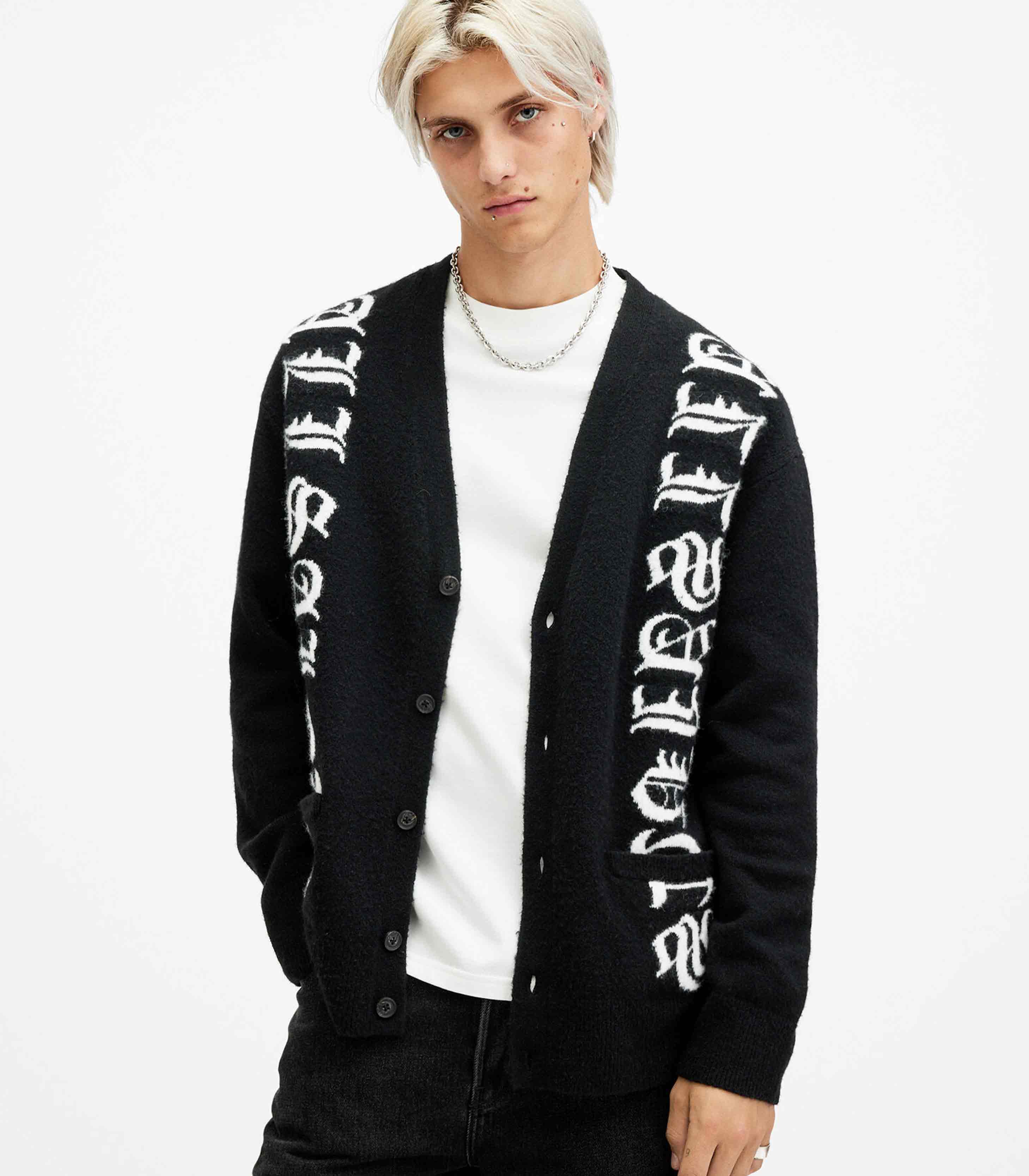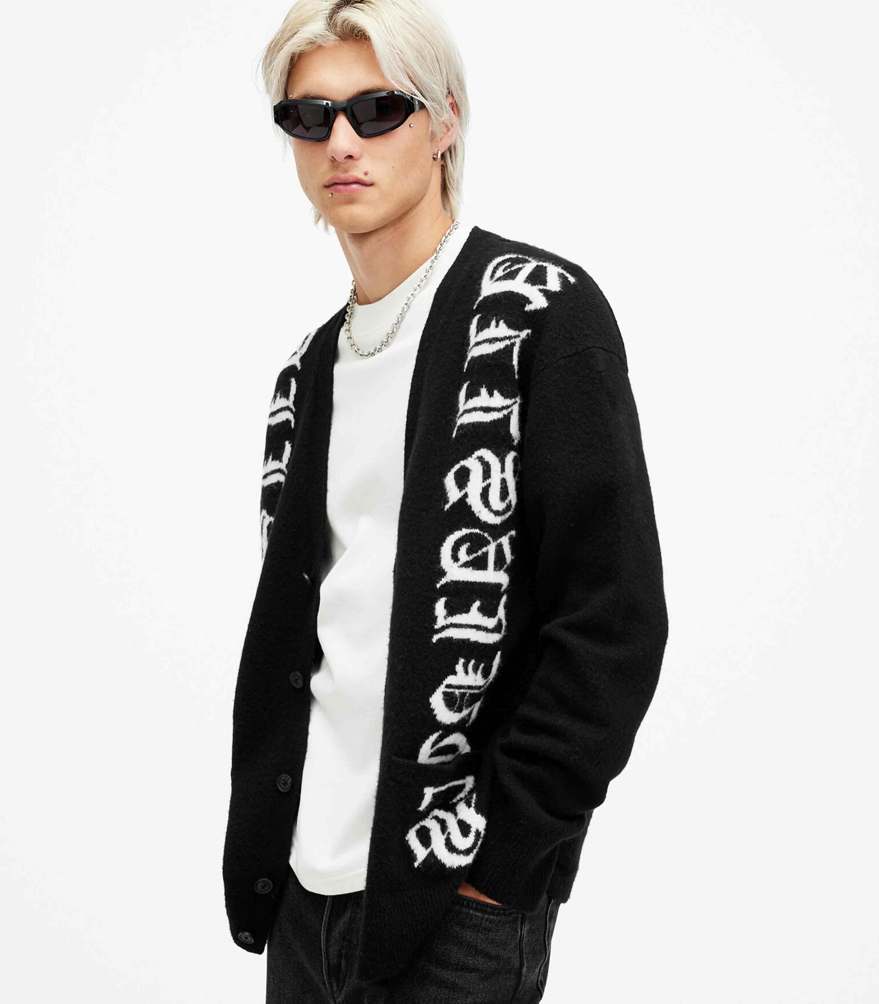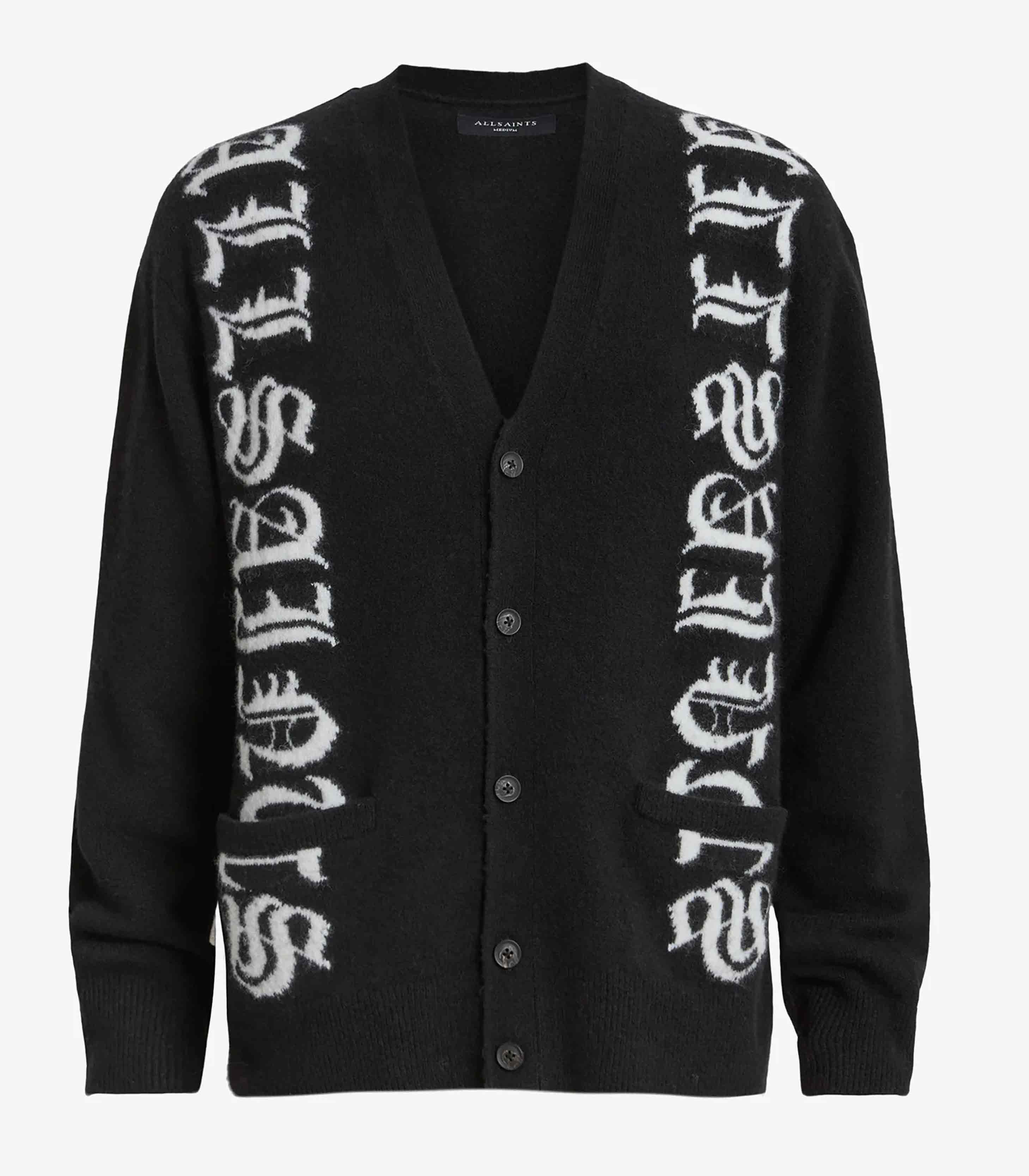 • AllSaints- Scripture Gothic Jacquard Logo Cardigan