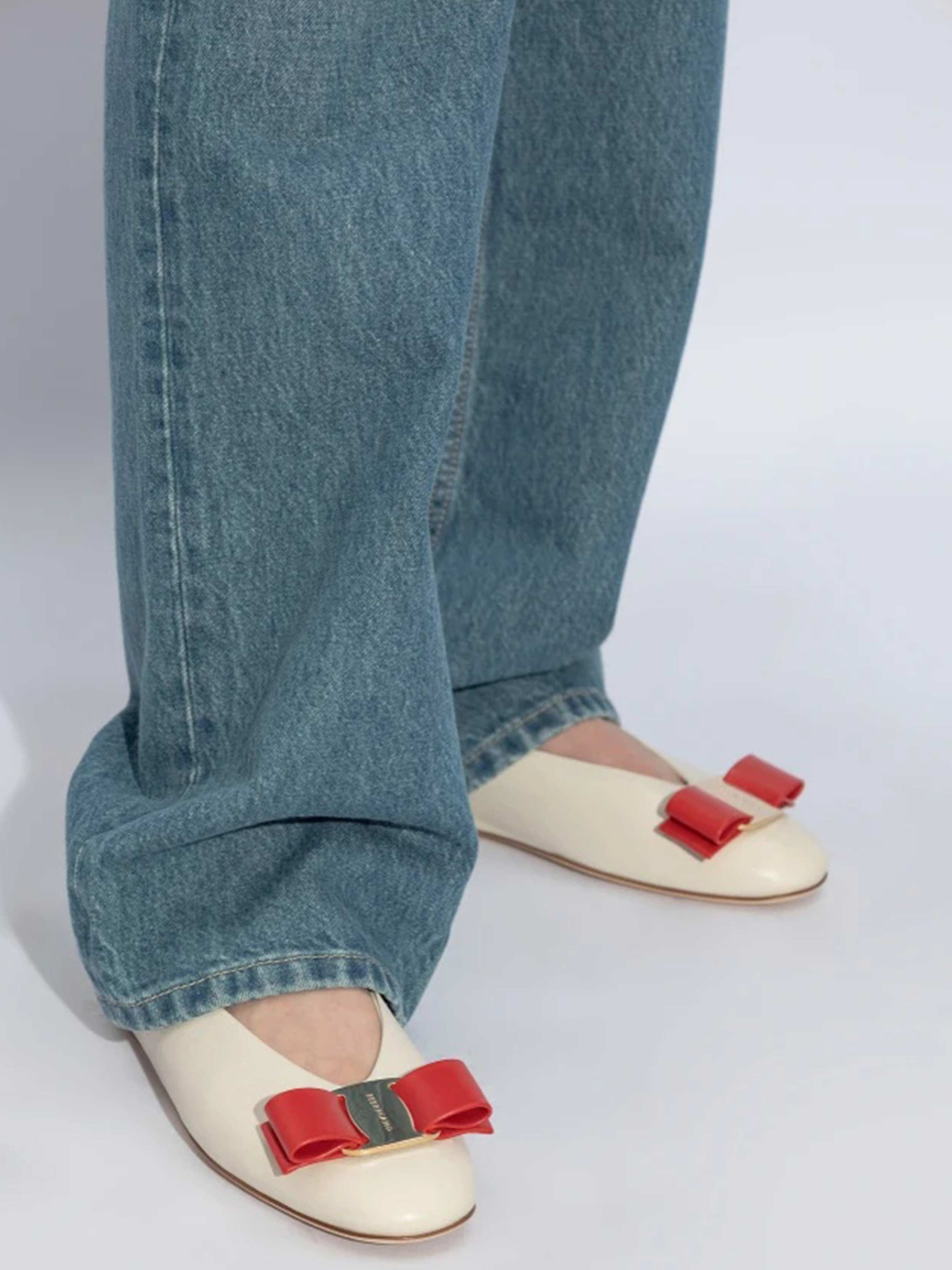 • A detail in the form of a RED BOW placed on the front not only adds a colorful contrast but also a feature that distinguishes the 'Vanna' flats from other models. The interior of the shoe is lined with leather in a vibrant red hue, signifying its exclusivity, while golden markings attest to its high-fashion pedigree. Presented on a model, paired with a simple white t-shirt and jeans, the versatility of the 'Vanna' ballet flats is evident, blending seamlessly with both casual and more sophisticated outfits.