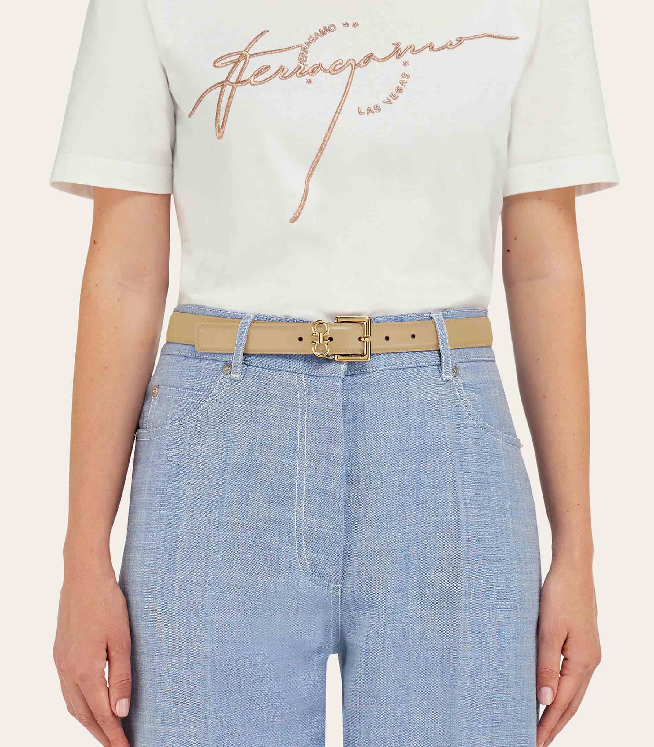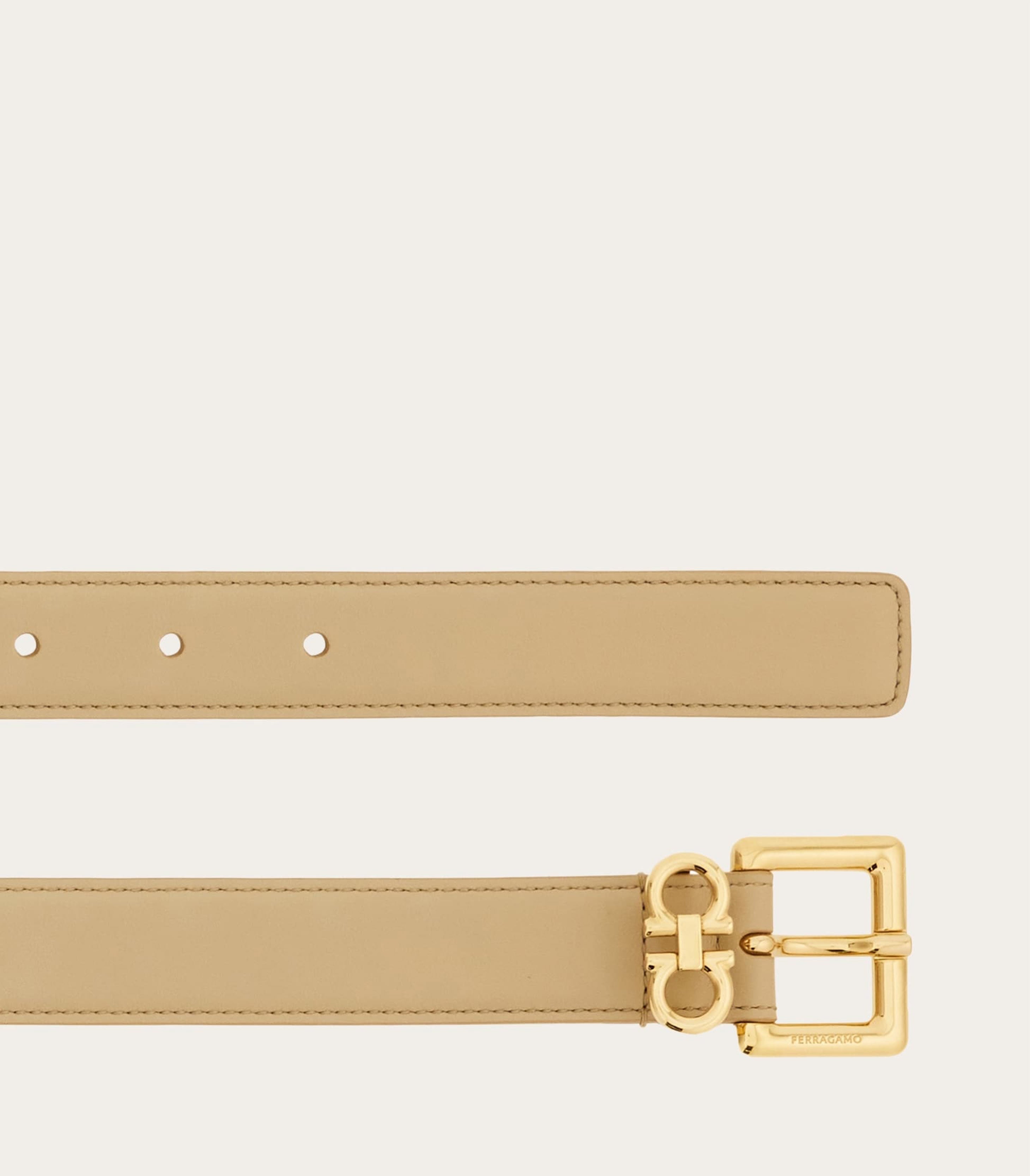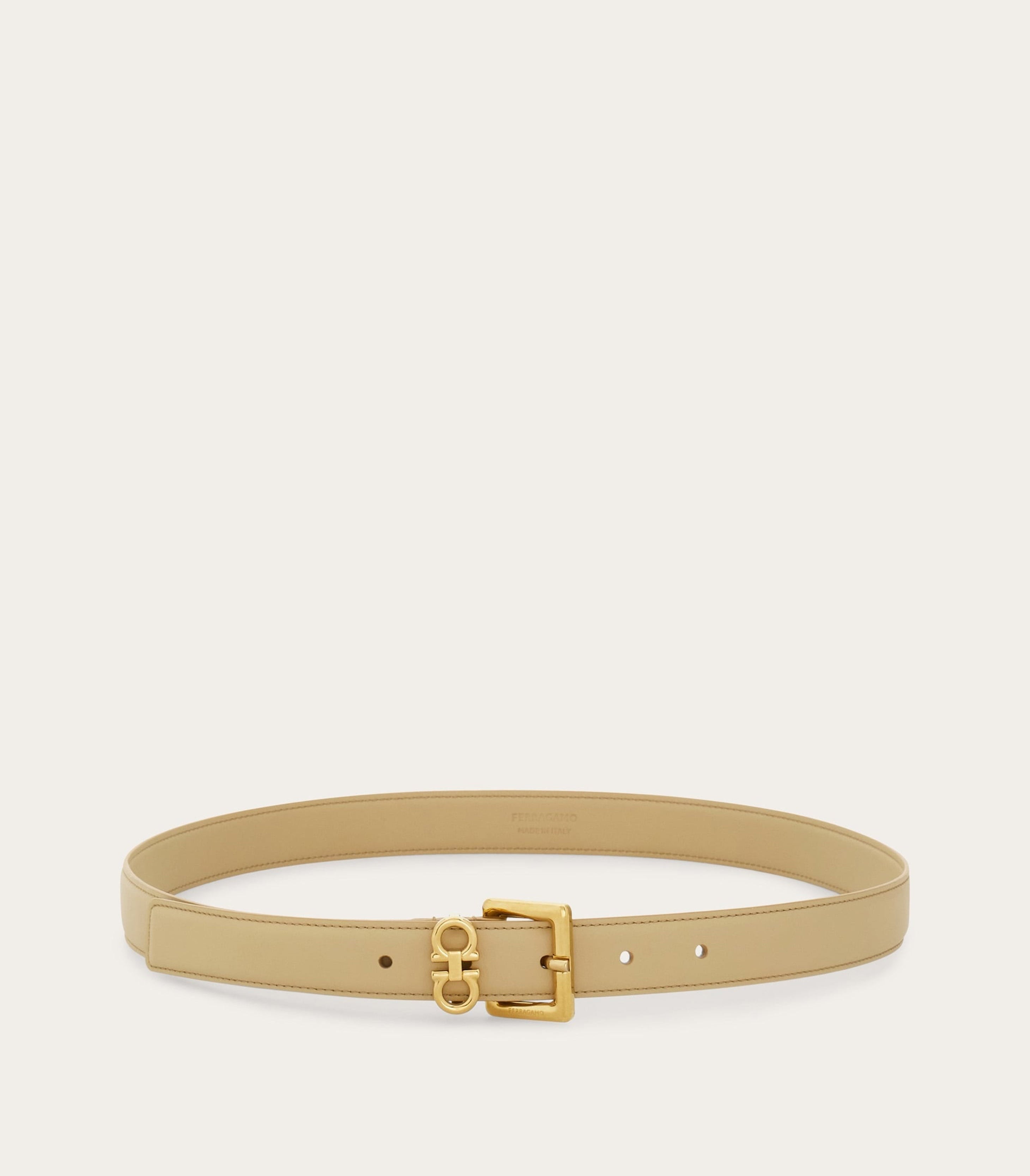 • The mini golden Gancini loop adds a playful twist to this Ferragamo belt. Made of soft calfskin with a natural grainy finish, it has a golden square buckle with rounded edges. The 2.5cm width confirms an elegant appeal.
