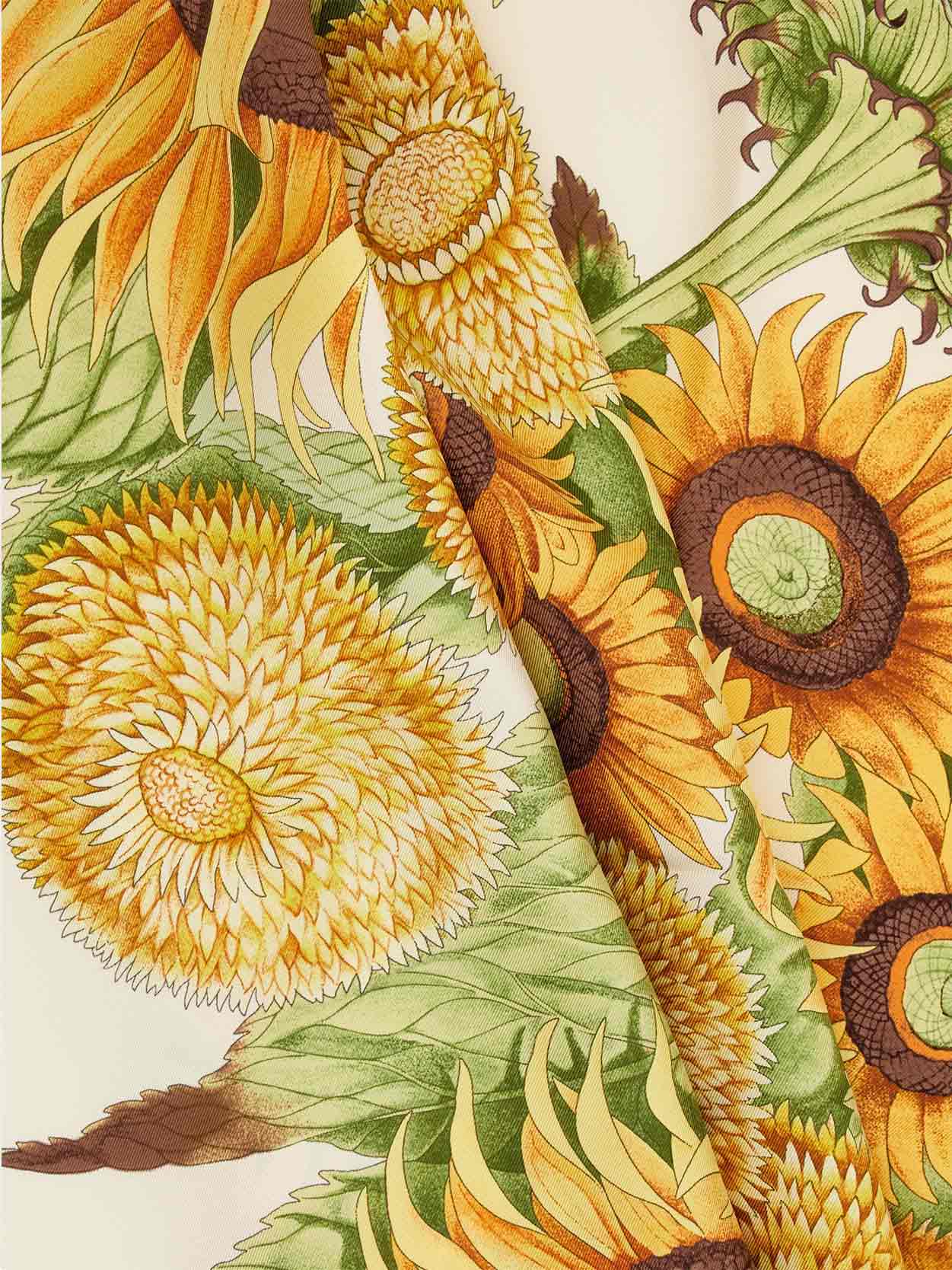 • Inspired by a heritage motif and reimagined with up-to-date shades and details, this pure silk twill scarf is decorated with a luxurious bouquet of sunflowers. A symbol of joy, positivity, strength and loyalty,