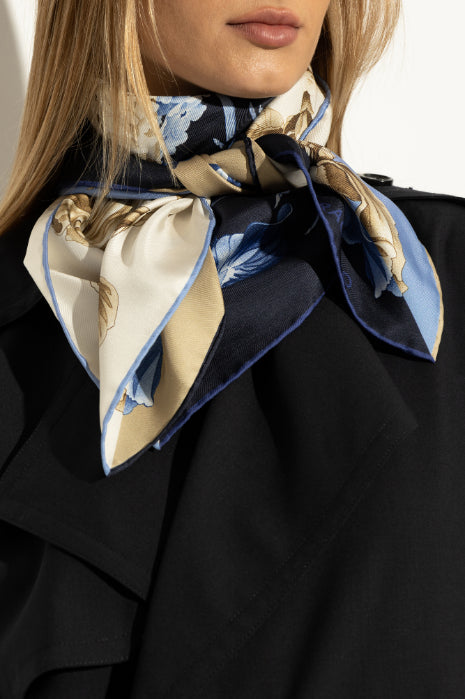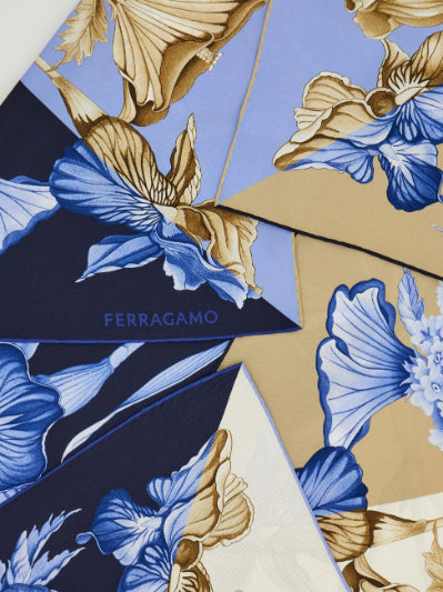 • Introducing a SILK SCARF WITH A FLORAL MOTIF from the renowned brand FERRAGAMO, embodying the essence of luxury and elegance.