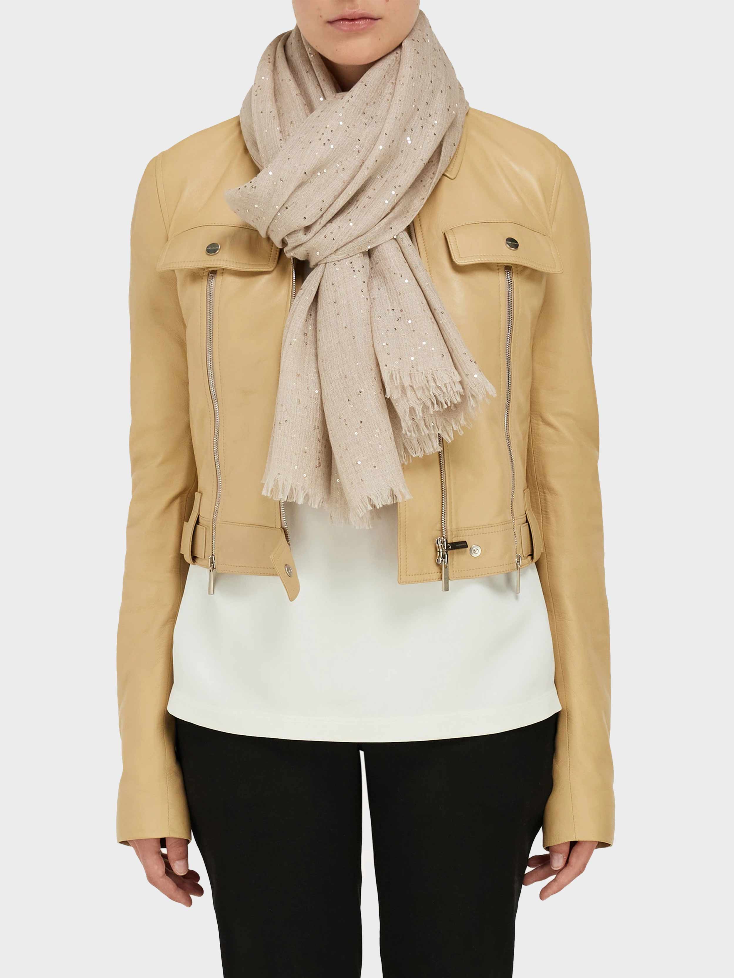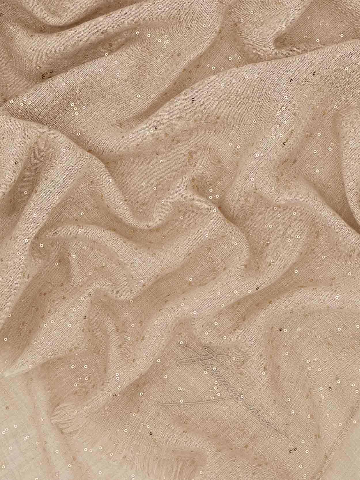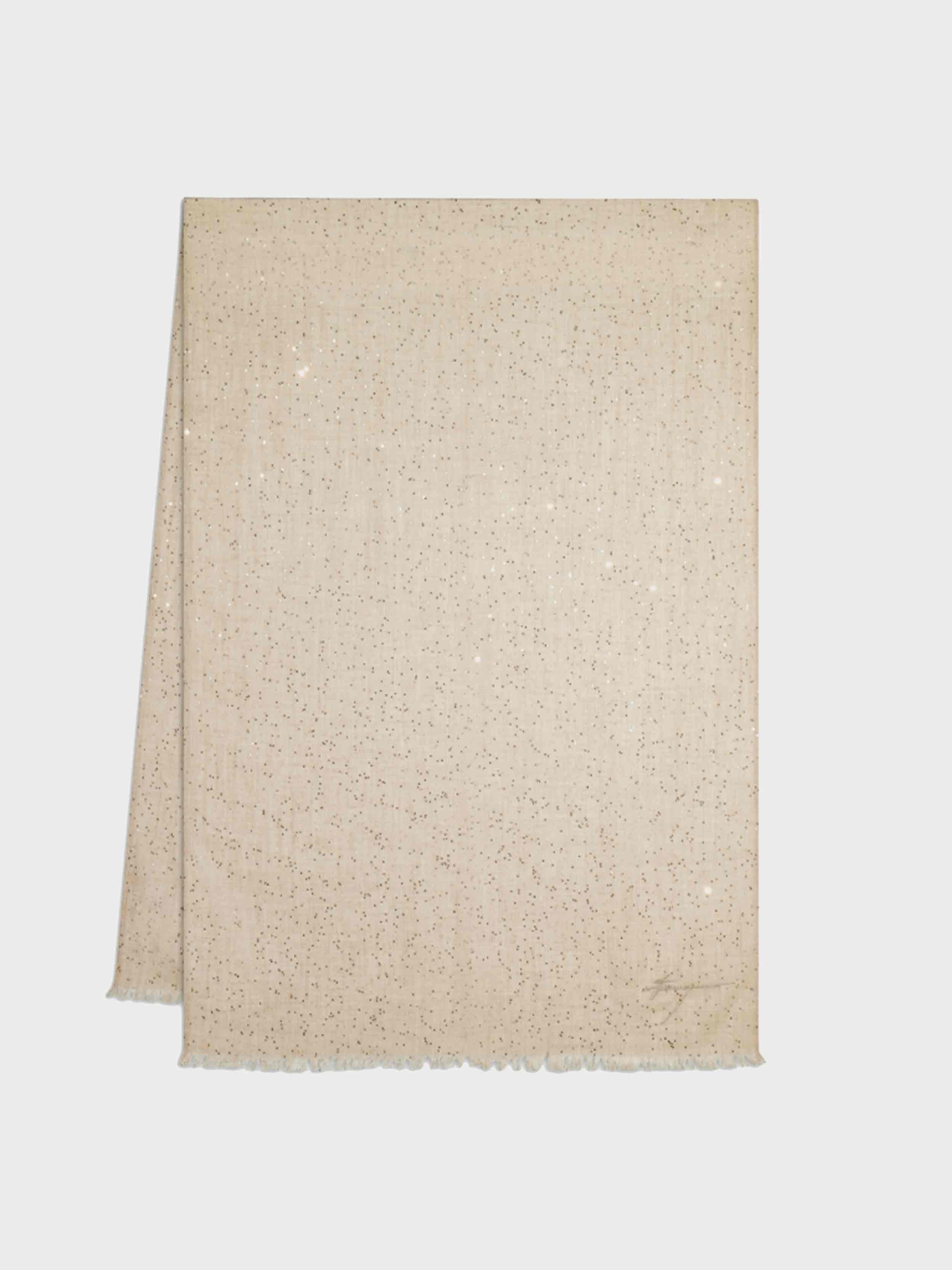 • A shower of light to be worn draped around the neck, over the shoulders, or lying on the side: the new cashmere and silk stole is decorated with micro sequins embedded in the fabric, which maintains a surprising softness to the touch.
