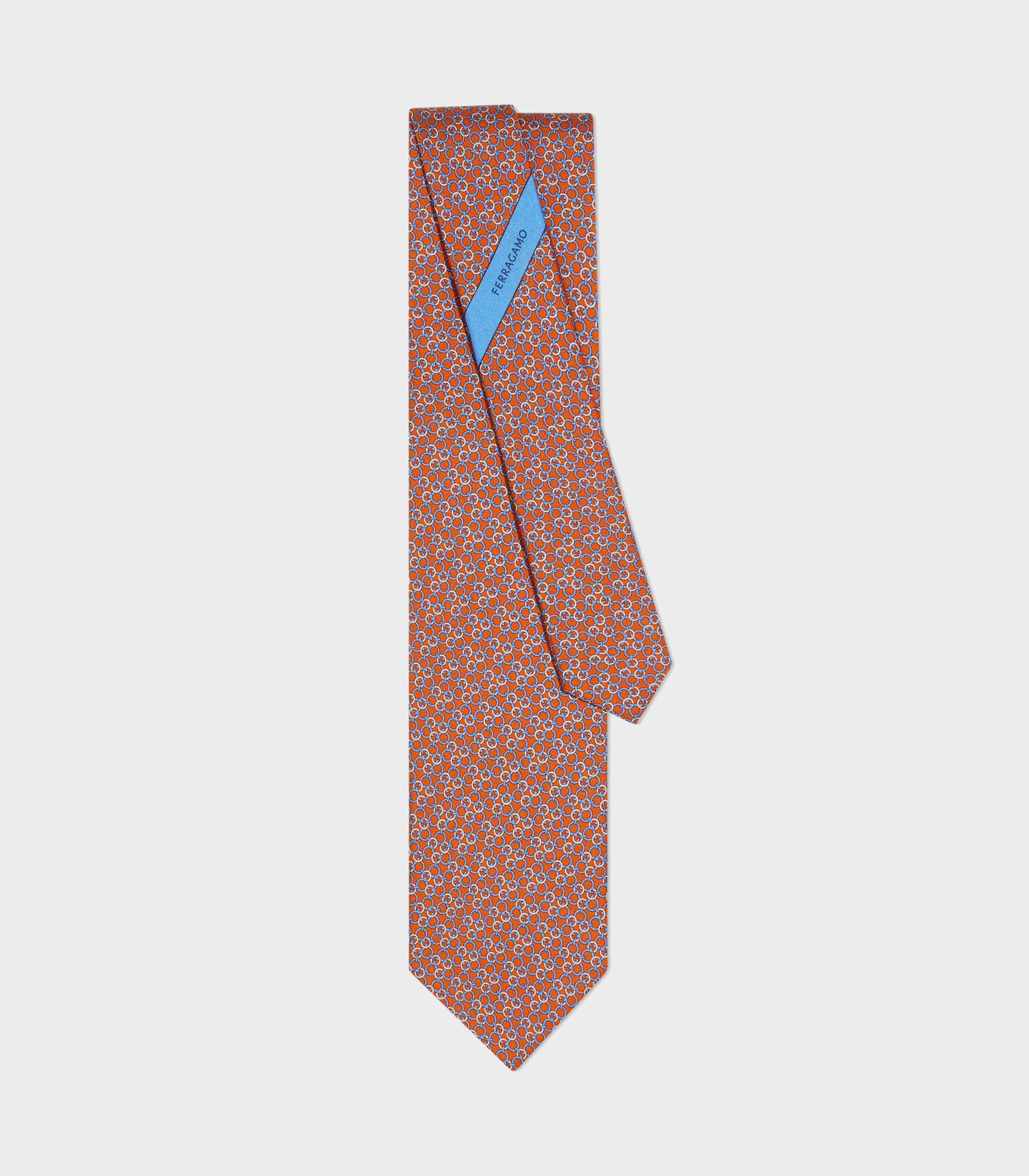 • Interwoven Gancini in a playful arrangement of irregular shapes create the motif that decorates this pure silk tie.