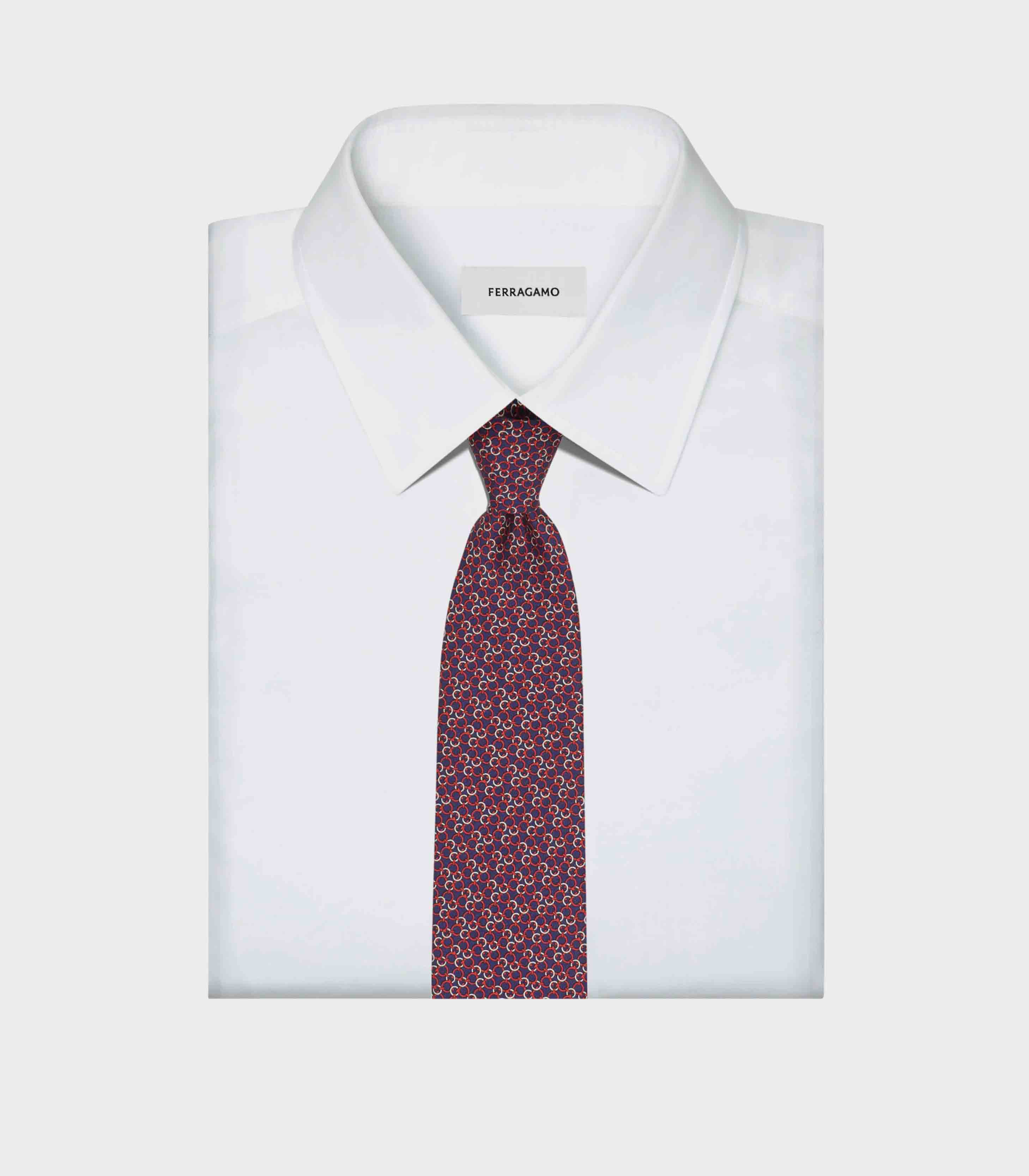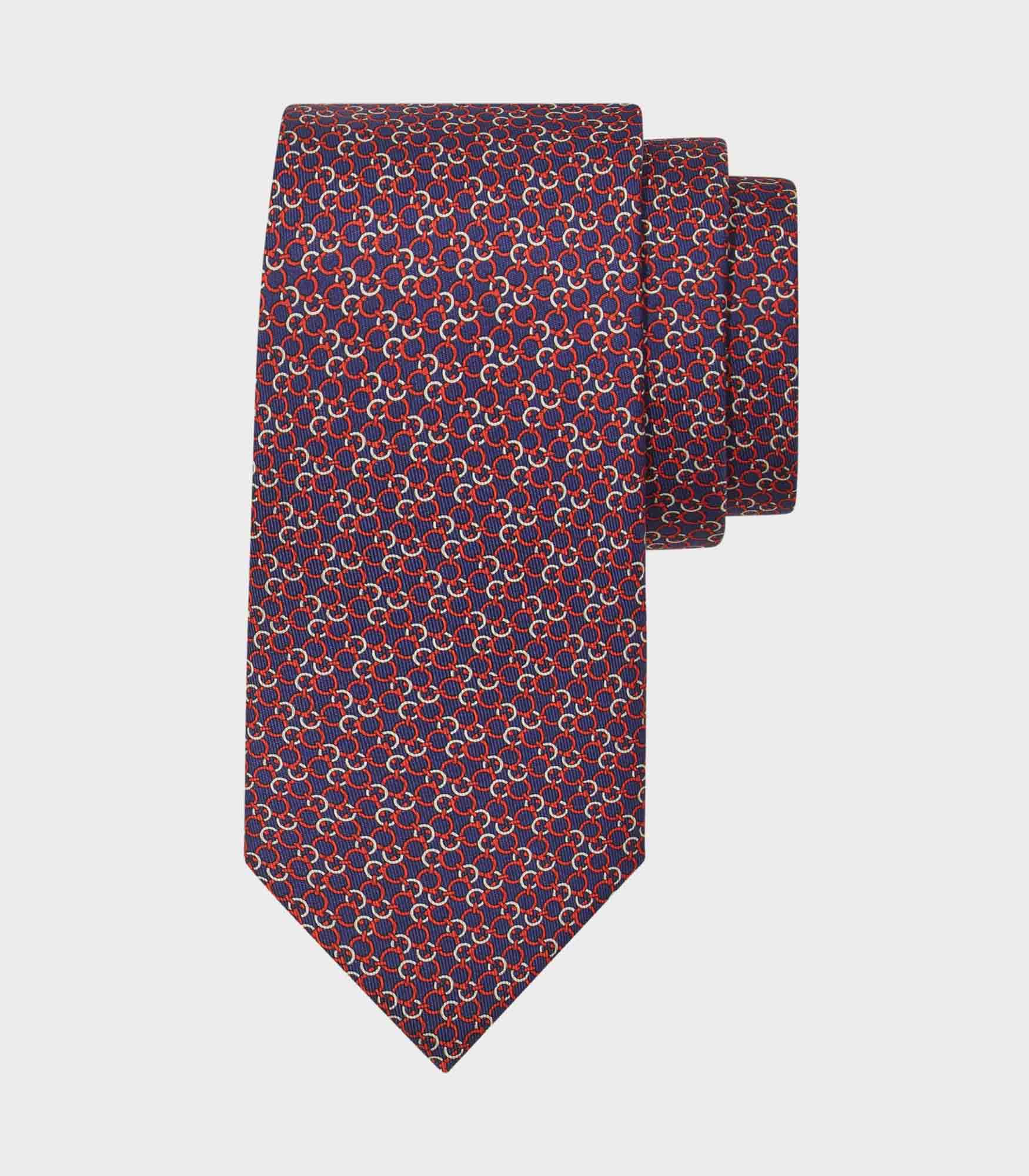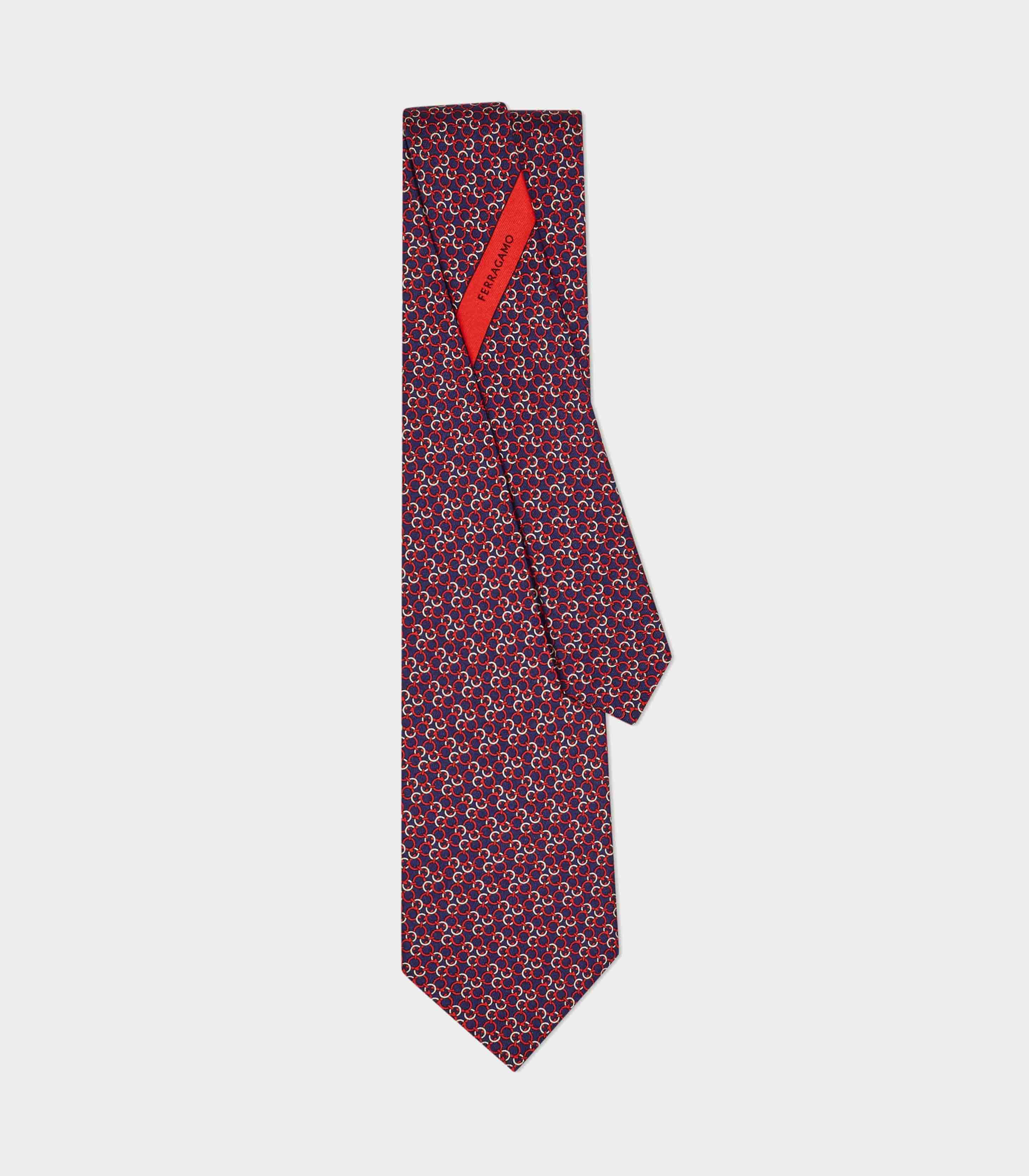 • Interwoven Gancini in a playful arrangement of irregular shapes create the motif that decorates this pure silk tie.