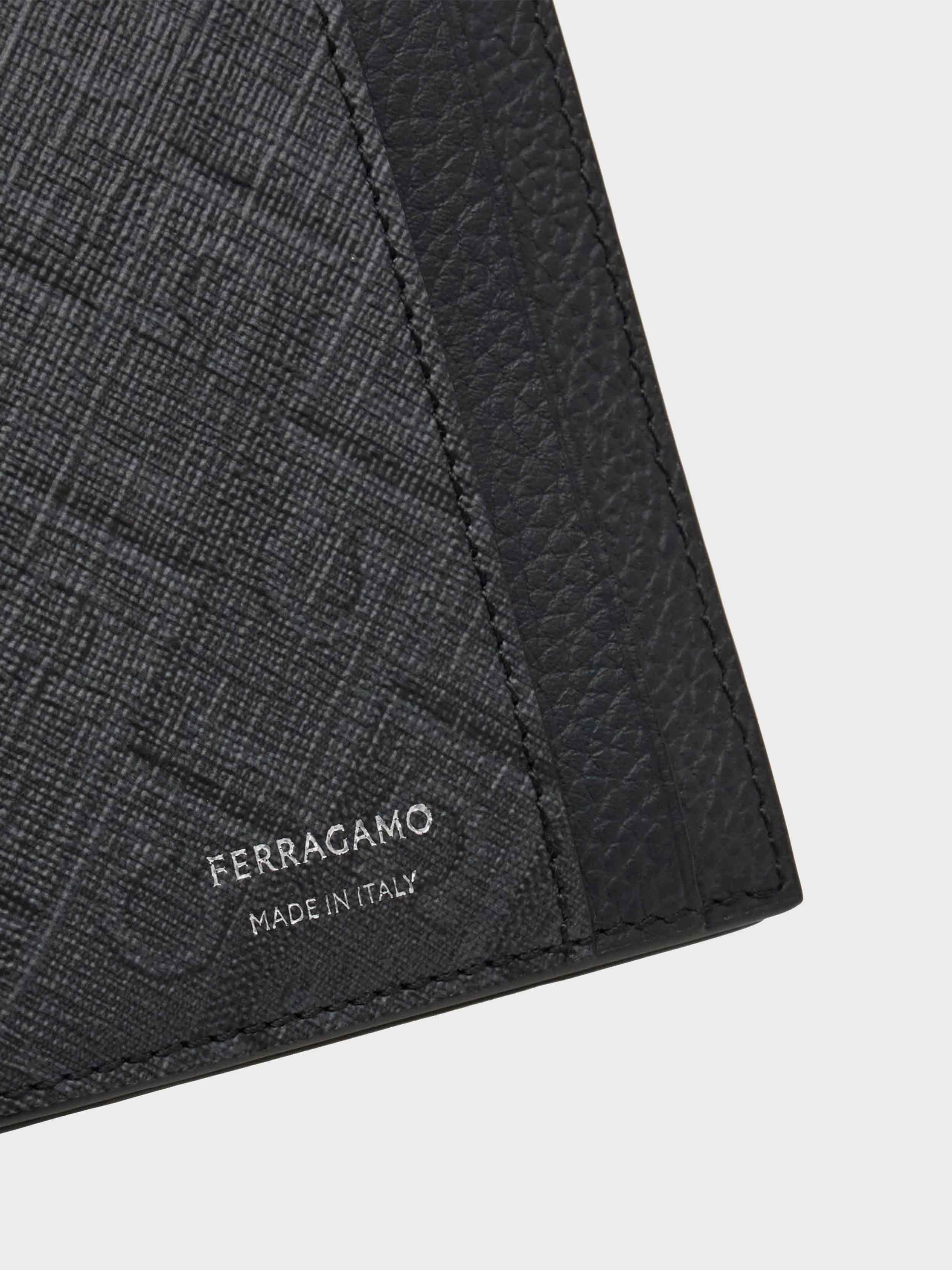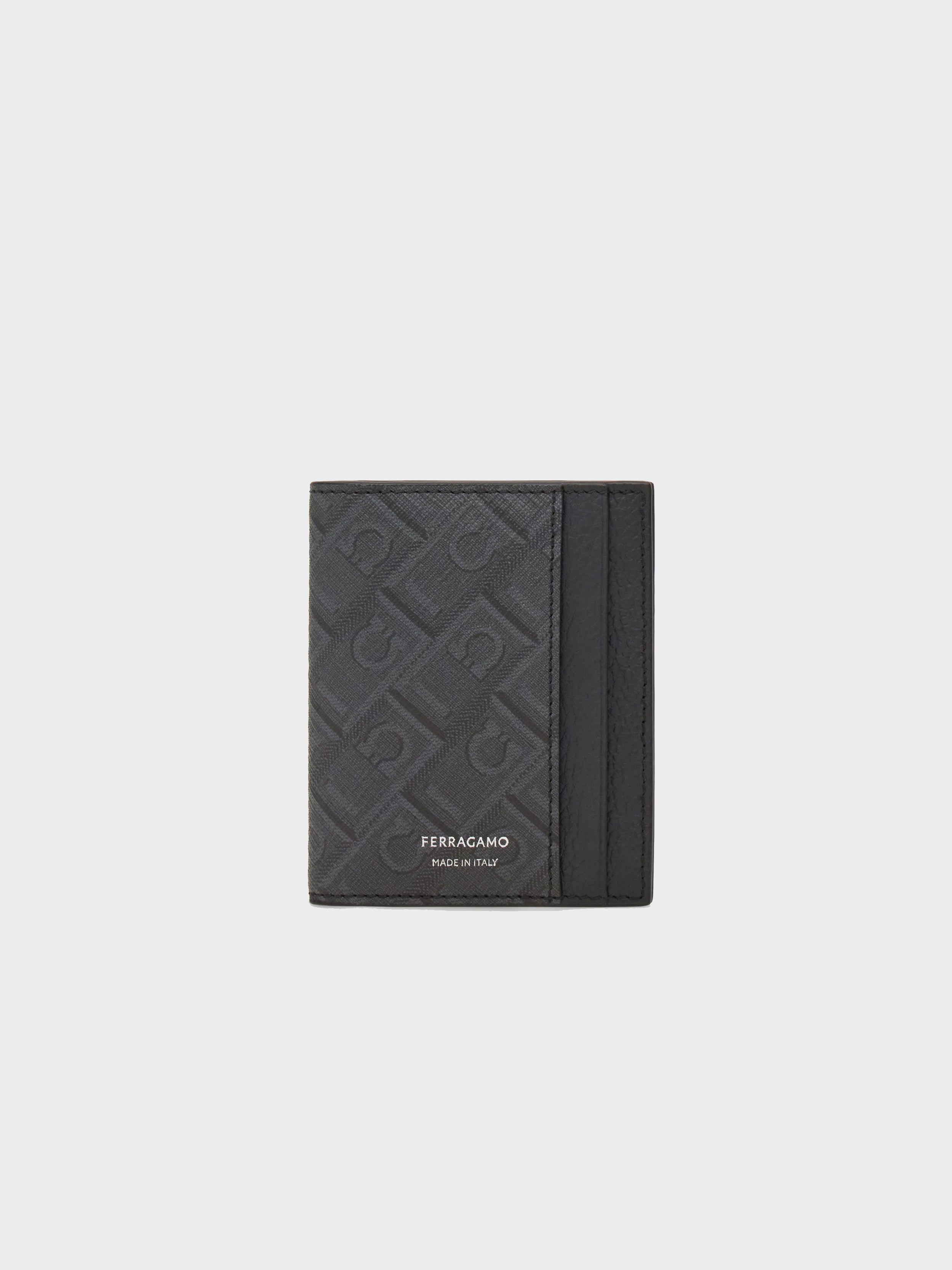 • New credit card holder with book-like construction, hammered calfskin interior and coated fabric exterior with Ferragamo monogram print. The structure with multiple internal slots ensures capacity and functionality.