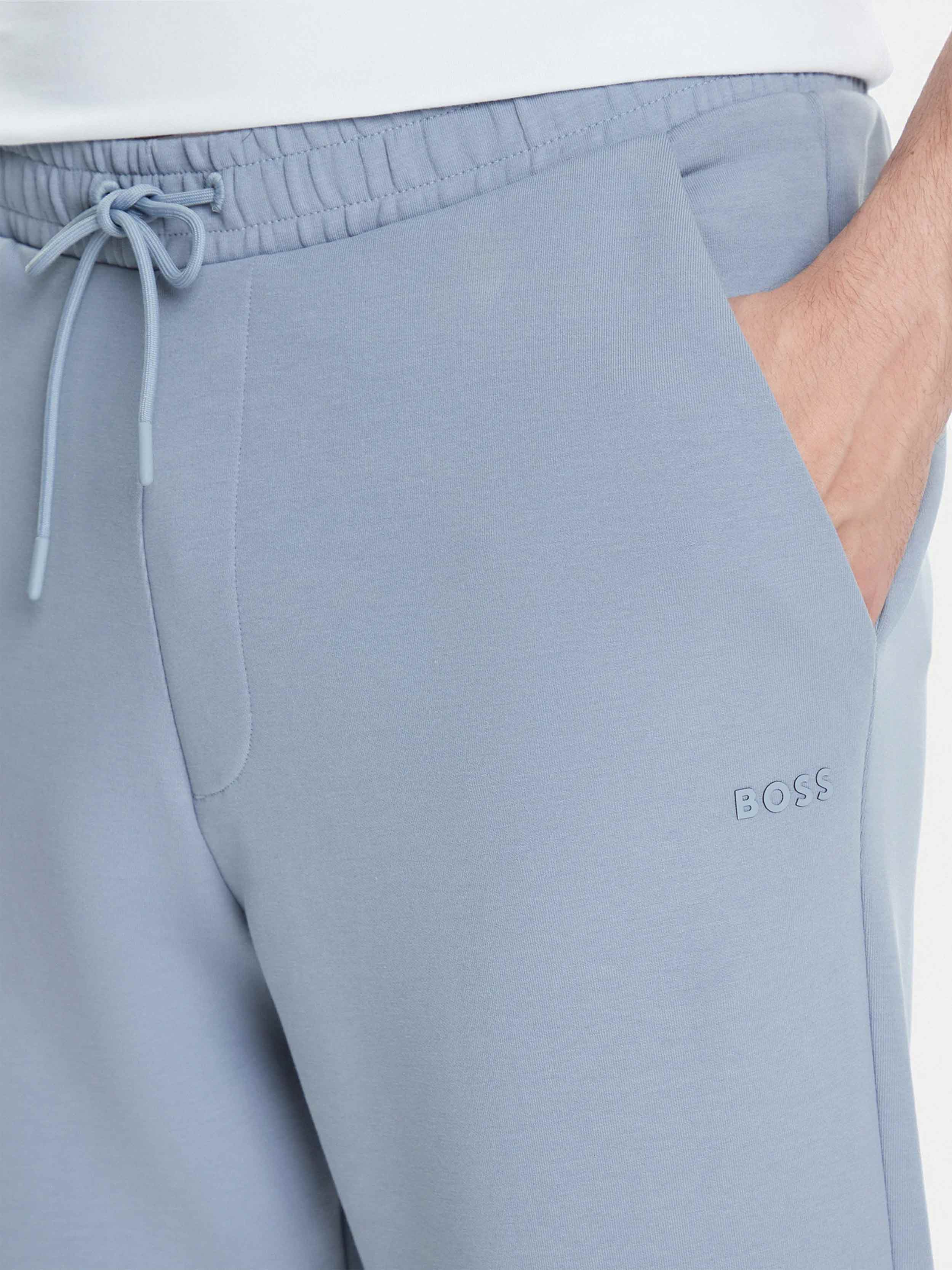 • In comfortable stretch cotton with cuffed hems, these regular-fit BOSS Menswear tracksuit bottoms will become your daily favourite. Sandwich-print BOSS logo.